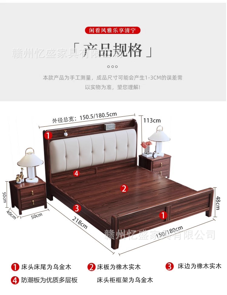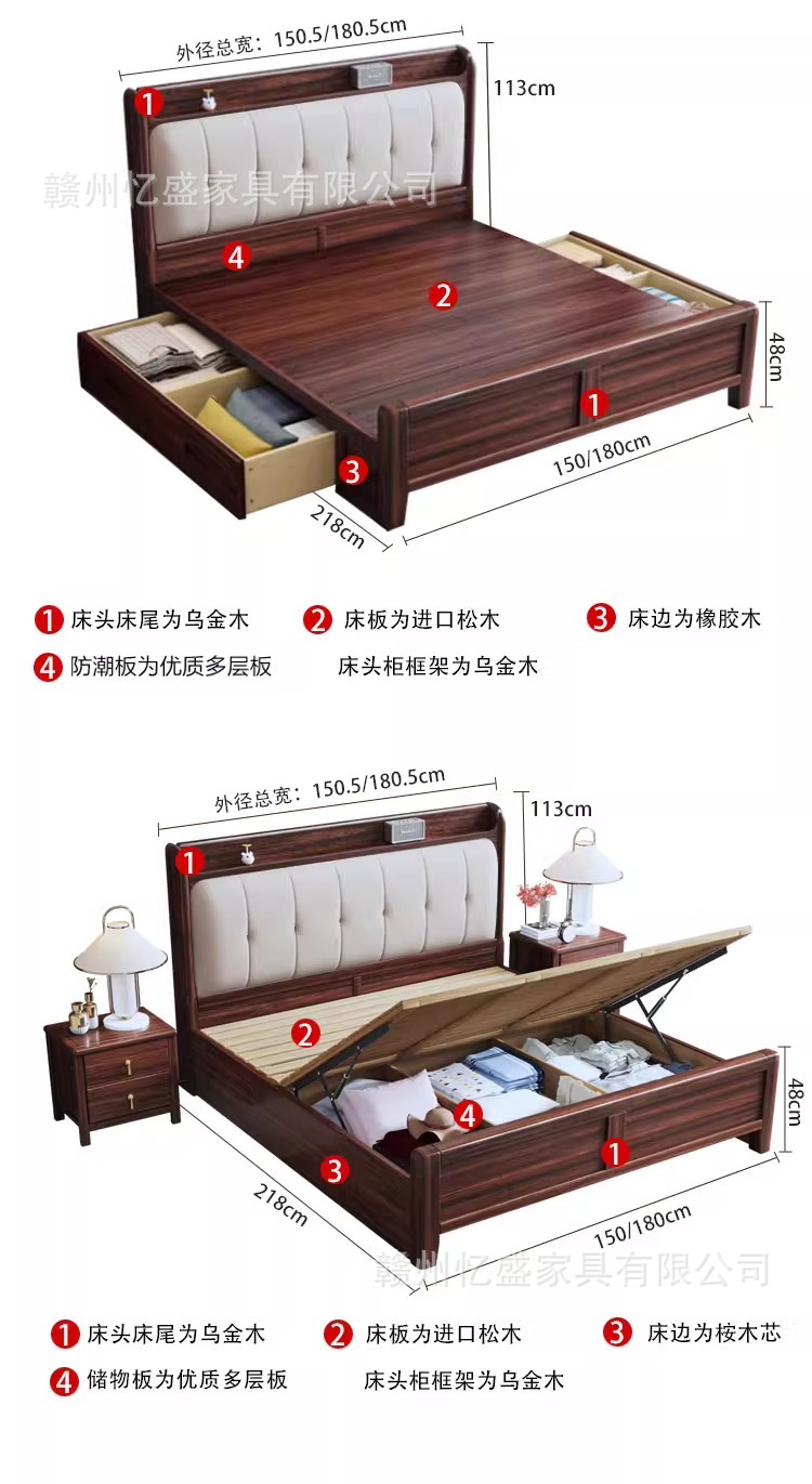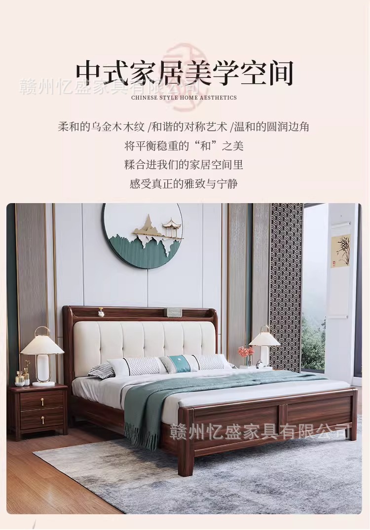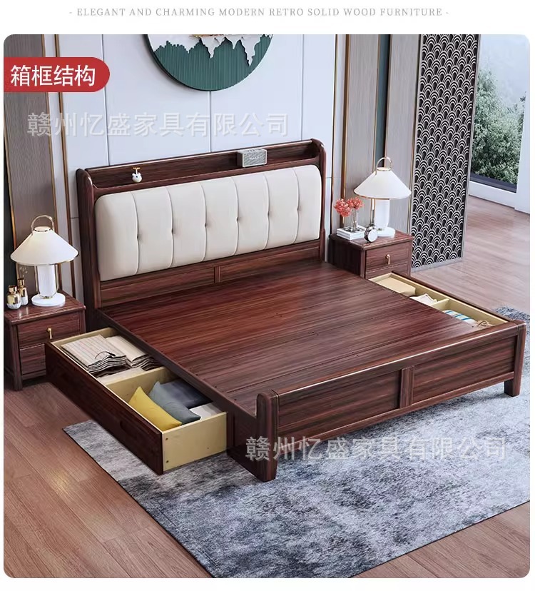 새로운 중국 스타일 검은 골드 우드 솔리드 우드 침대 1.8m 더블 침대 라이트 럭셔리 현대 미니멀리스트 마스터 침실 소프트 등받이 1.5m 수납 침대