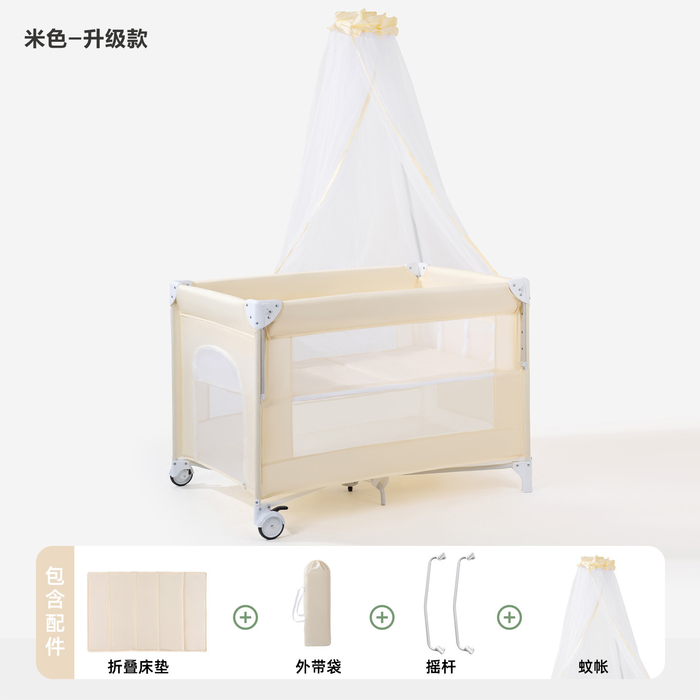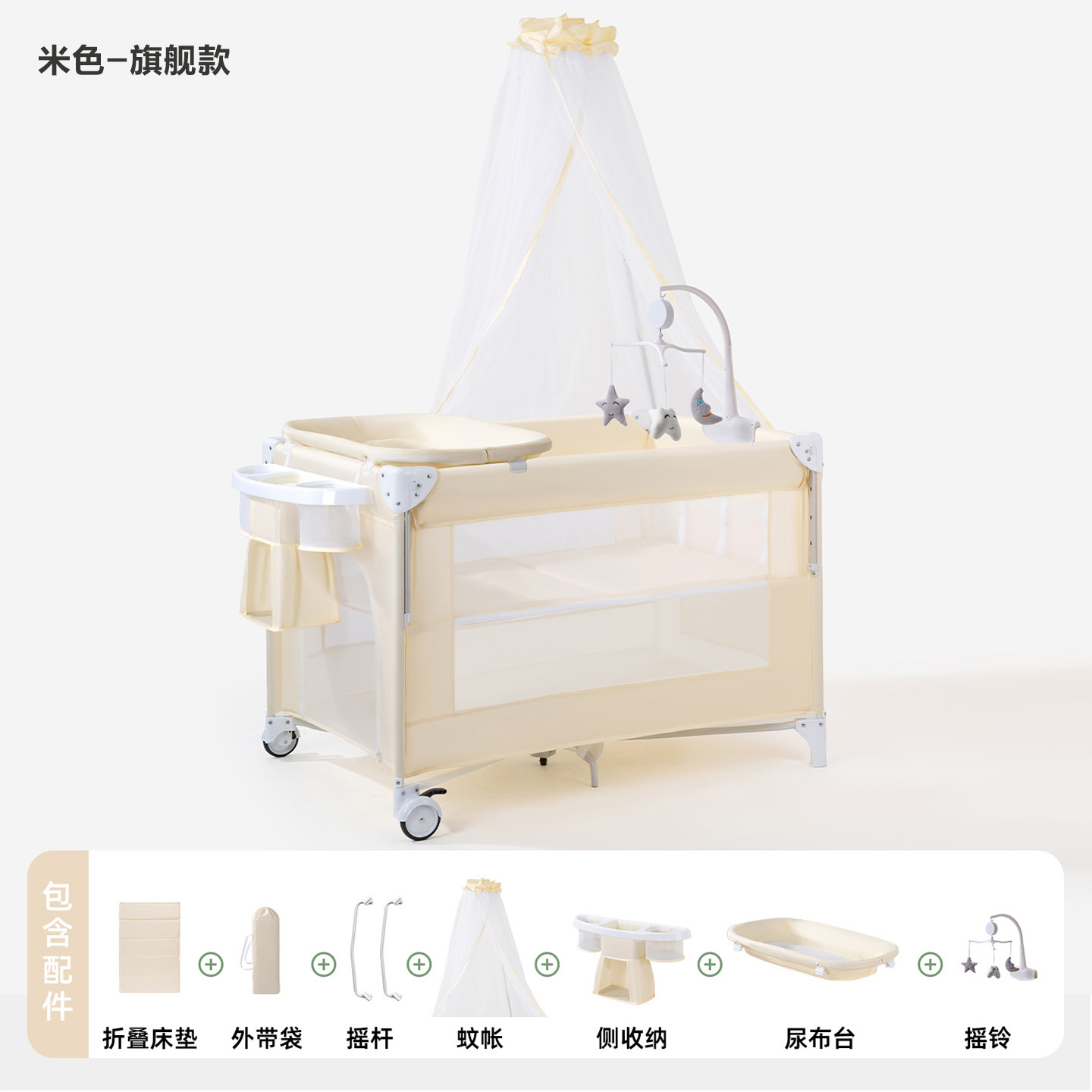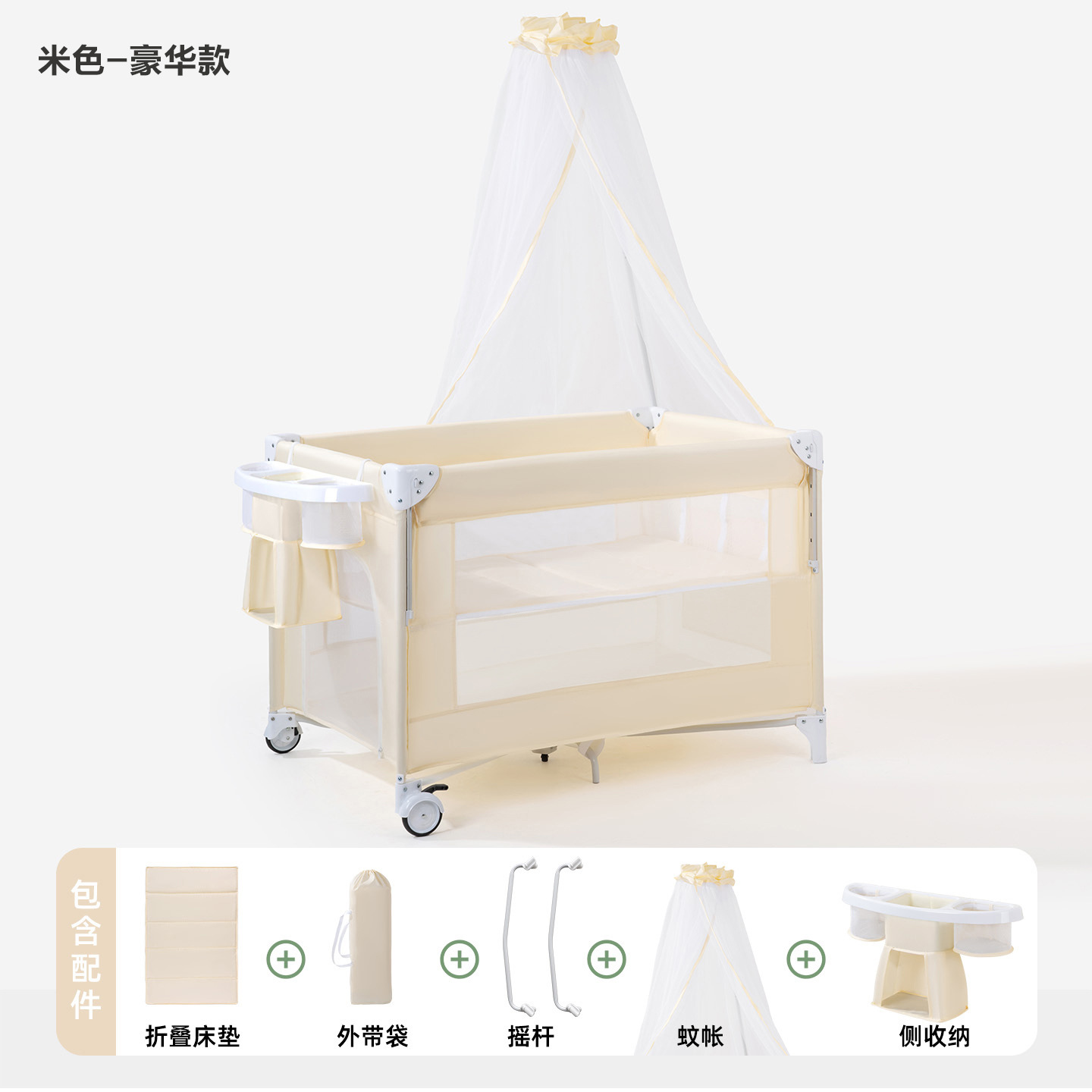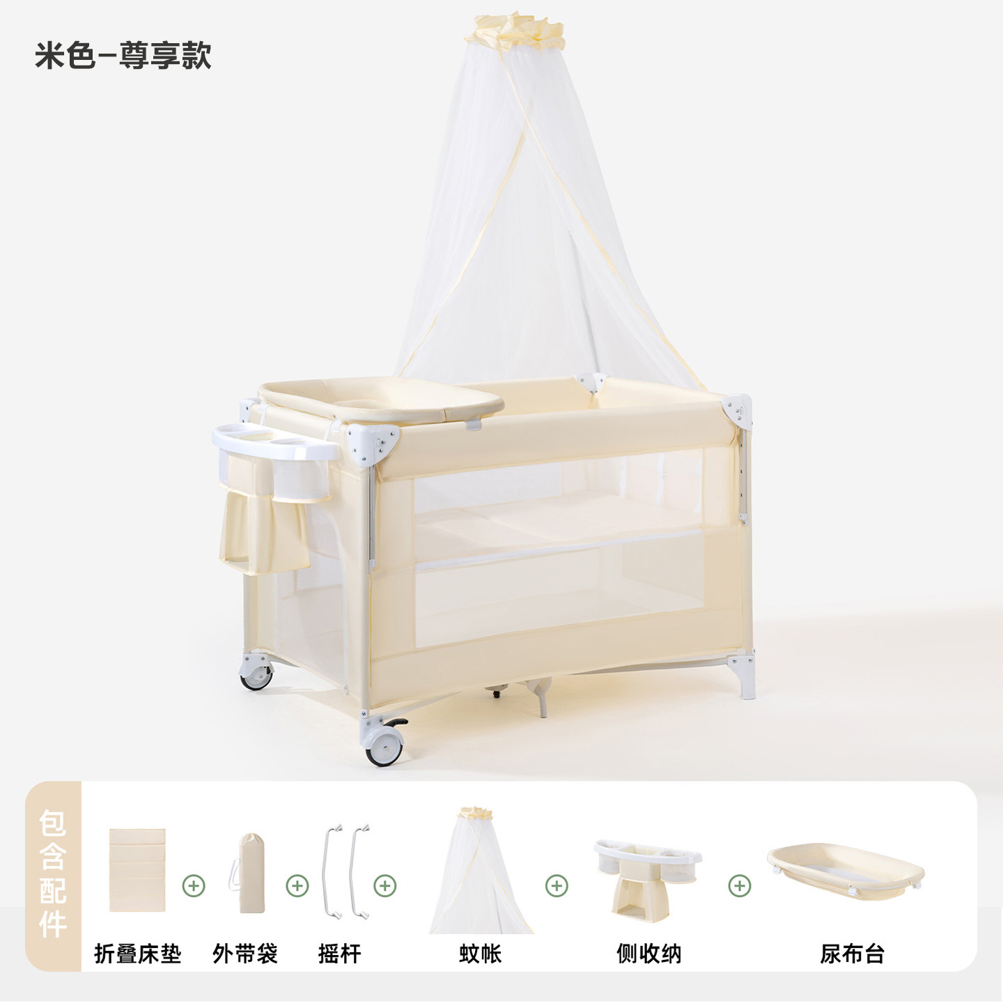 • 게임침대-베이지-5종세트 [모기장+흔들침대봉+측면수납포켓+기저귀교환대+침대벨] (CYT5)