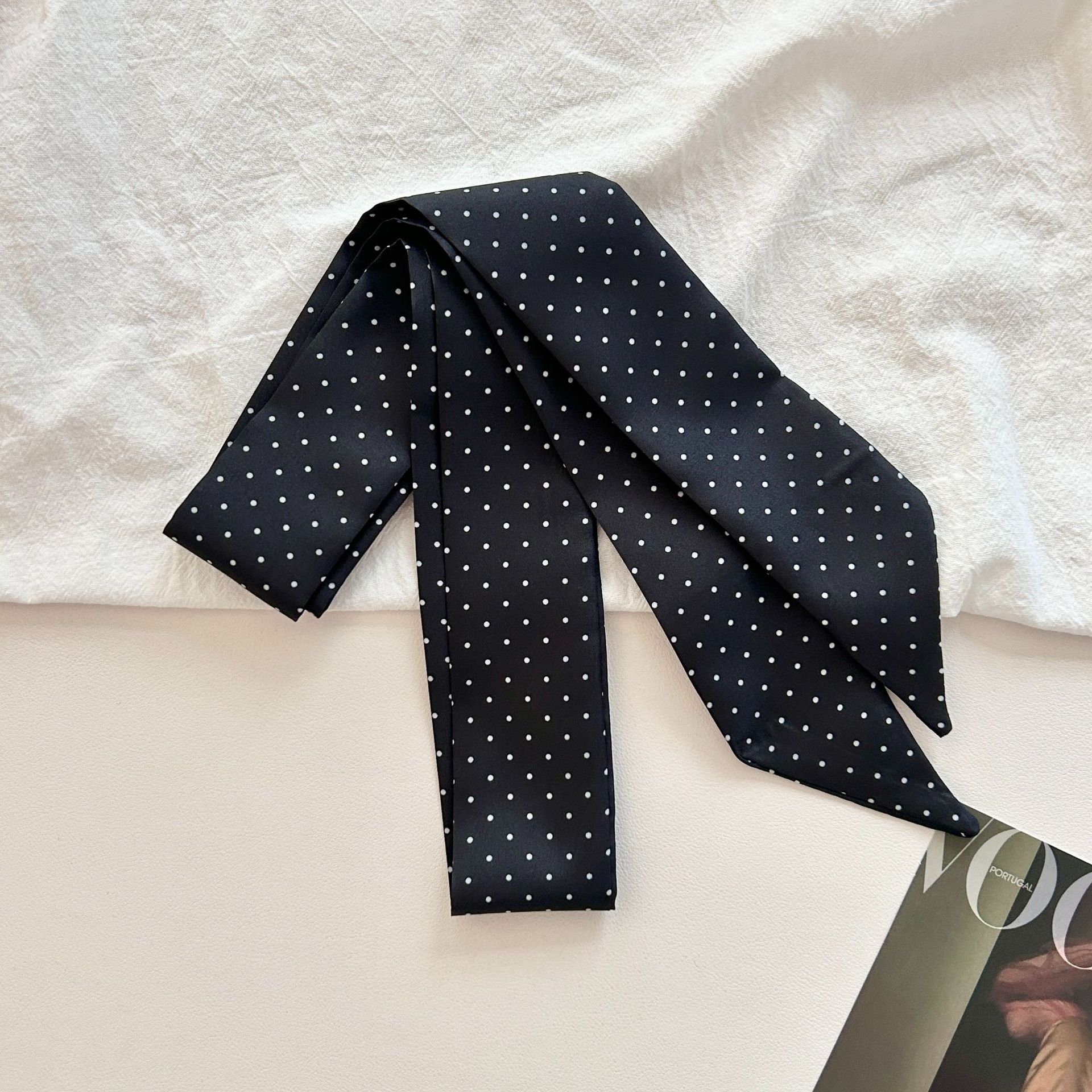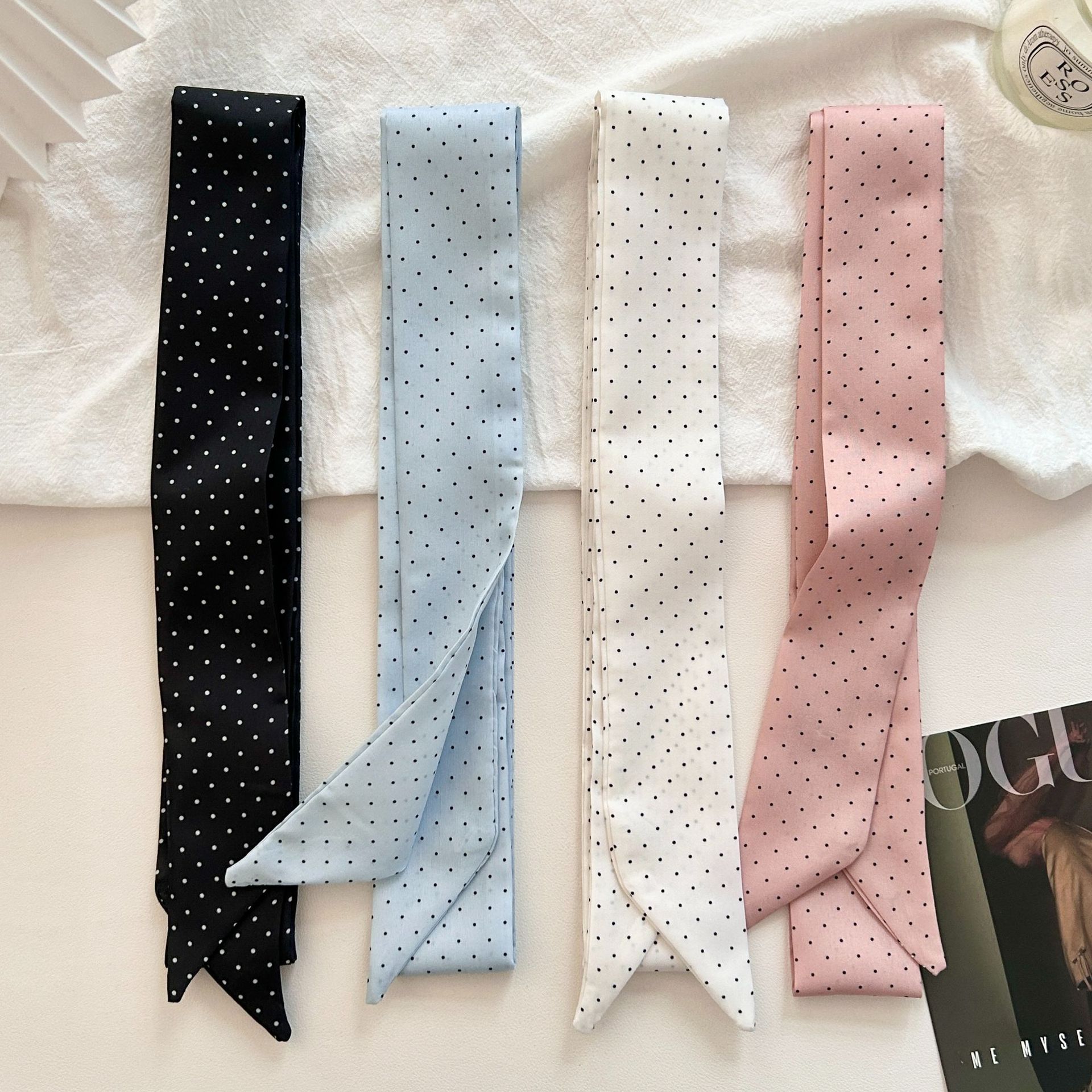 한국 봄 여름 신작 도트 무늬 스카프, 분위기 있는 핑크색 긴 스트립 넥 스카프, 부드러운 머리끈과 작은 리본