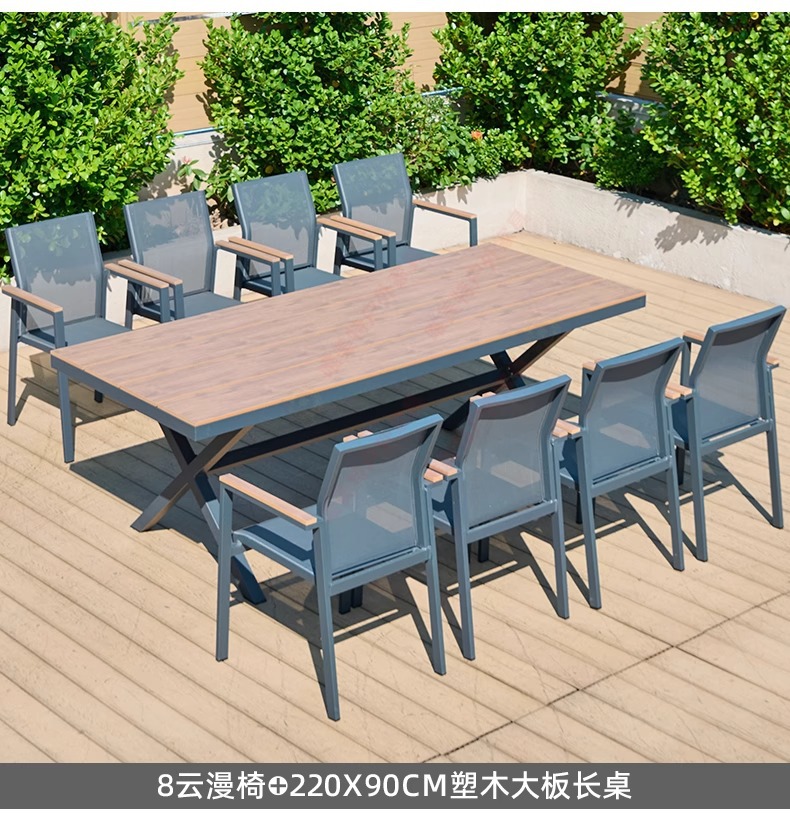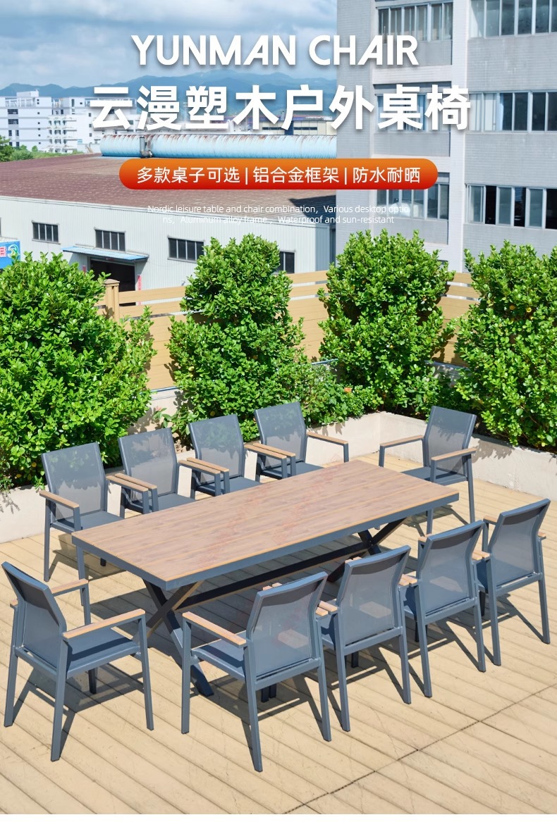 • 플라스틱 나무 팔걸이가 있는 Yunman 의자 10개 + 220X90cm 플라스틱 나무 대형 보드 긴 테이블