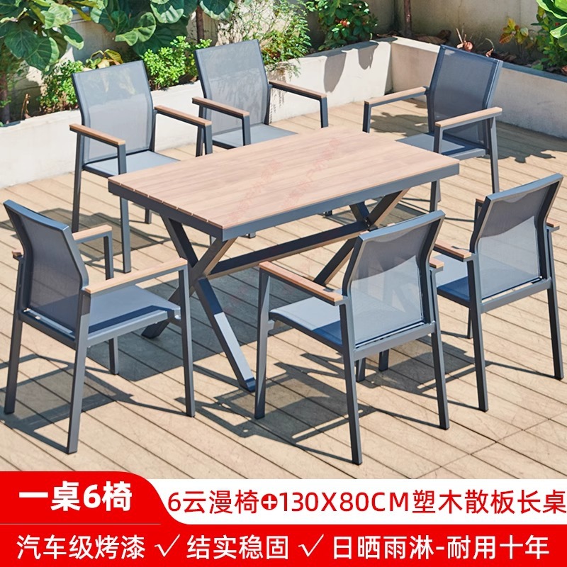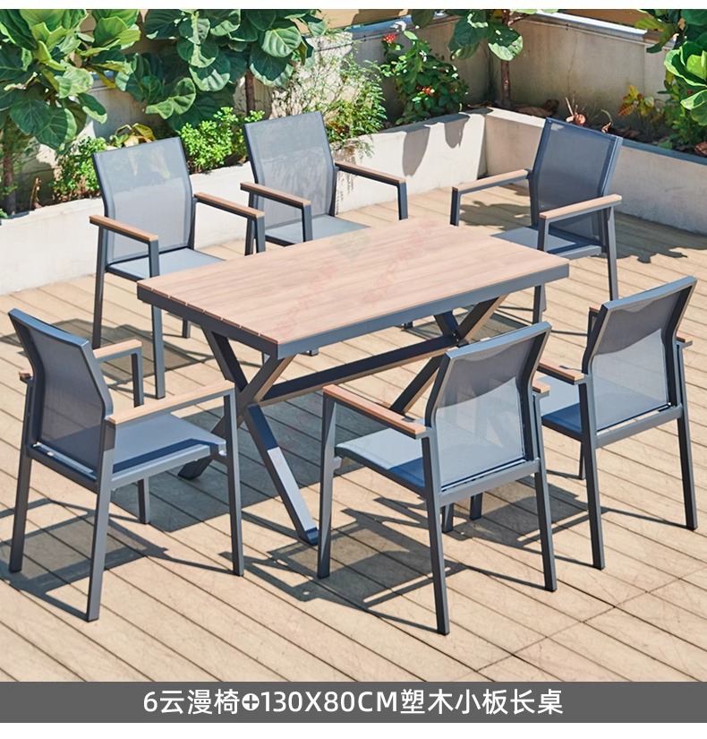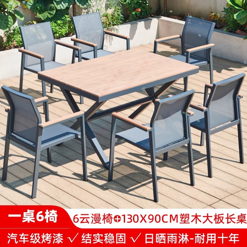 • 플라스틱 나무 팔걸이가 있는 Yunman 의자 6개 + 130X90cm 플라스틱 나무 대형 보드 긴 테이블