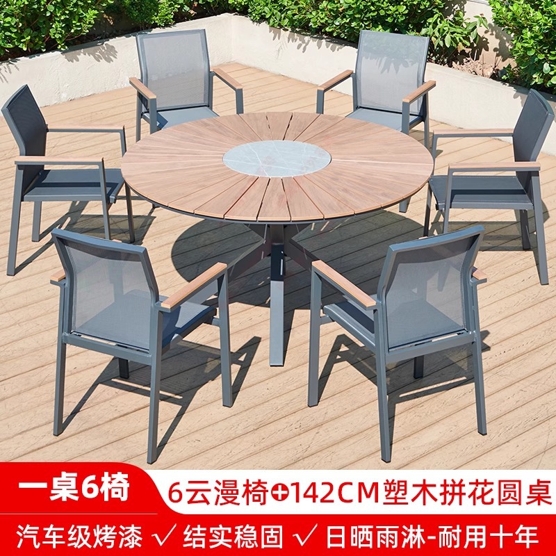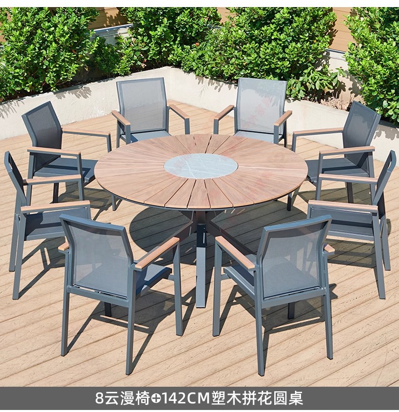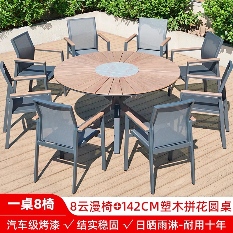 • 플라스틱 나무 팔걸이가 있는 구름 의자 8개 + 플라스틱 나무 쪽모이 세공이 있는 142cm 원형 테이블