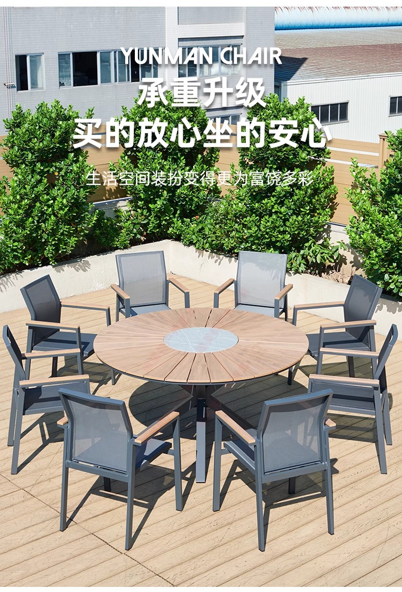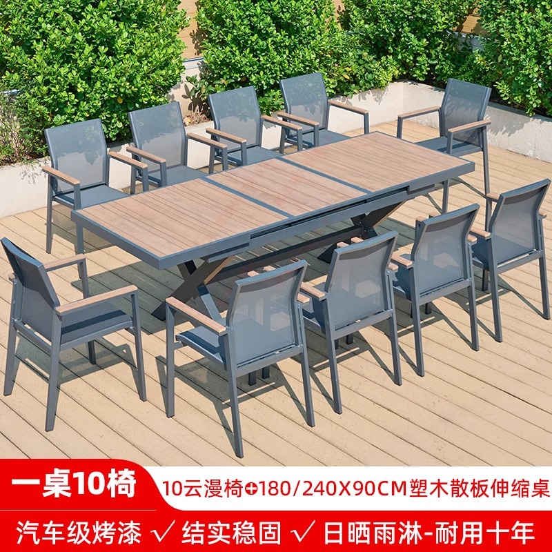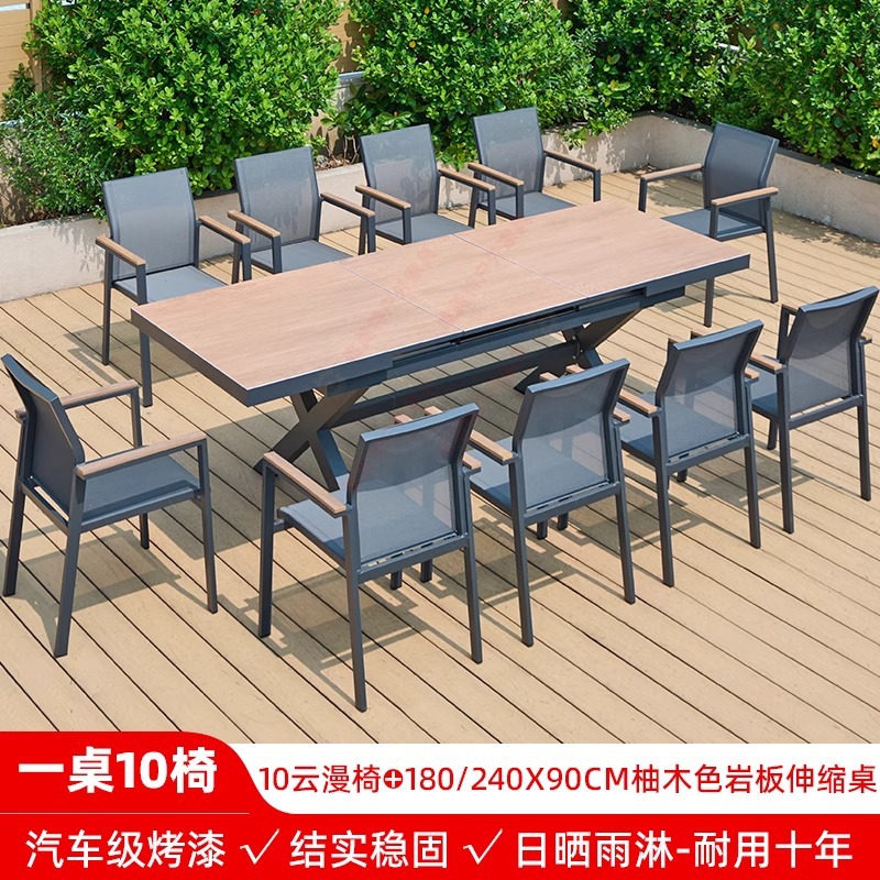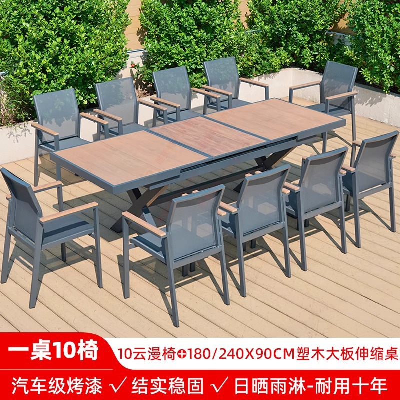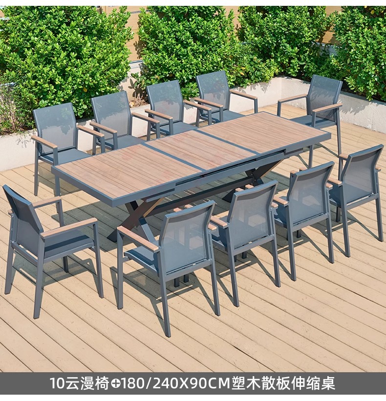 • 플라스틱 목재 팔걸이가 있는 Yunman 의자 10개 + 티크 색상 슬레이트 텔레스코픽 테이블 180-240X90cm