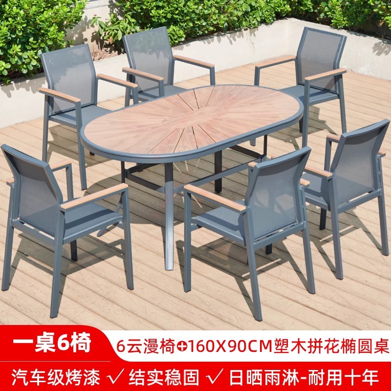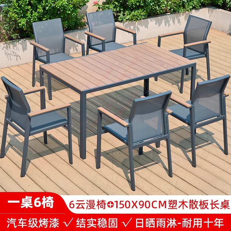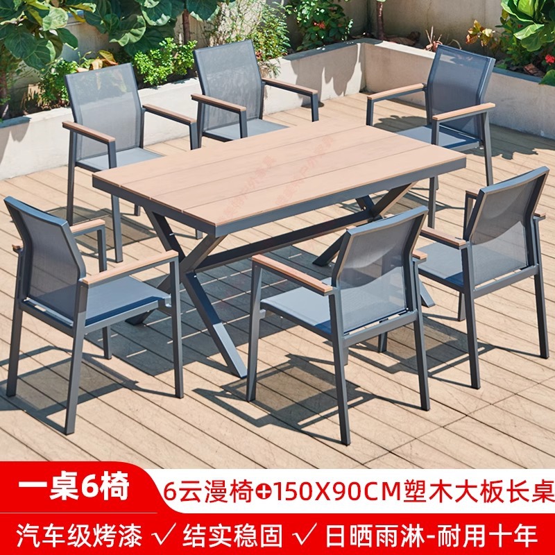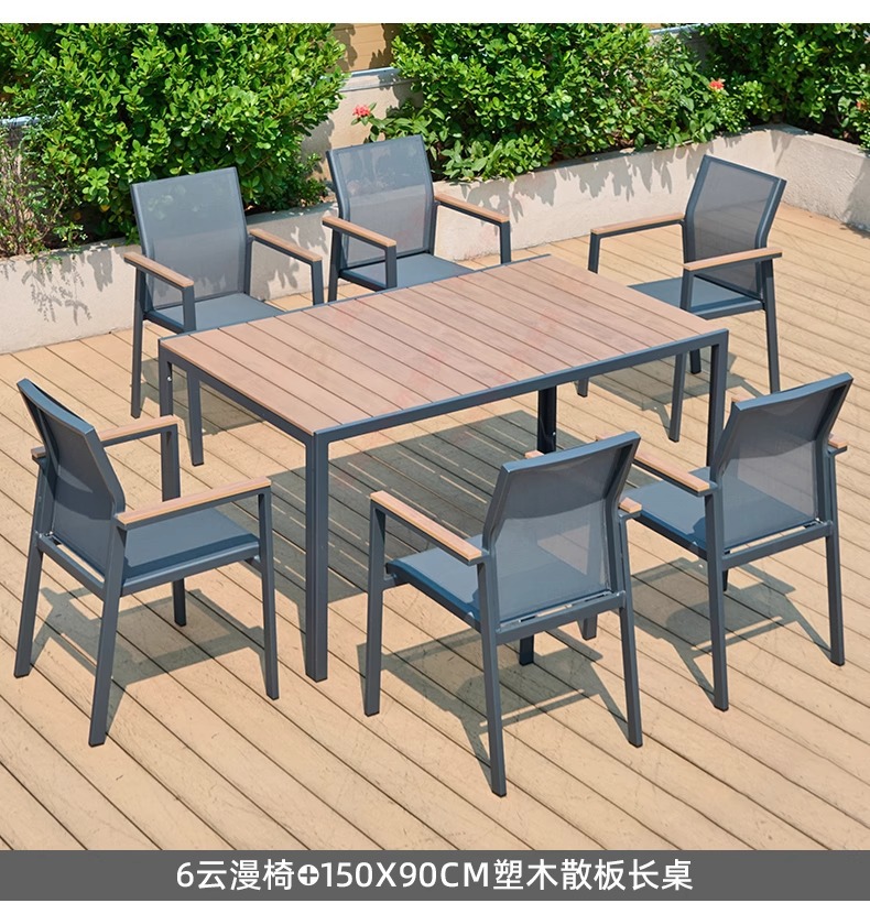 • 플라스틱 나무 팔걸이가 있는 Yunman 의자 6개 + 150X90cm 플라스틱 나무 대형 보드 긴 테이블