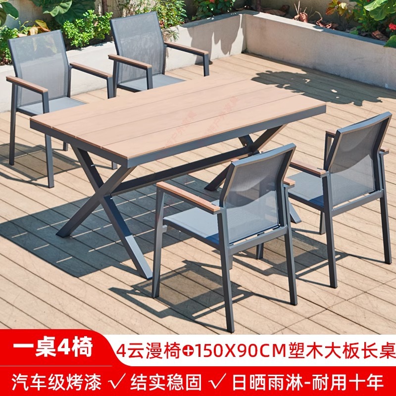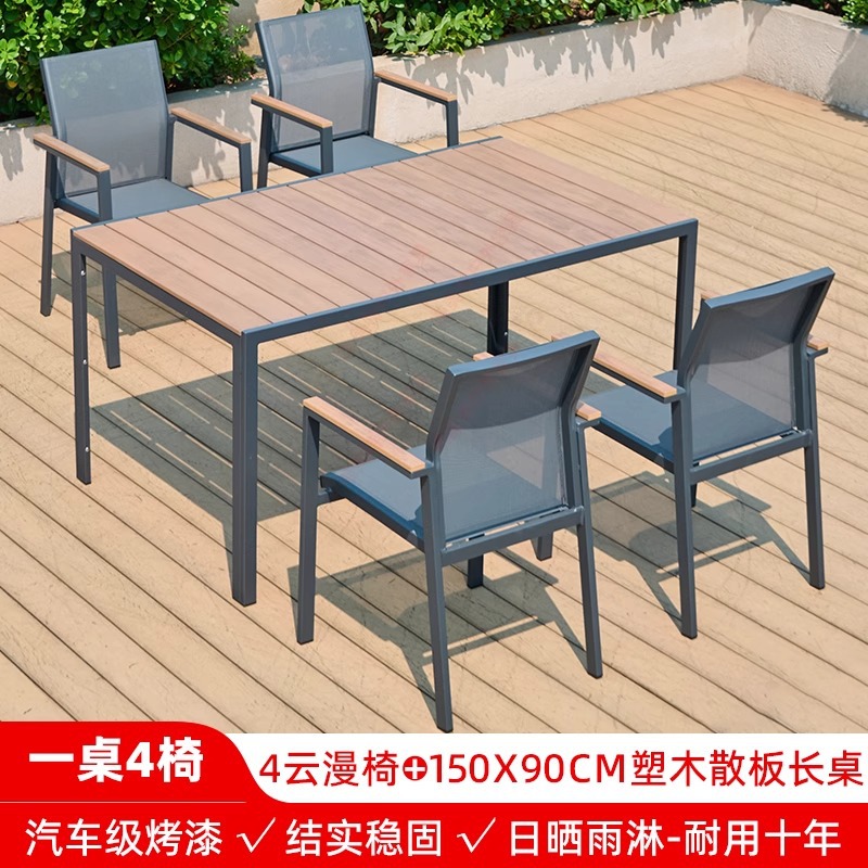 • 플라스틱 나무 팔걸이가 있는 Yunman 의자 4개 + 150X90cm 플라스틱 나무 대형 보드 긴 테이블
