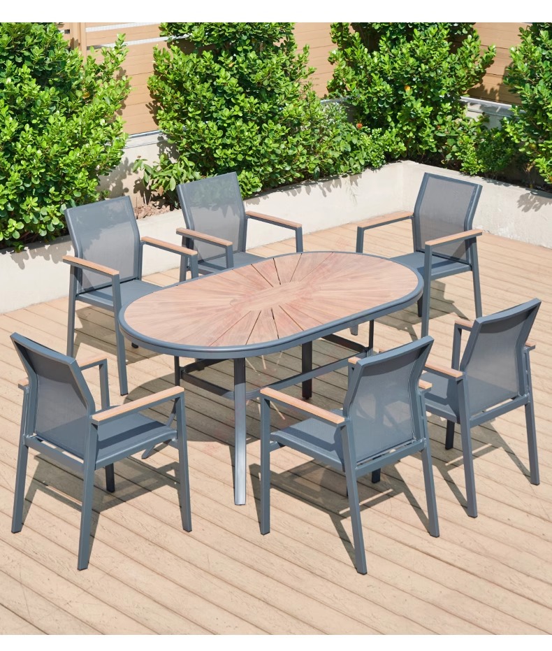 • 플라스틱 목재 팔걸이가 있는 Yunman 의자 6개 + 티크 색상 슬레이트 텔레스코픽 테이블 180-240X90cm
