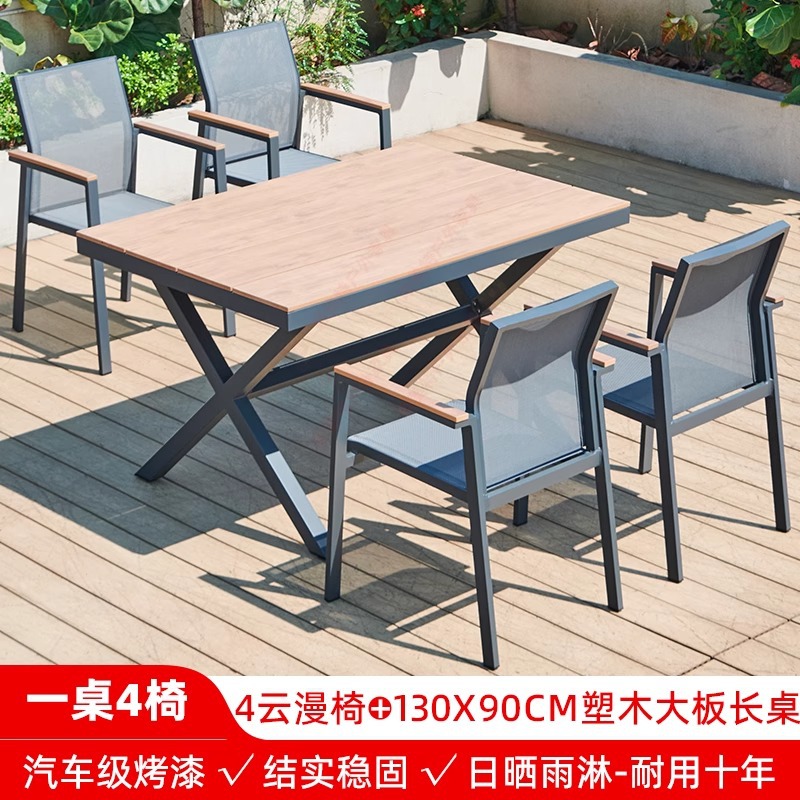 • 플라스틱 나무 팔걸이가 있는 Yunman 의자 4개 + 130X90cm 플라스틱 나무 대형 보드 긴 테이블