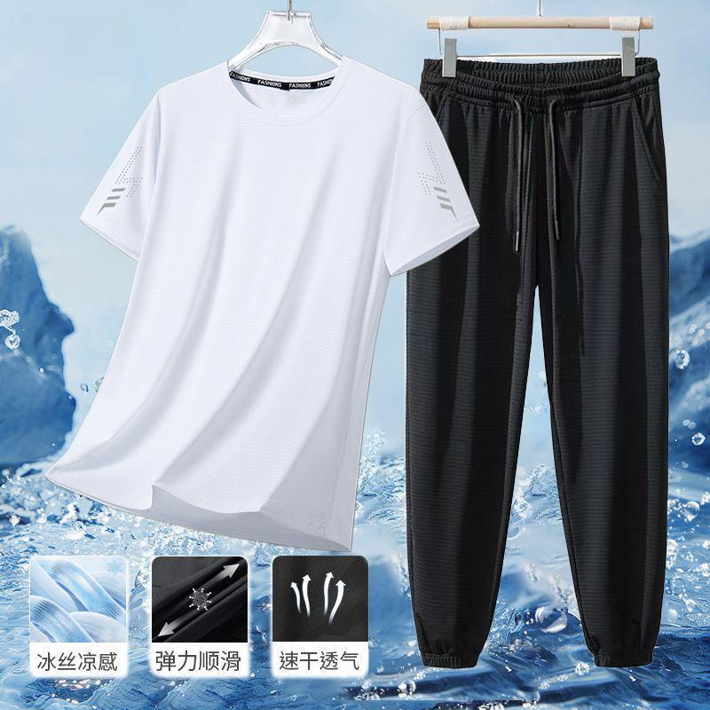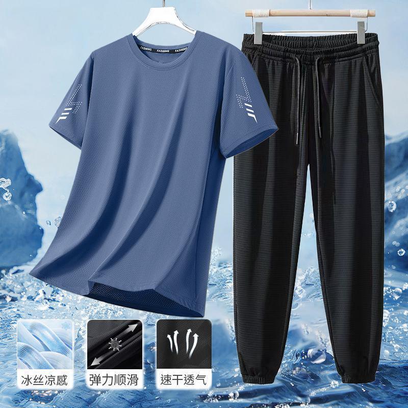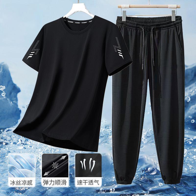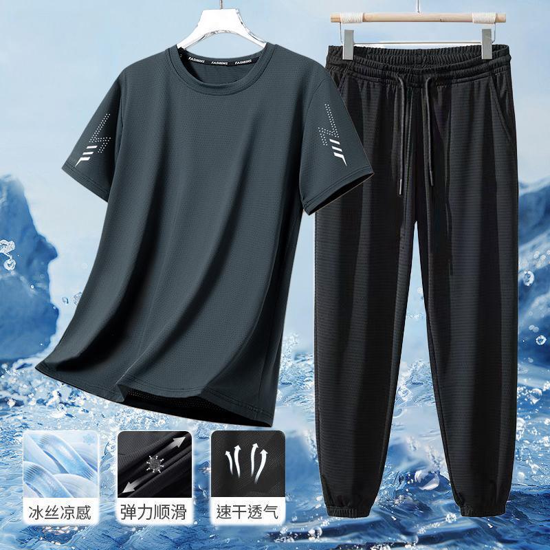 남성 플러스 사이즈 스포츠 정장 남성 여름 얼음 실크 통기성 탄성 반팔 바지 2025 새로운 캐주얼 투피스 세트스토어 가기