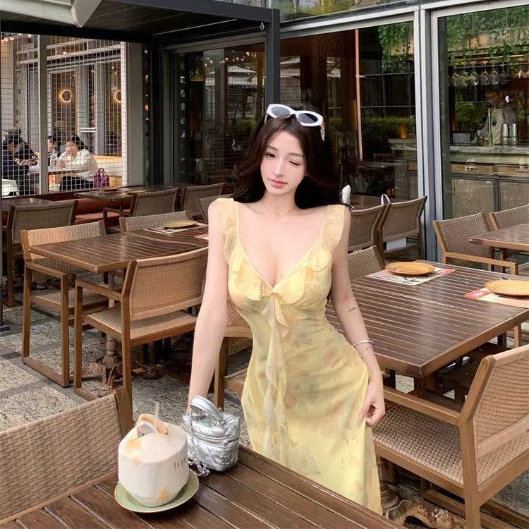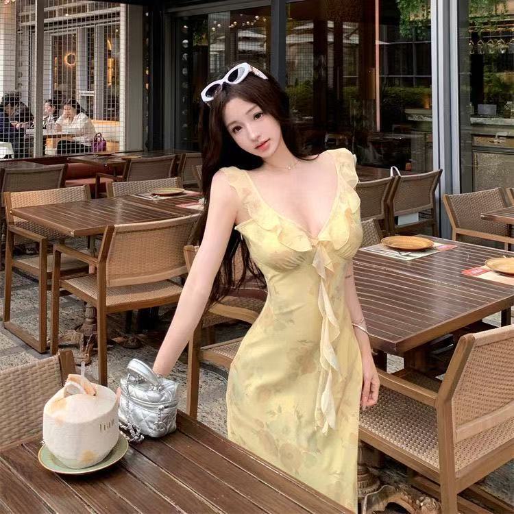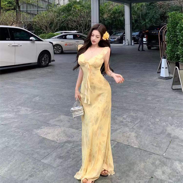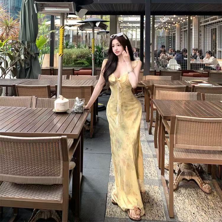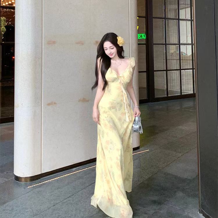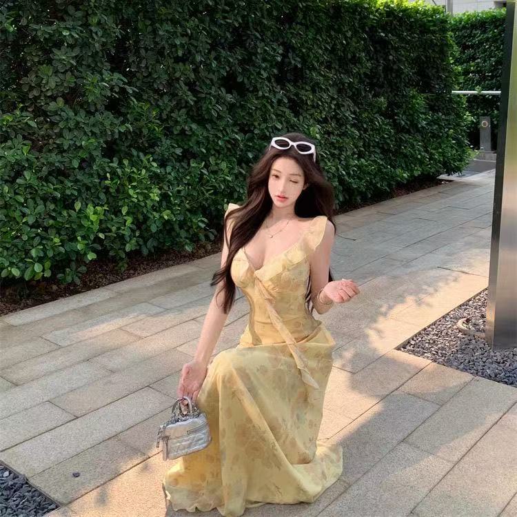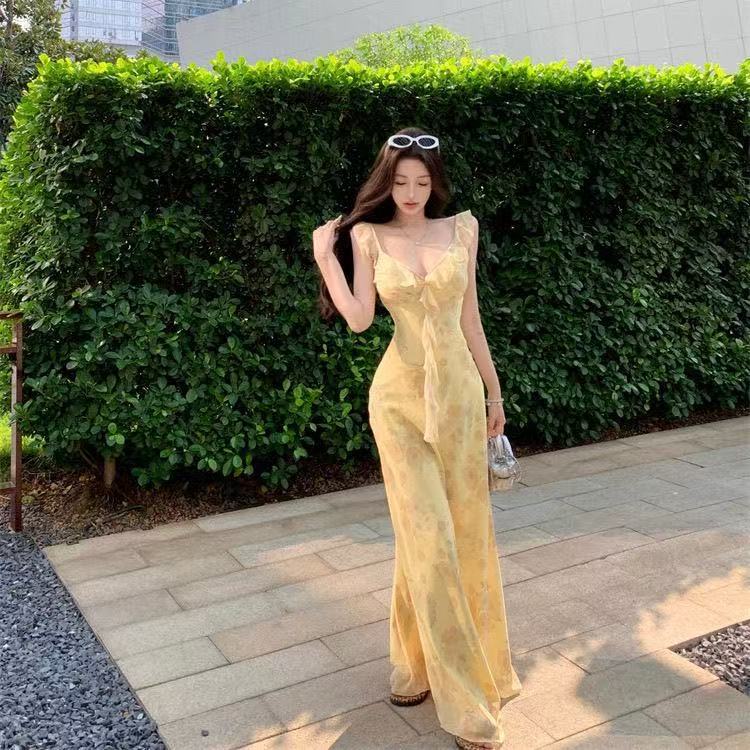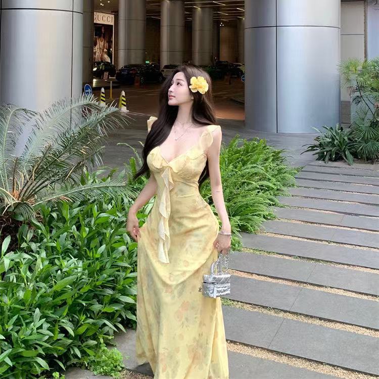 여름 여성용 옐로우 프린트 서스펜더 드레스, 프렌치 러플 스커트, 허리 슬림, 요정 스타일 롱 스커트스토어 가기