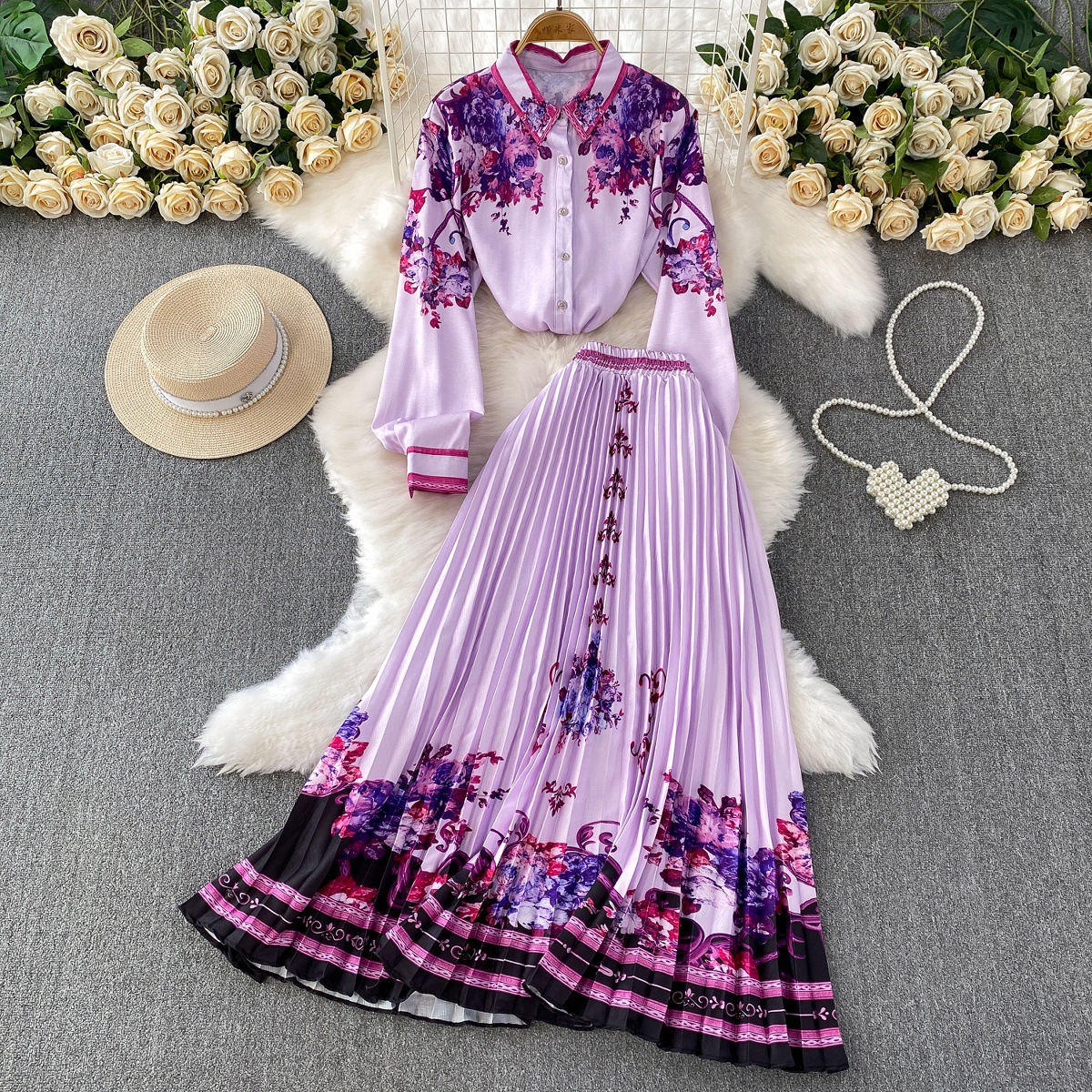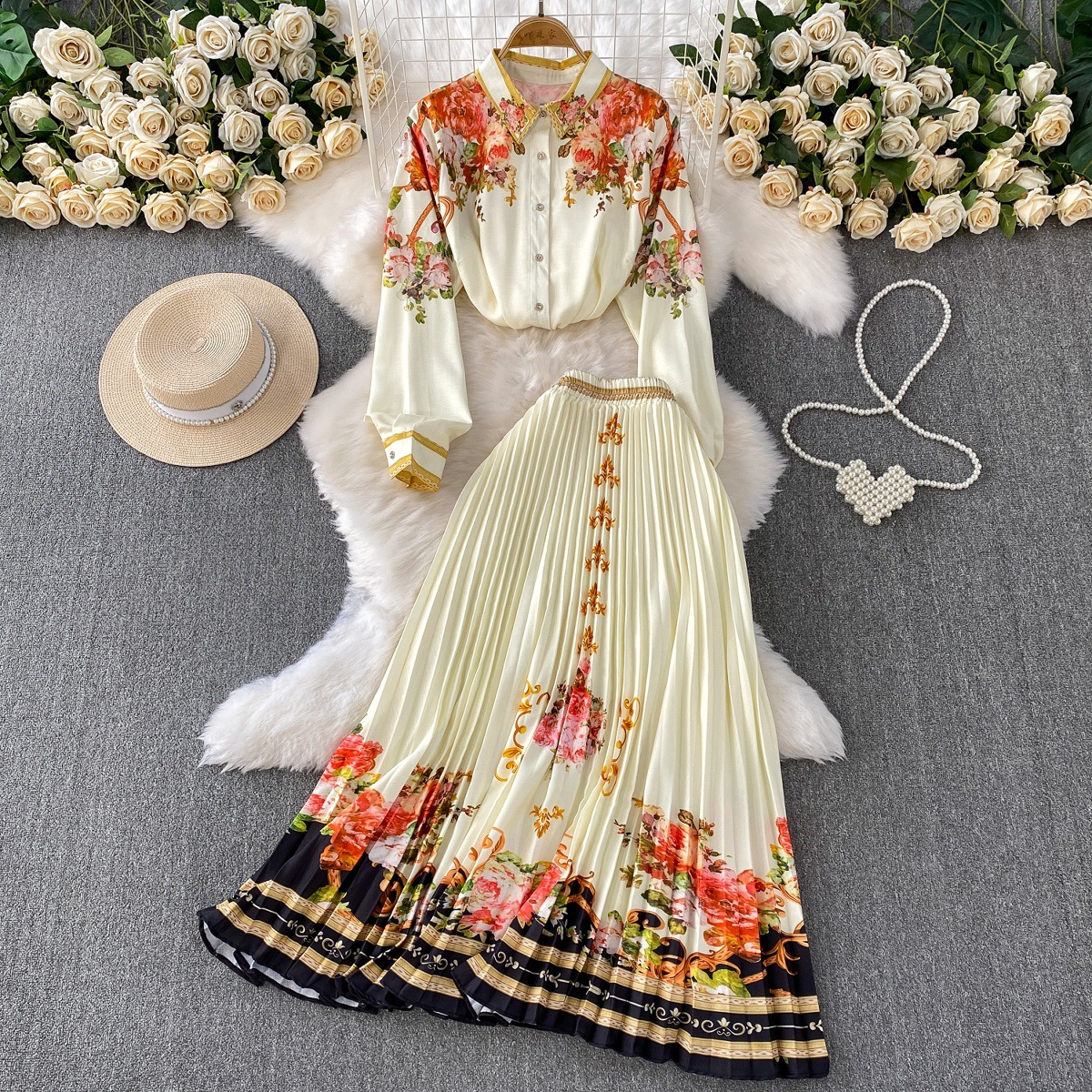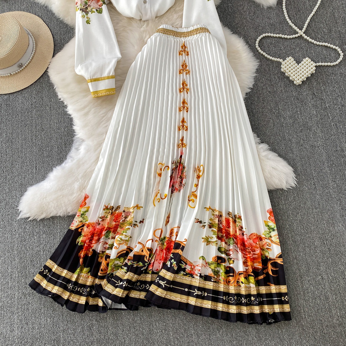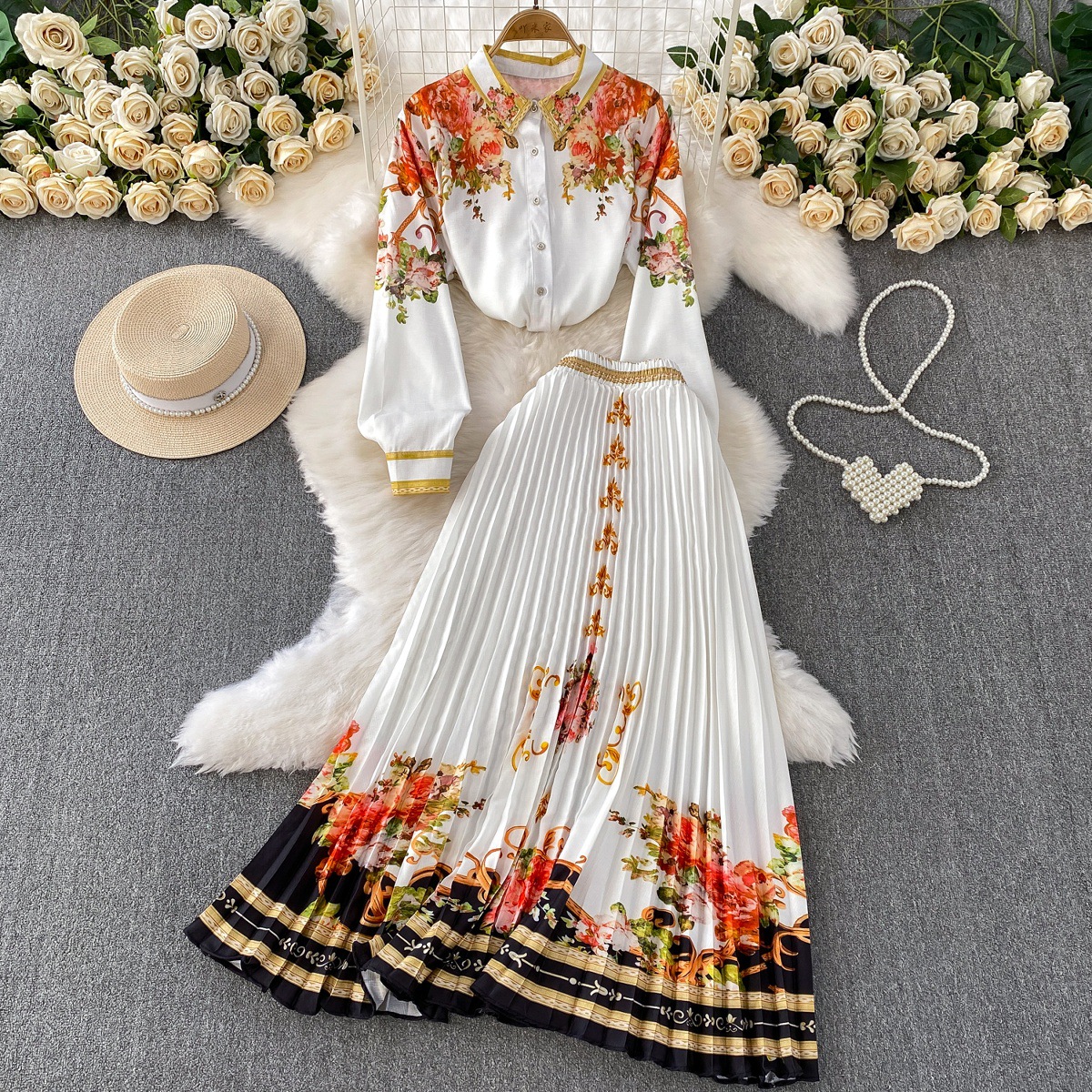 유럽과 미국의 복고풍 스타일 프린트 싱글 브레스트 라펠 긴팔 셔츠 + 하이 웨이스트 슬림 플레어 플리츠 스커트 슈트