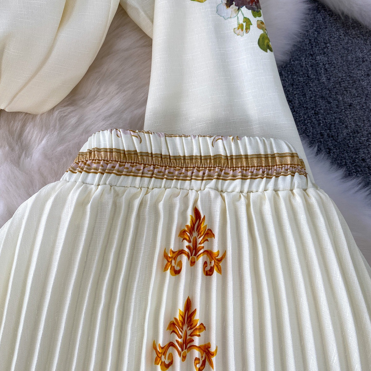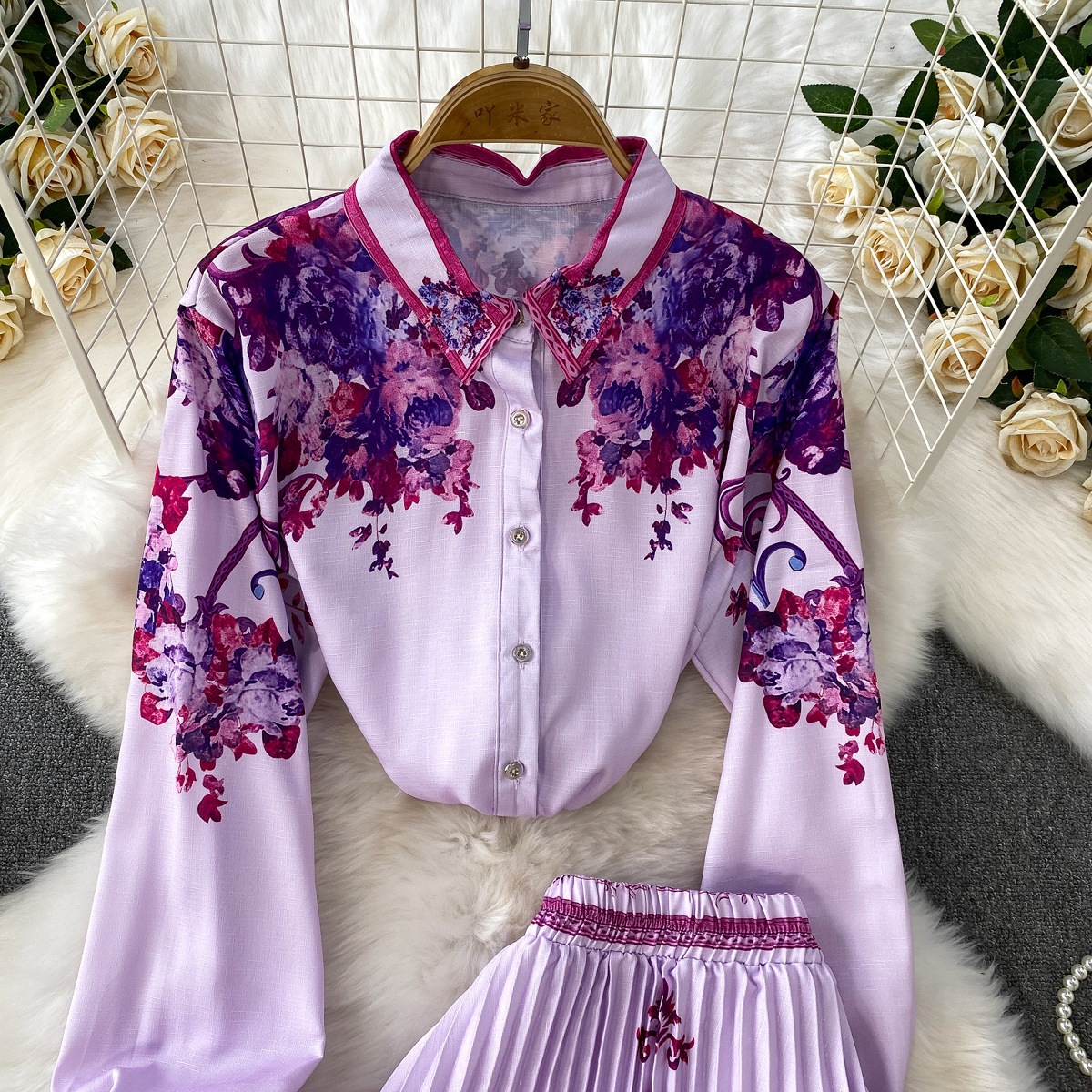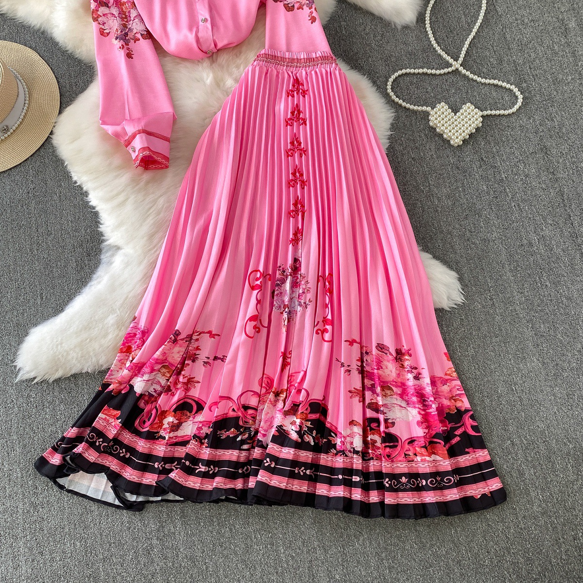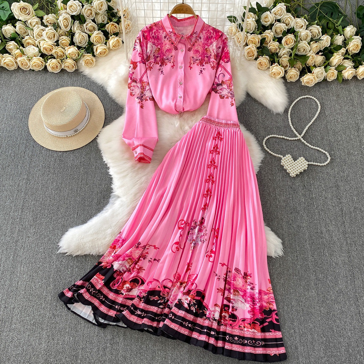 유럽과 미국의 복고풍 스타일 프린트 싱글 브레스트 라펠 긴팔 셔츠 + 하이 웨이스트 슬림 플레어 플리츠 스커트 슈트
