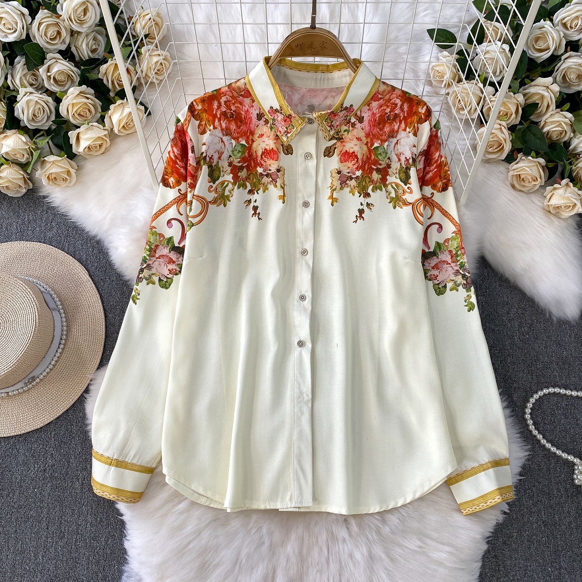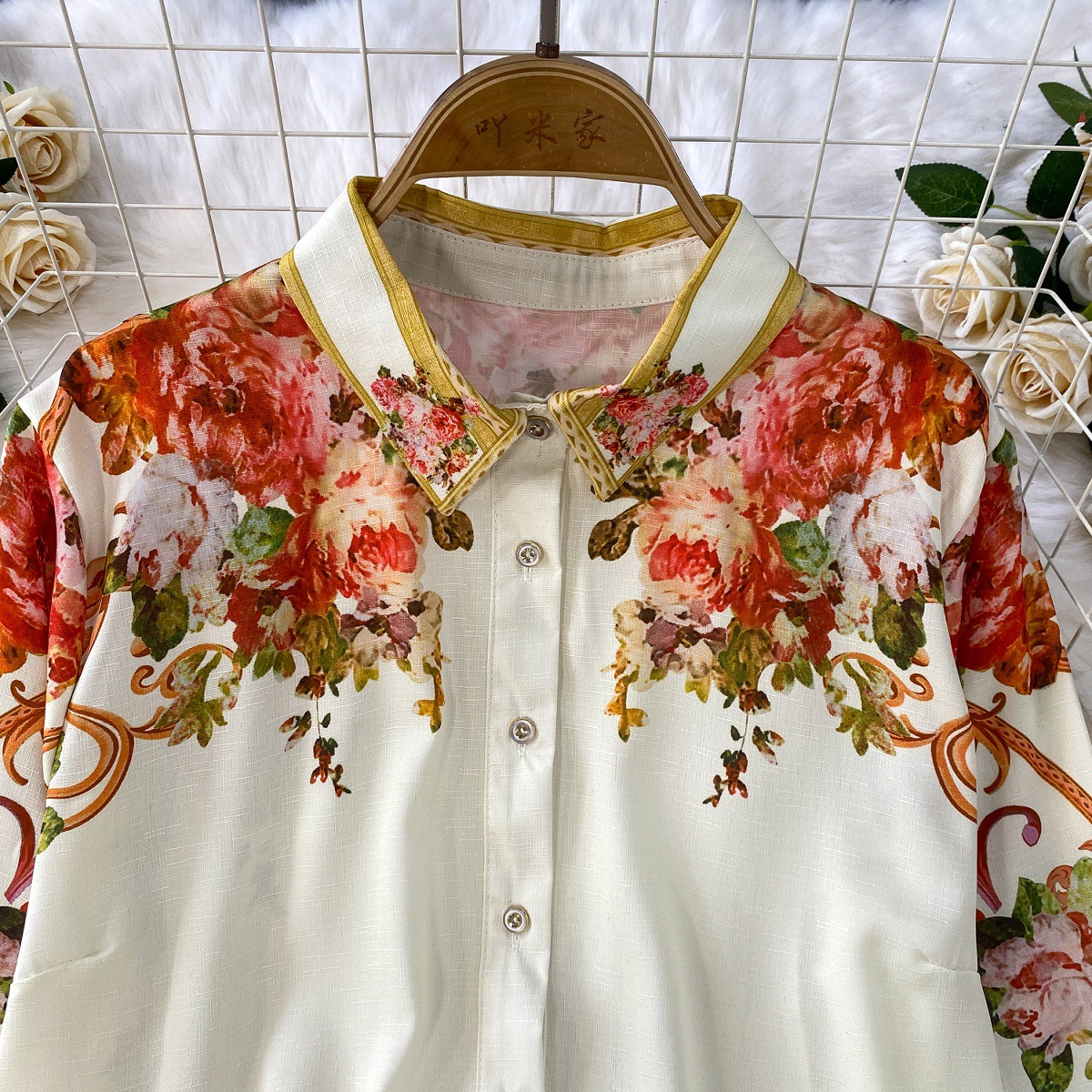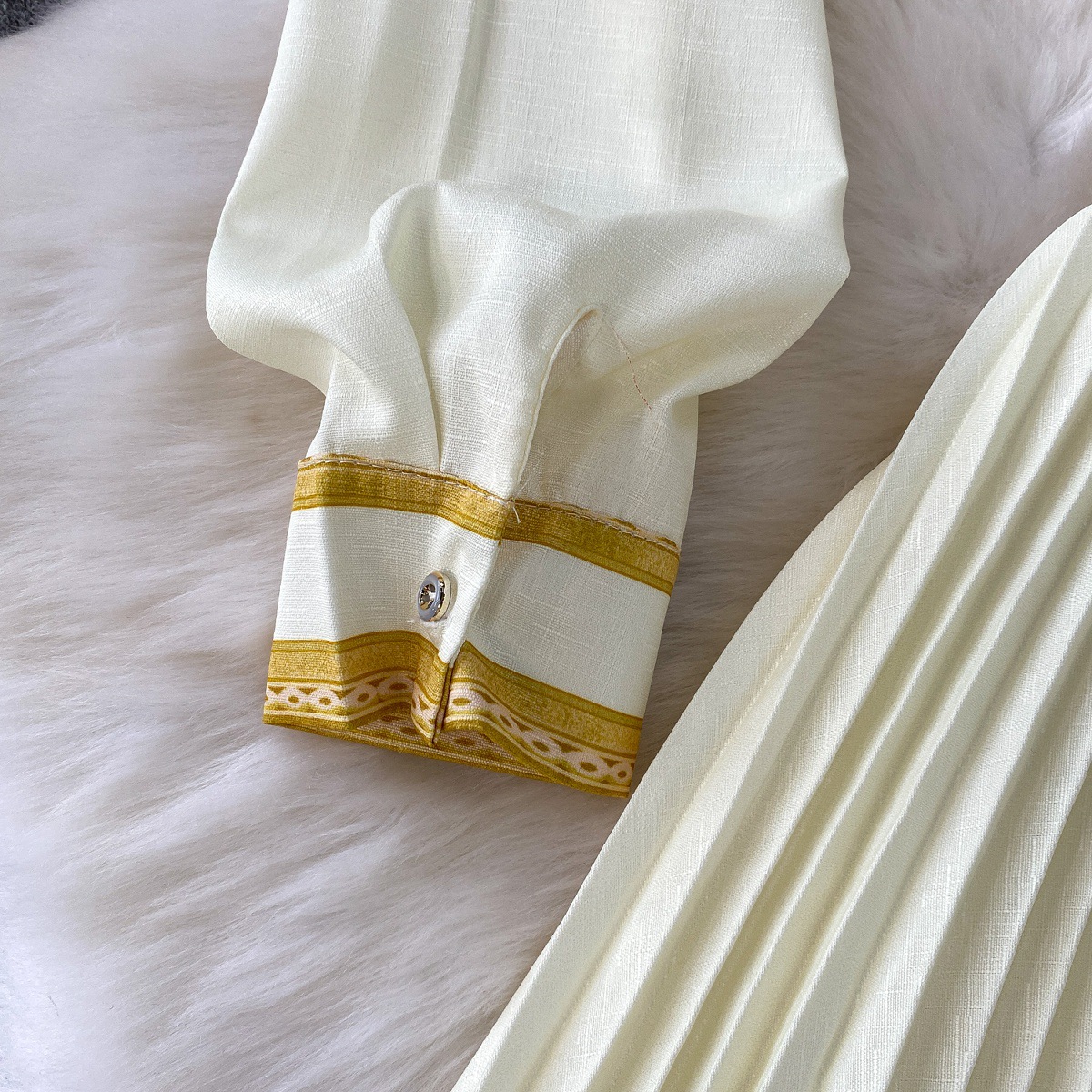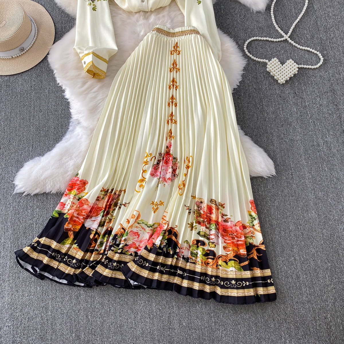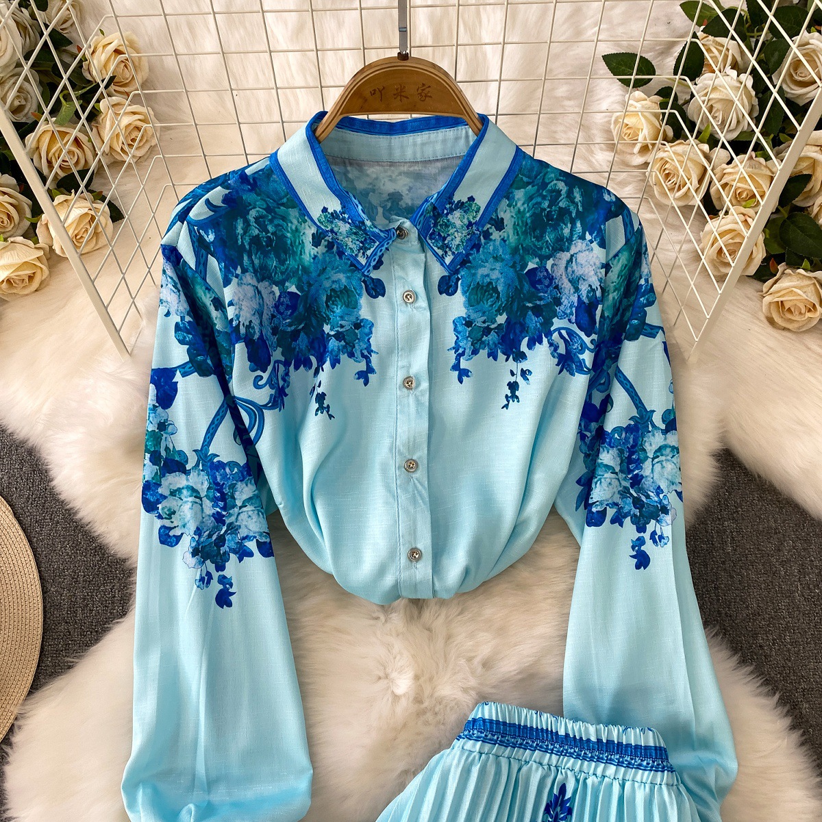 유럽과 미국의 복고풍 스타일 프린트 싱글 브레스트 라펠 긴팔 셔츠 + 하이 웨이스트 슬림 플레어 플리츠 스커트 슈트