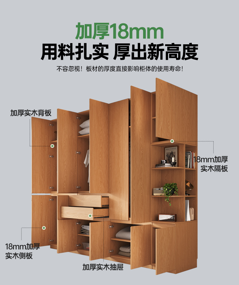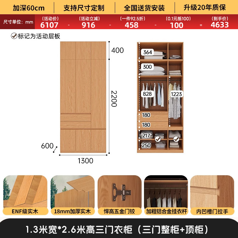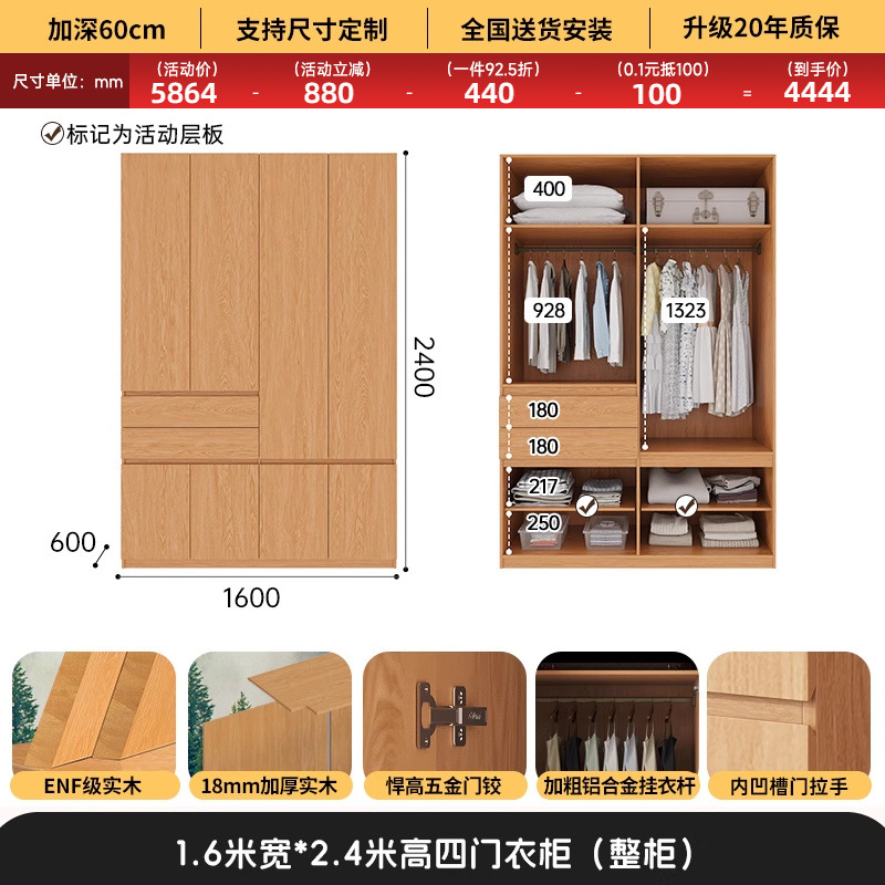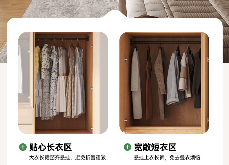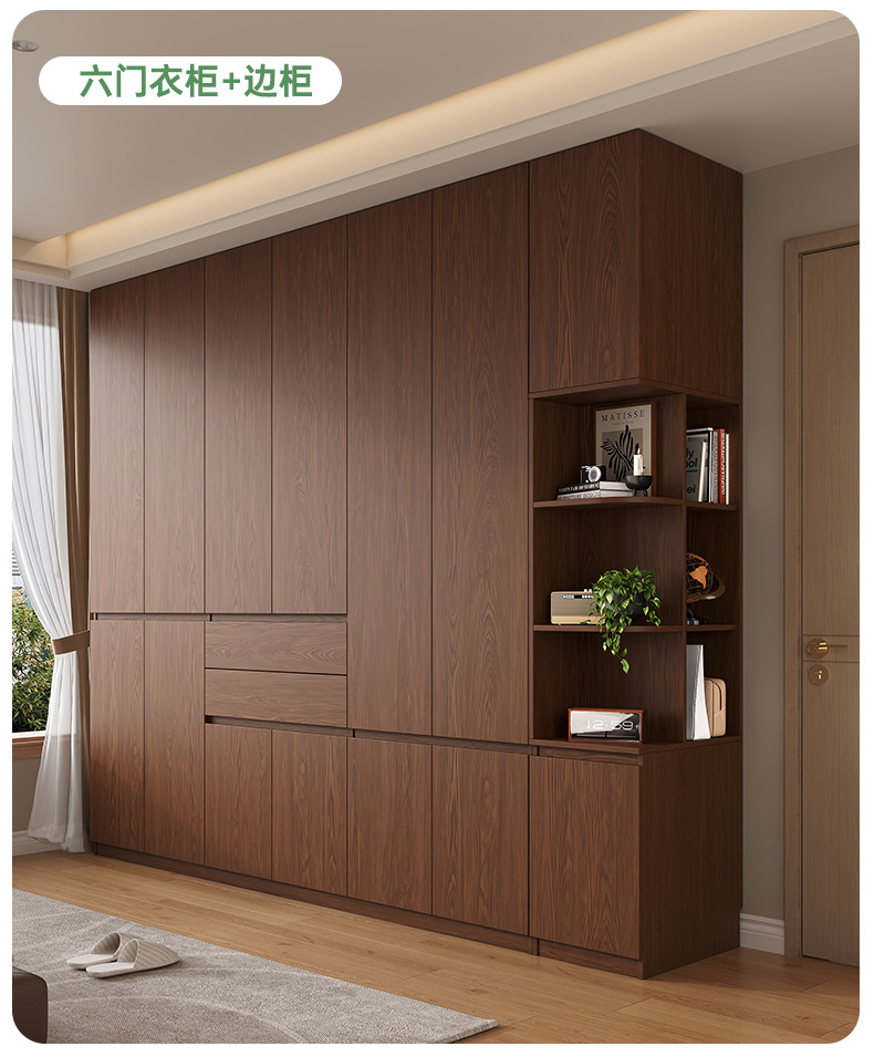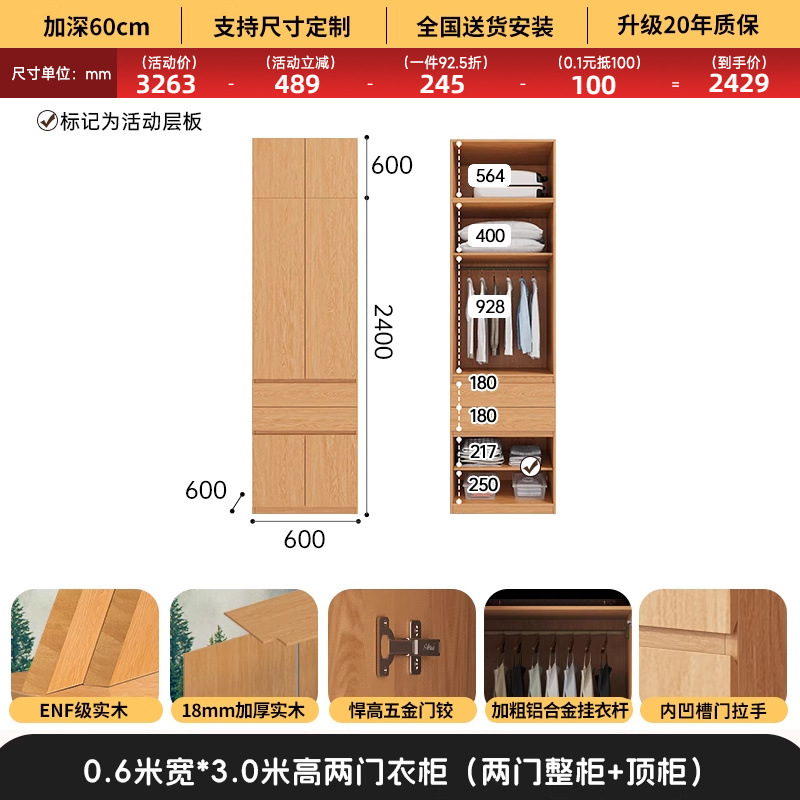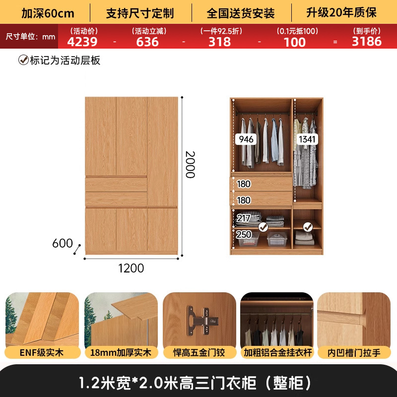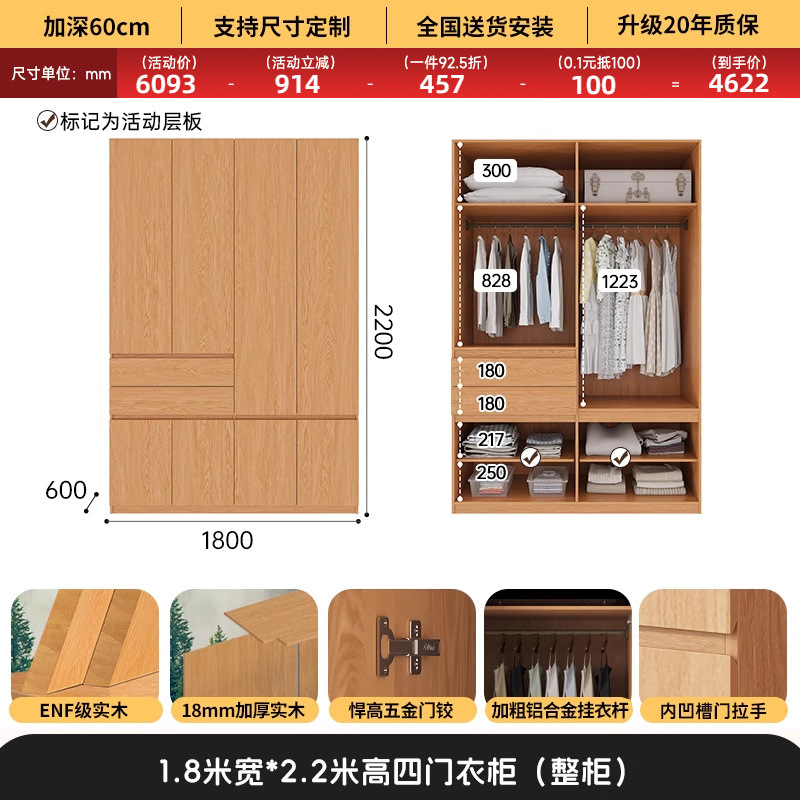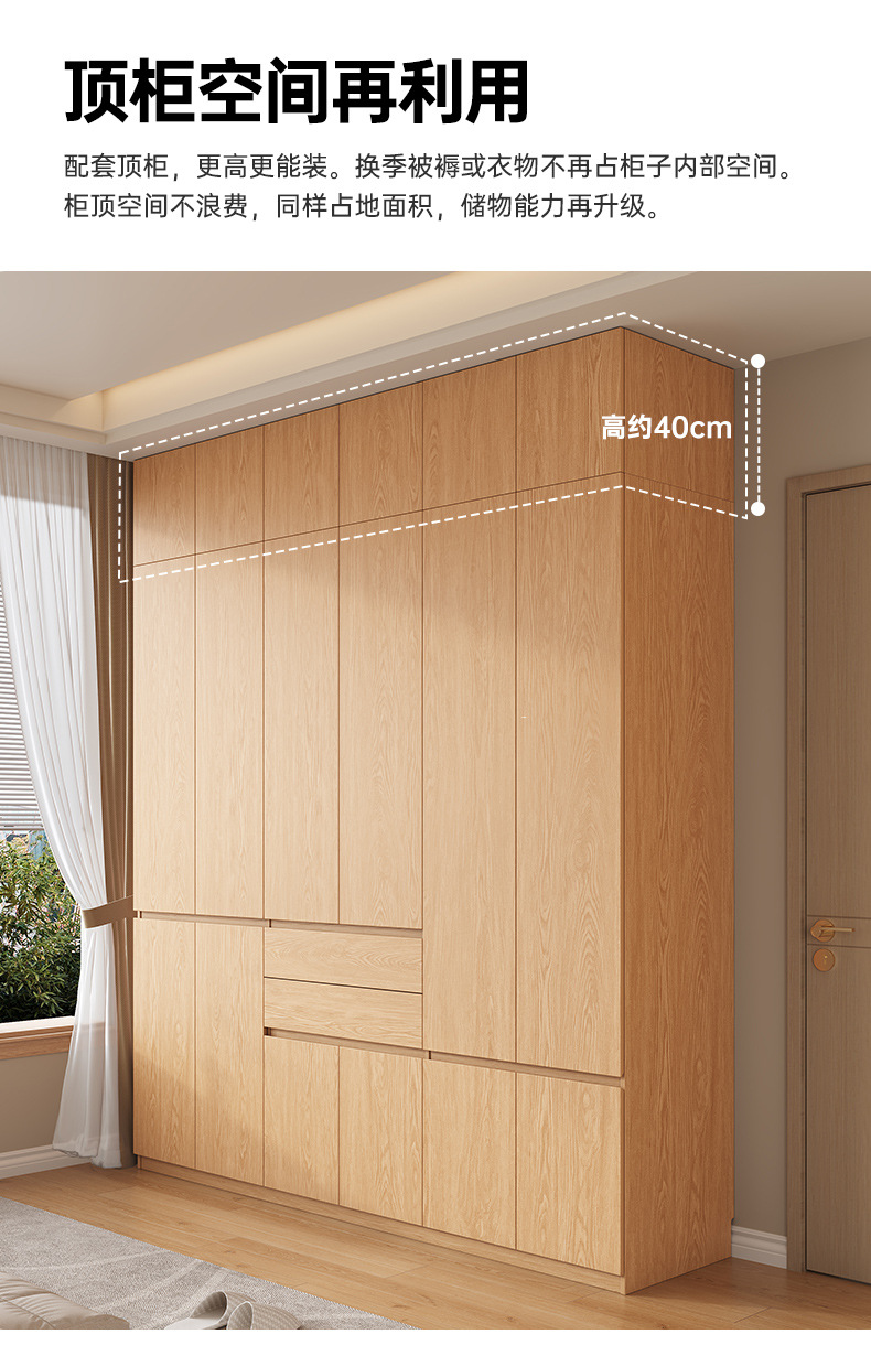 전체 고무나무 원목 옷장 북유럽 스타일 침실 가정용 신제품 2024 인기 대용량 옷장