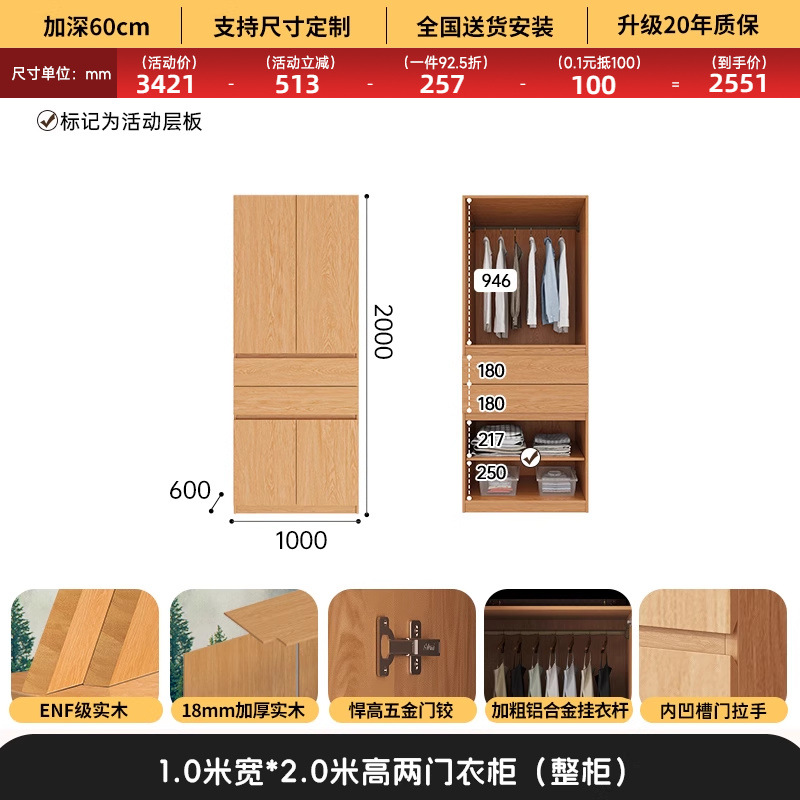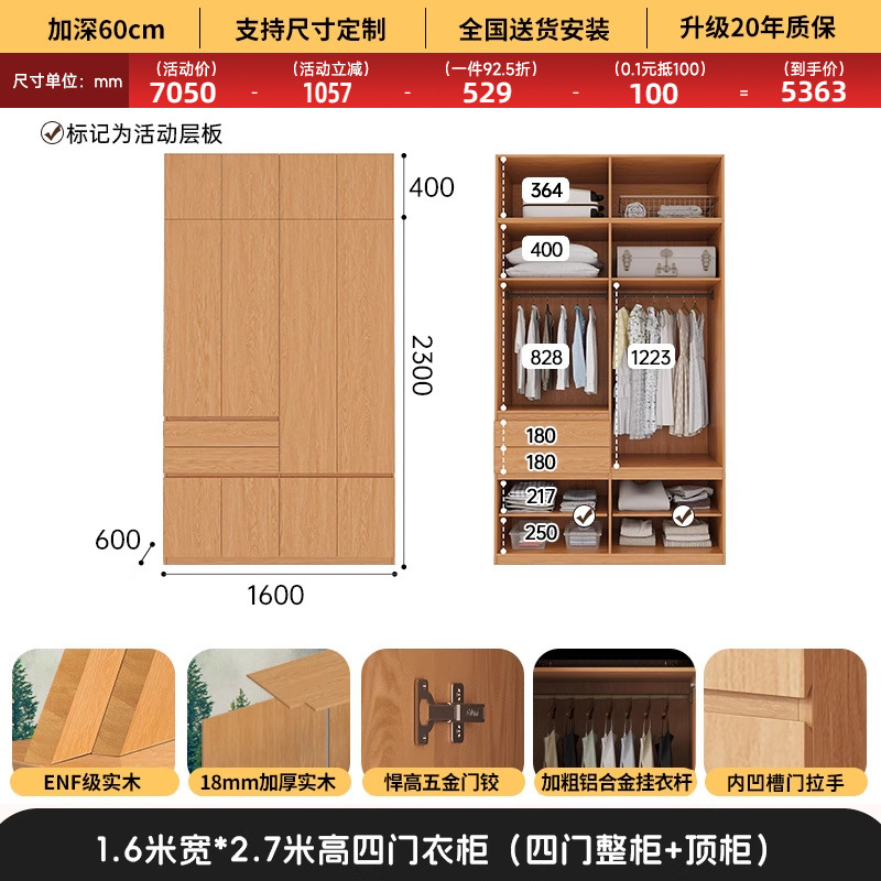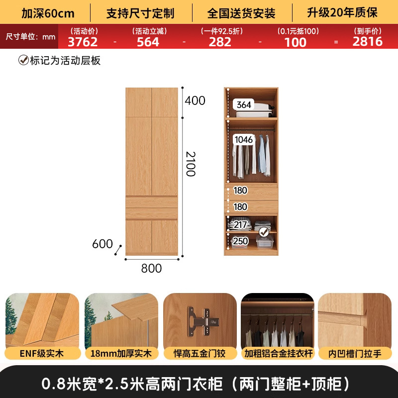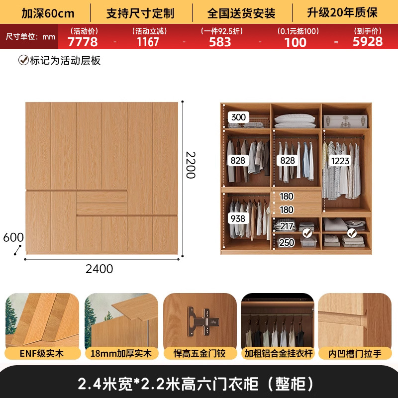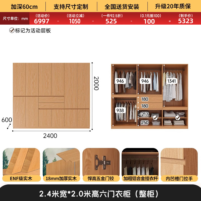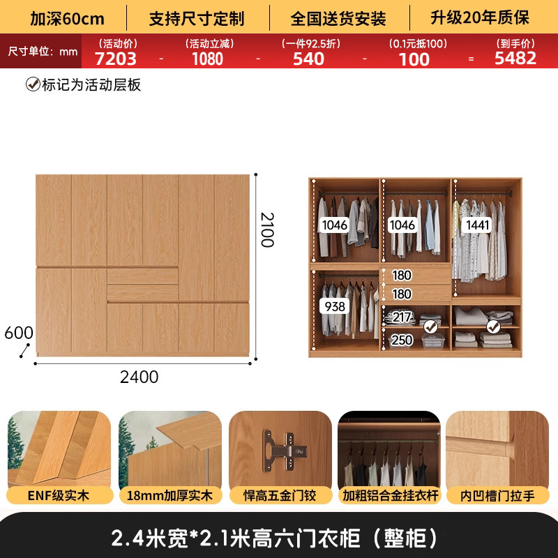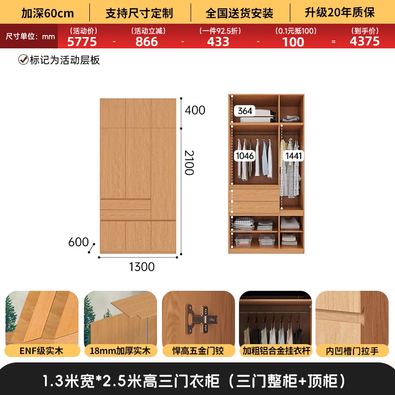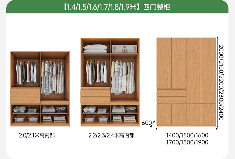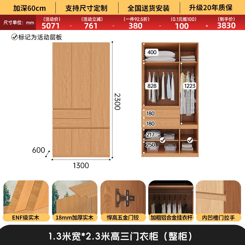 전체 고무나무 원목 옷장 북유럽 스타일 침실 가정용 신제품 2024 인기 대용량 옷장