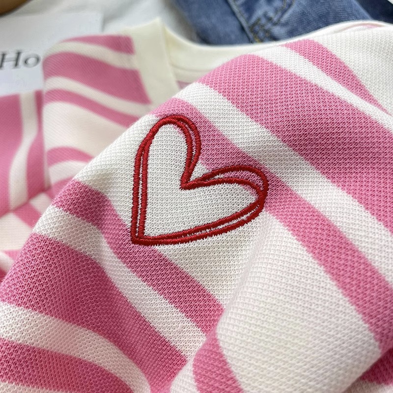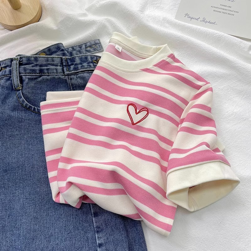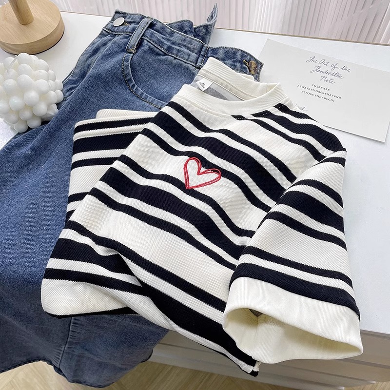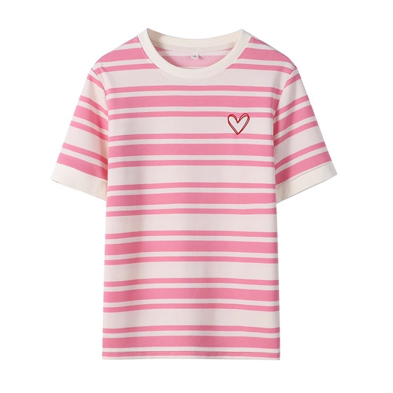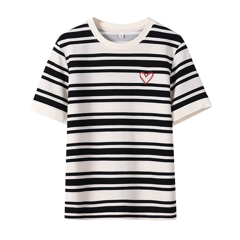 여성용 공식 사진 스트라이프 반팔 티셔츠 여름 2025 짧은 오른쪽 어깨 자수 꽃 라운드 넥 트렌디 탑 플러스 사이즈 한국 여성 의류스토어 가기