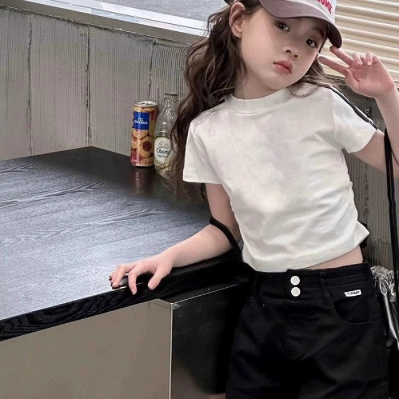 女童短款修身恤夏季童装女孩空白版短袖中大童上衣_白色