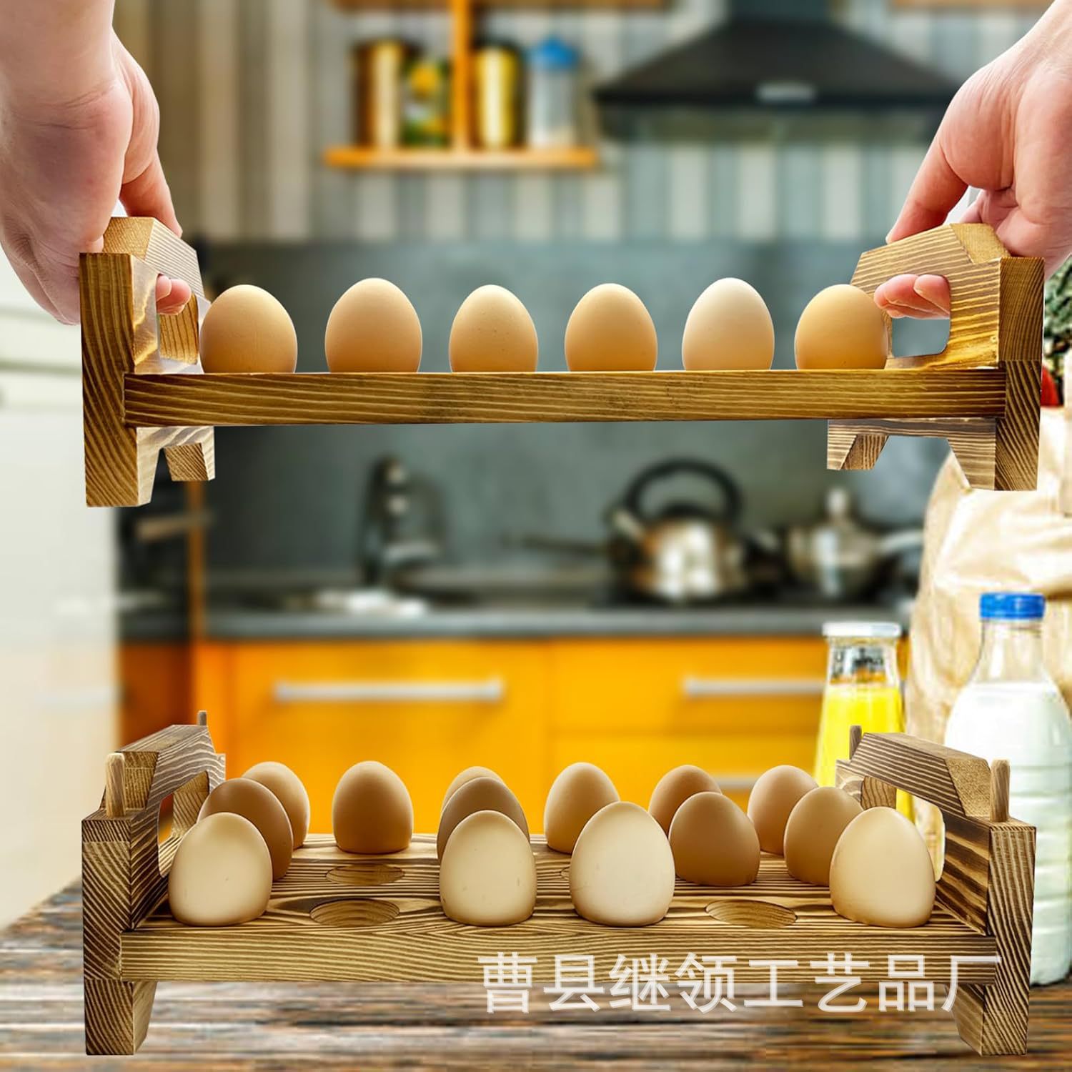 주방 정리 및 보관 랙 조리대는 이중층으로 내구성이 뛰어나고 공간 절약형 디자인입니다. 가정용 목재 계란 랙스토어 가기