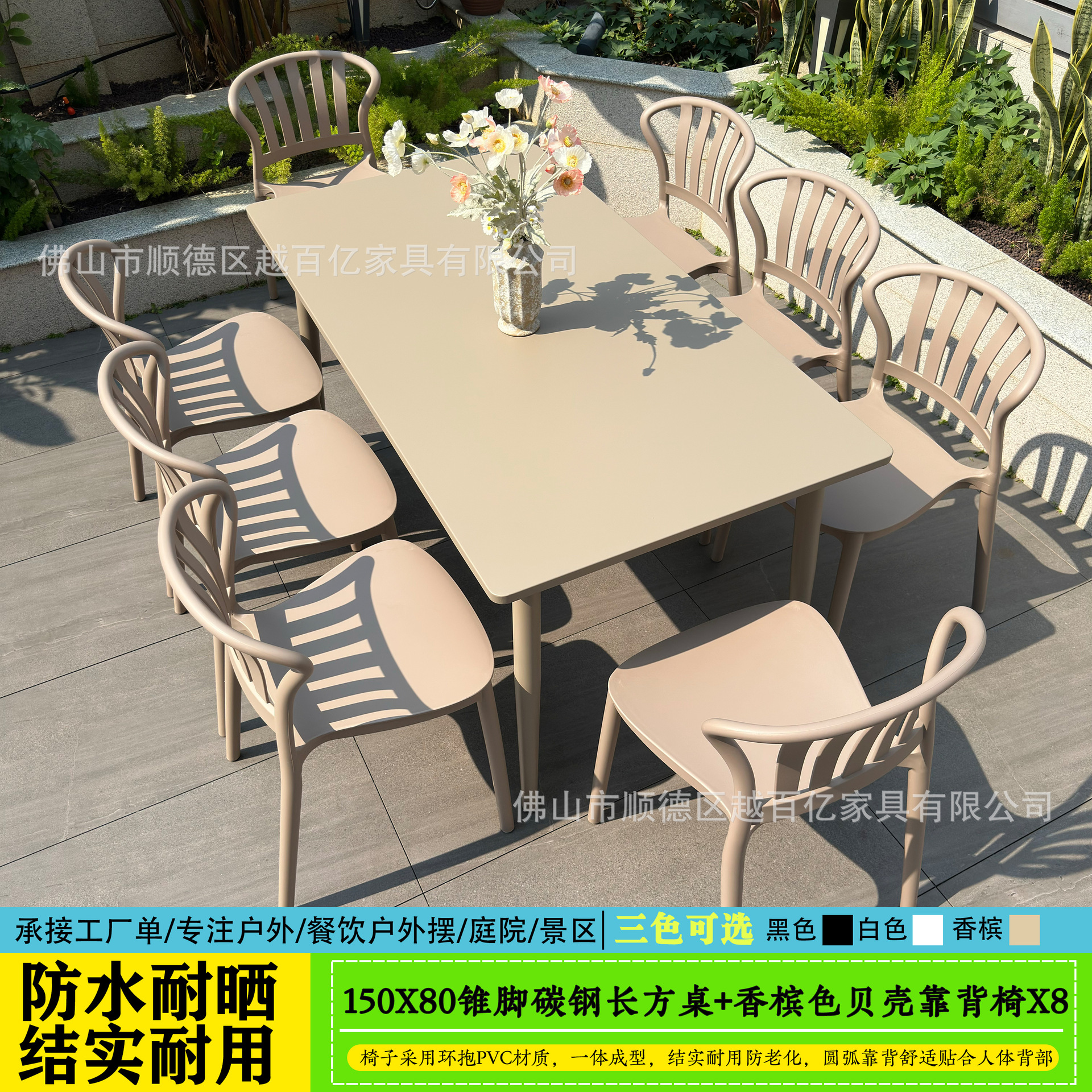 • 150X80 샴페인 컬러 콘 풋 탄소강 롱 테이블 + 샴페인 컬러 쉘 아크 의자 8개