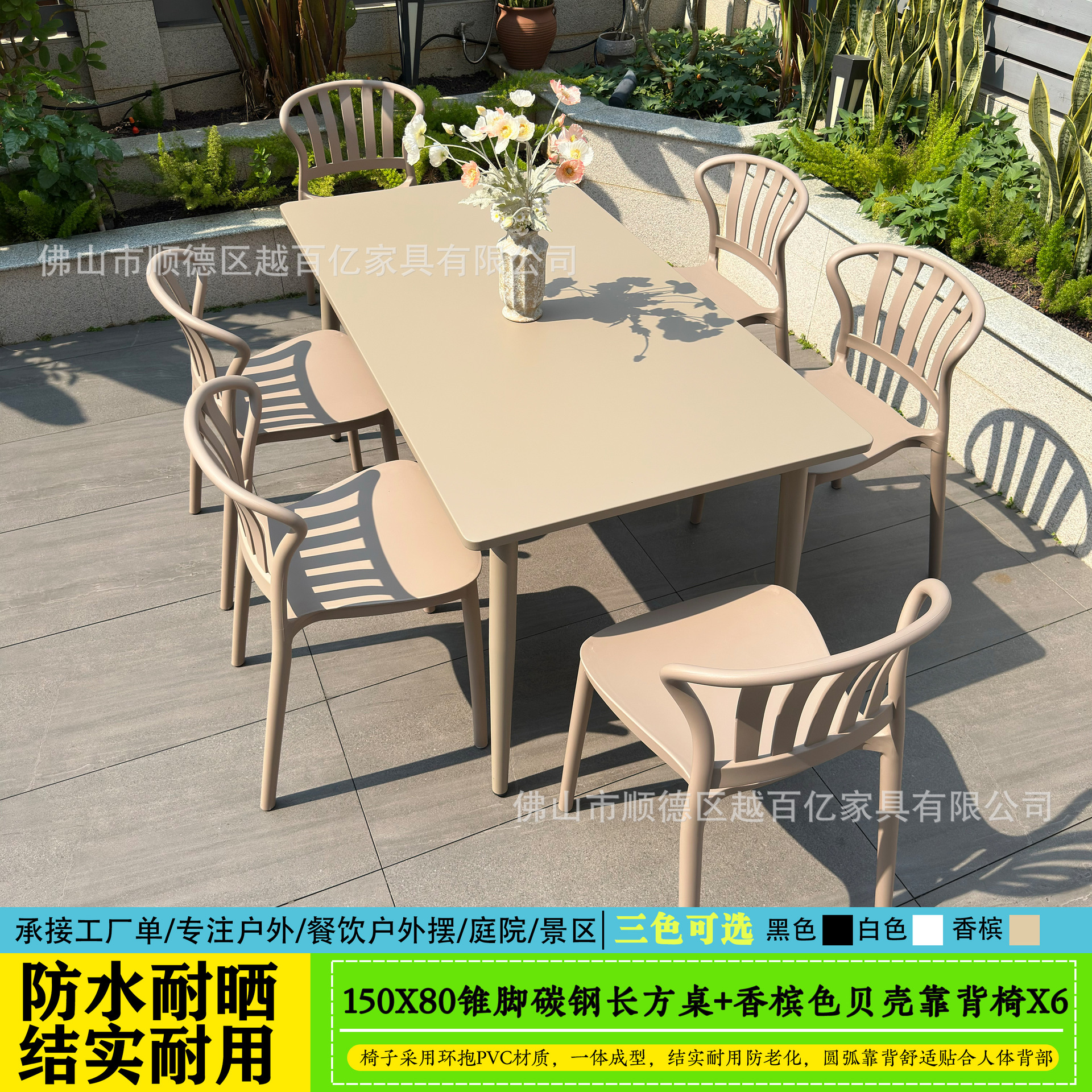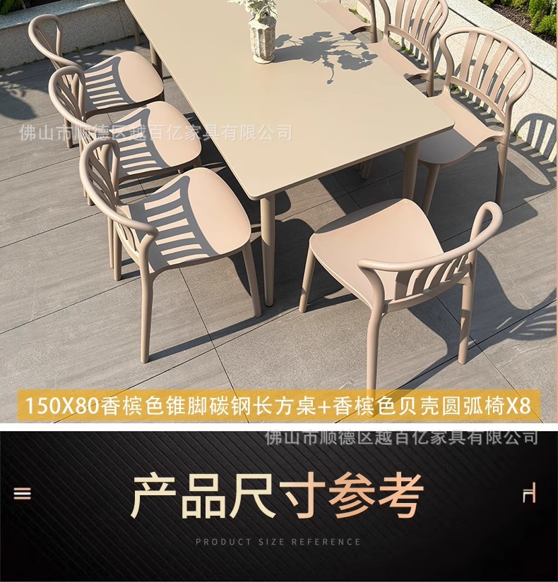 • 150X80 샴페인 컬러 콘 다리 탄소강 롱 테이블 + 샴페인 컬러 쉘 아크 의자 6개