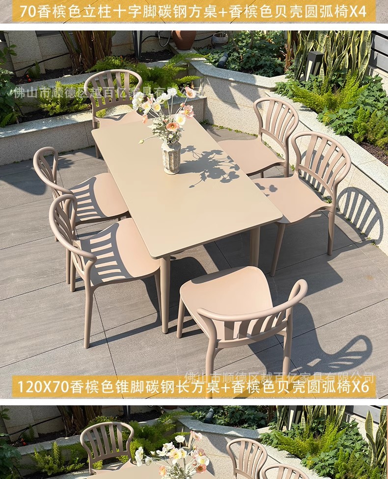 • 120X70 샴페인 컬러 콘 다리 탄소강 롱 테이블 + 샴페인 컬러 쉘 아크 의자 6개