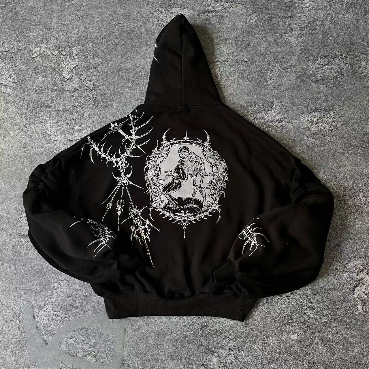 2025 뉴 아메리칸 레트로 힙합 해골 프론트와 백 프린트 후드 티셔츠 남성 하이 스트리트 가을, 겨울 코트 후드스토어 가기