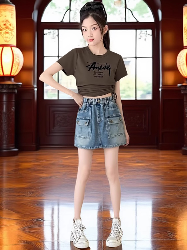 아마존 소녀 데님 스커트 여름 스타일 소녀 스타일 작업복 스커트 얇은 중대형 어린이 유행 멋진 스커트 도매