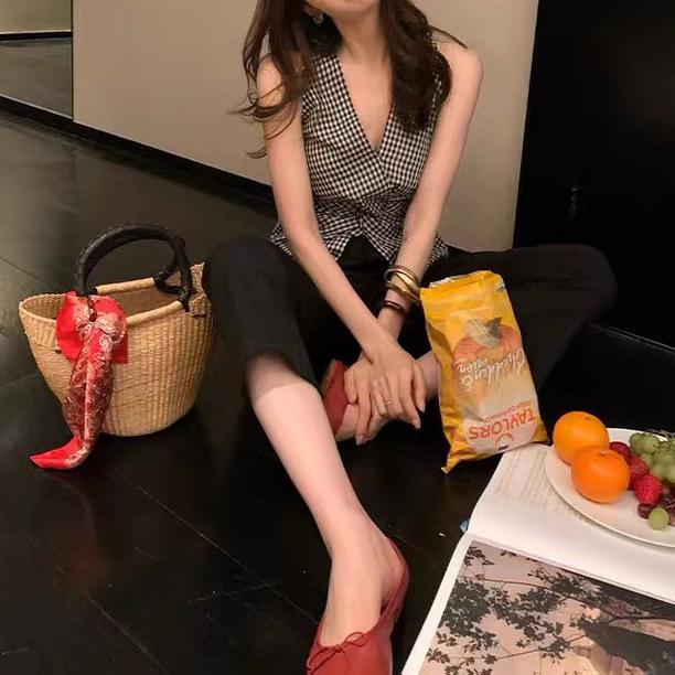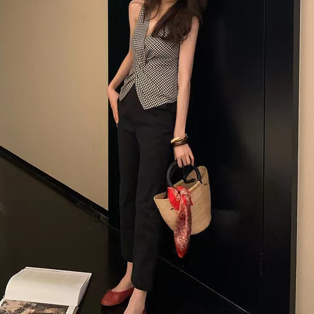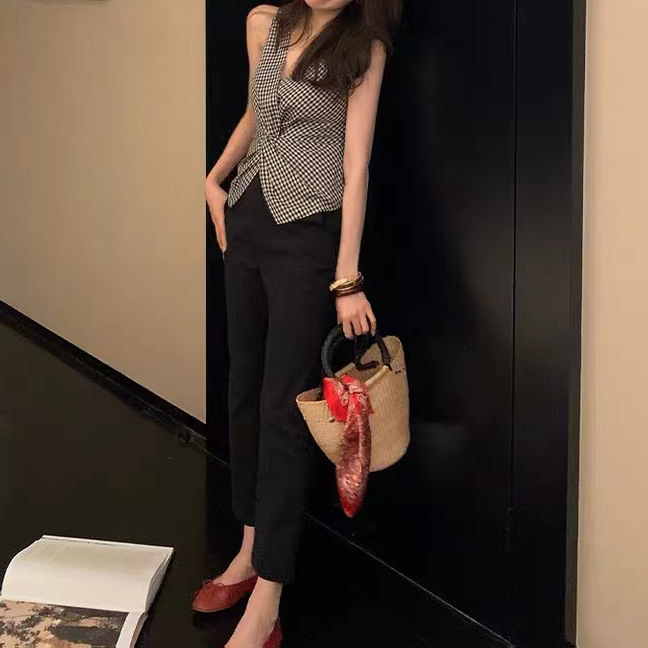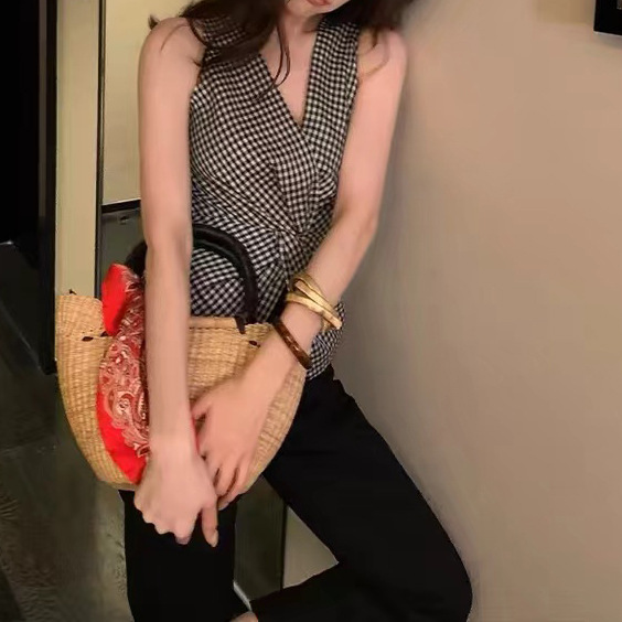 여름 여성을 위한 얇은 올드 머니 스타일 피부 친화적인 흑백 격자 무늬 조끼, 고급스럽고 세련된 트위스트 디자인 조끼