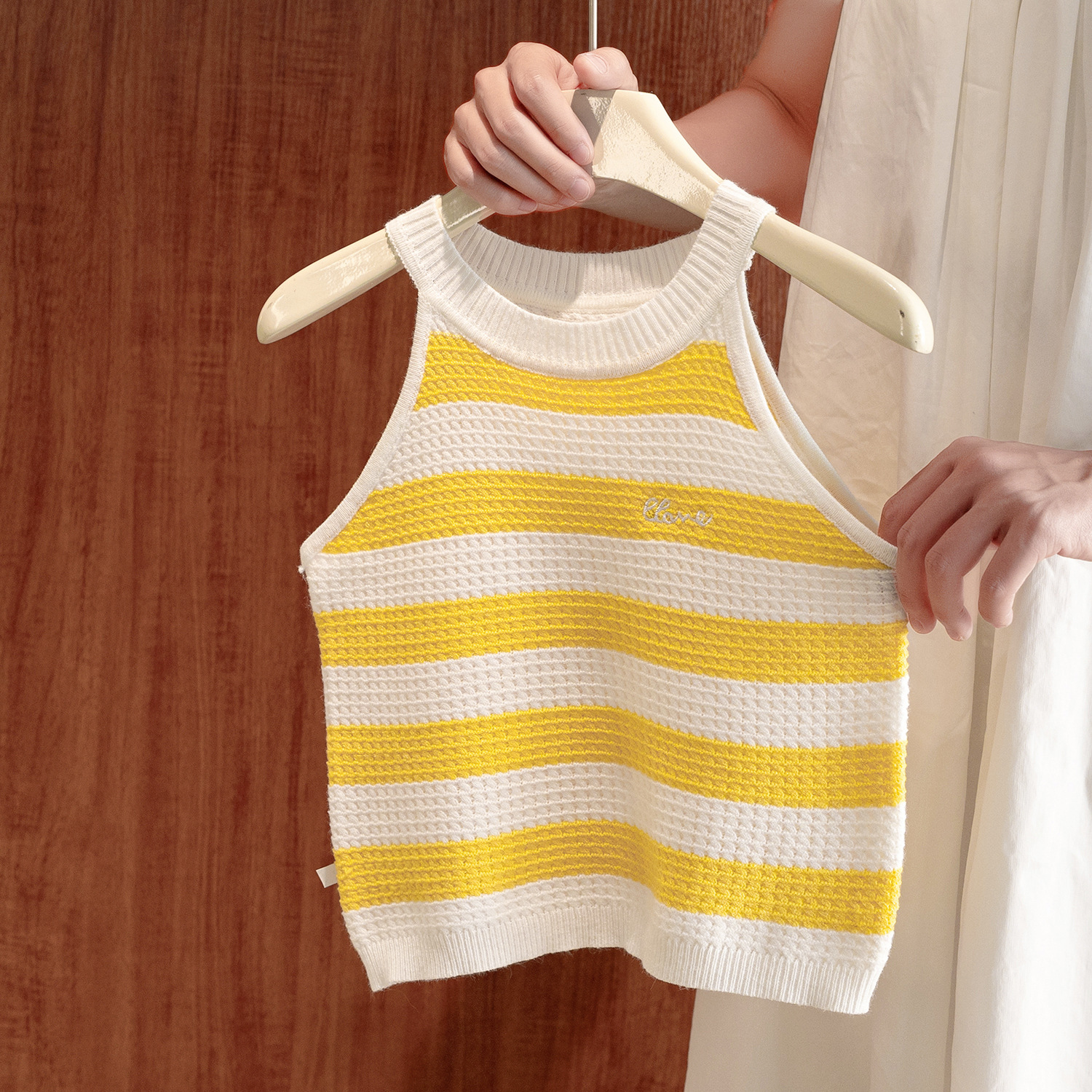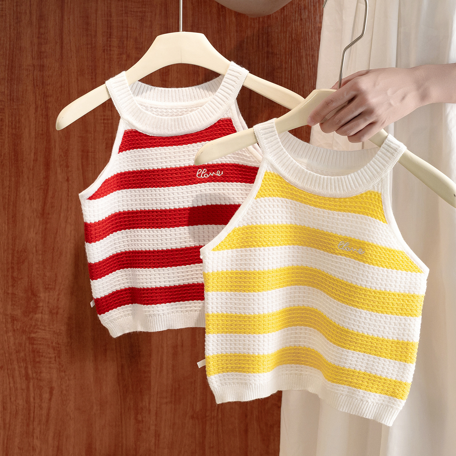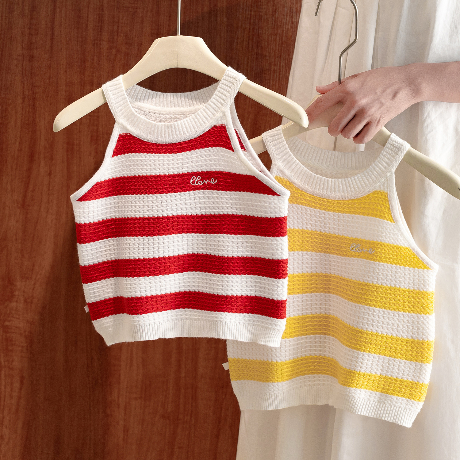 여자 니트 조끼 아기 소녀 새로운 한국 스타일 캐주얼 스트라이프 여름 얇은 민소매 홀터넥 레터 탑