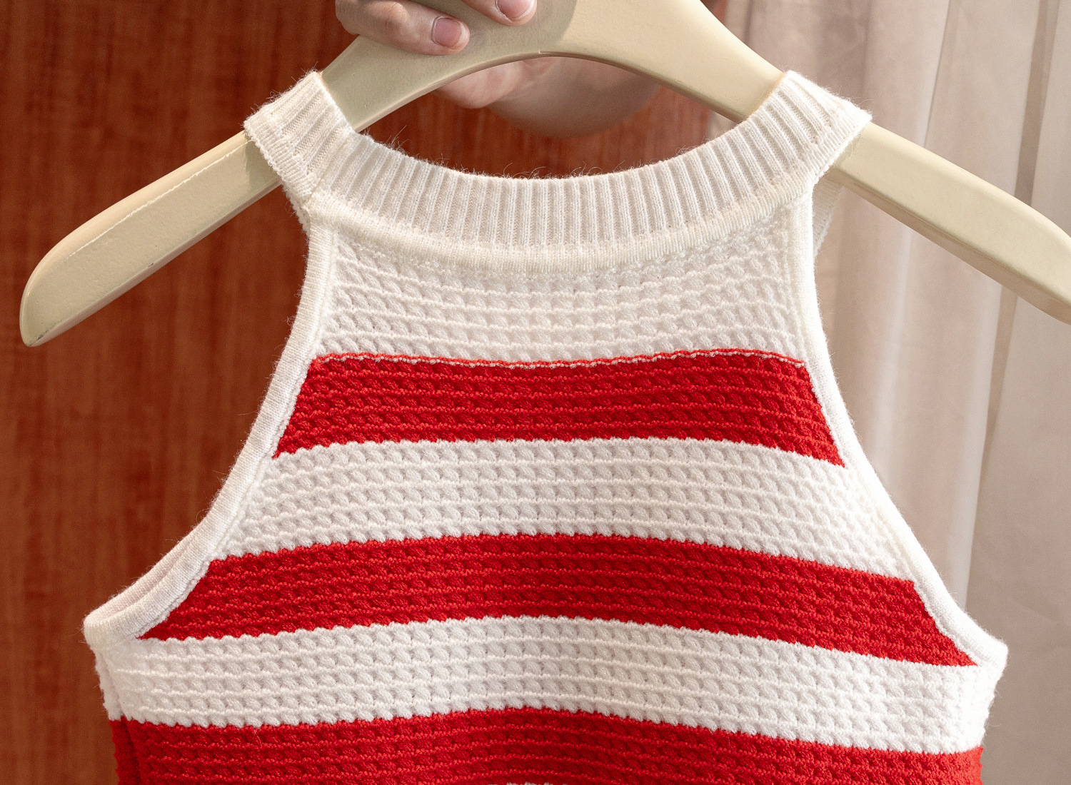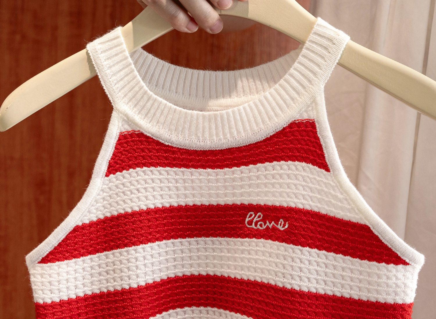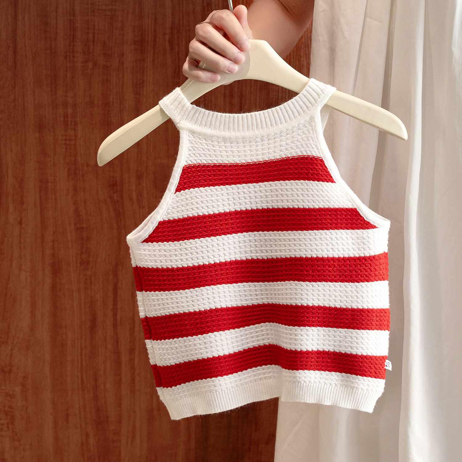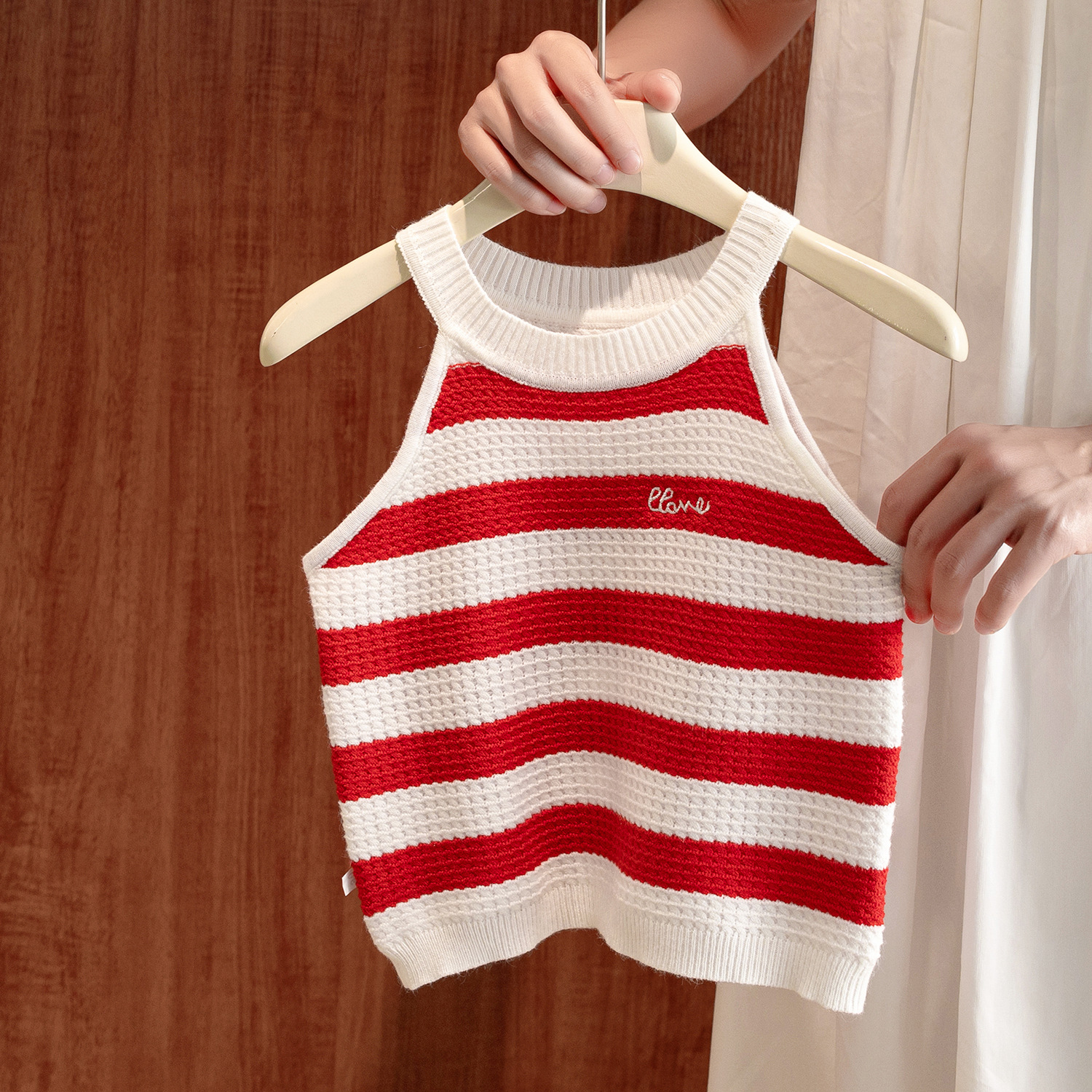 여자 니트 조끼 아기 소녀 새로운 한국 스타일 캐주얼 스트라이프 여름 얇은 민소매 홀터넥 레터 탑