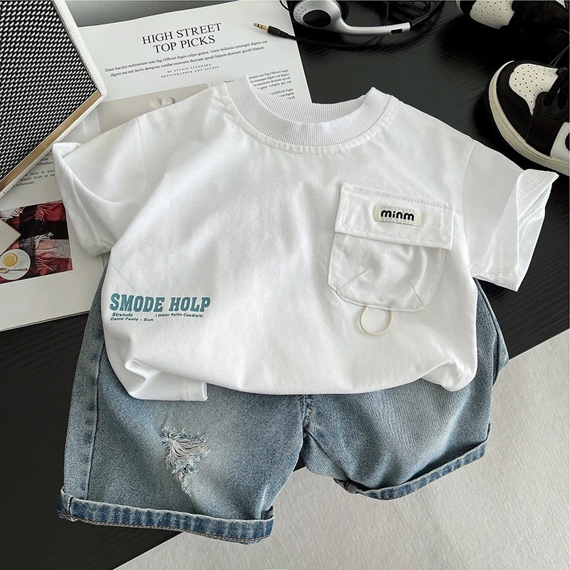 소년 여름 옷 아기 주머니 반팔 2025 여름 신작 아동 패션 서양식 편지 티셔츠 한국 스타일상의스토어 가기