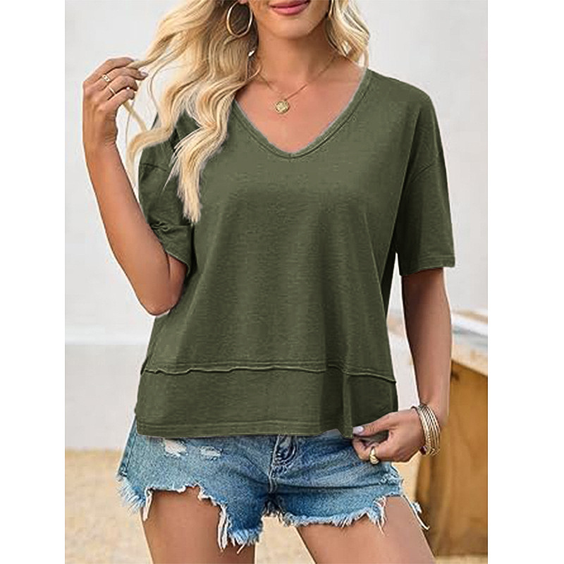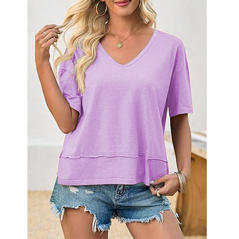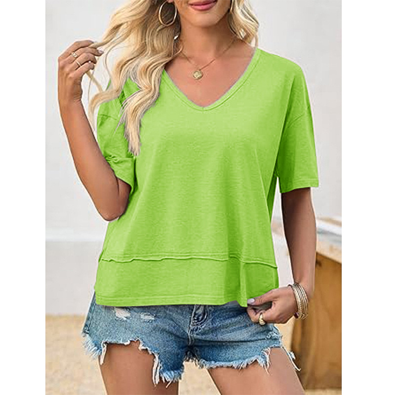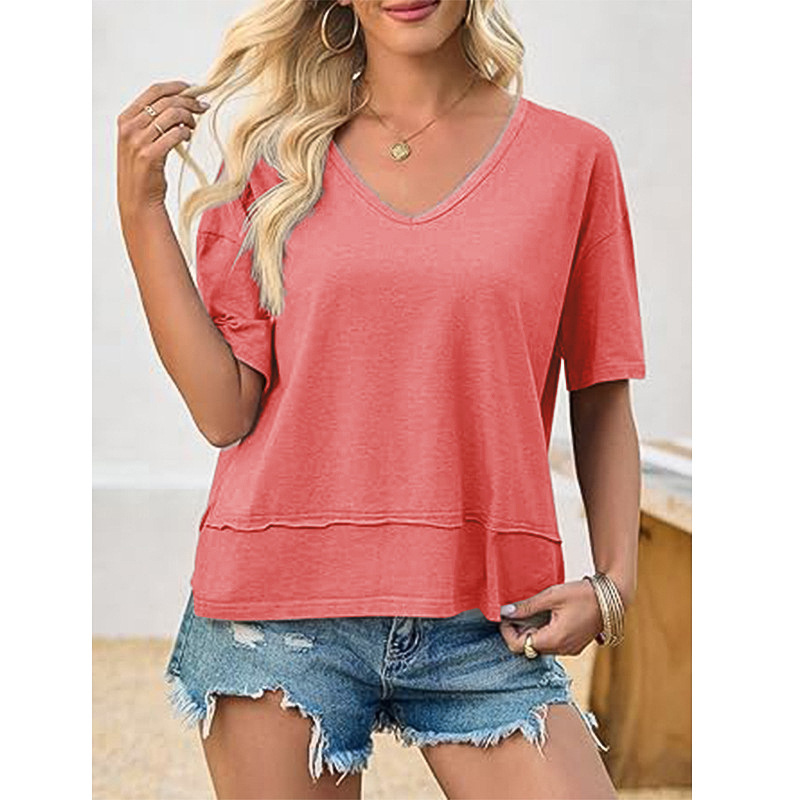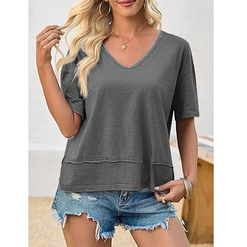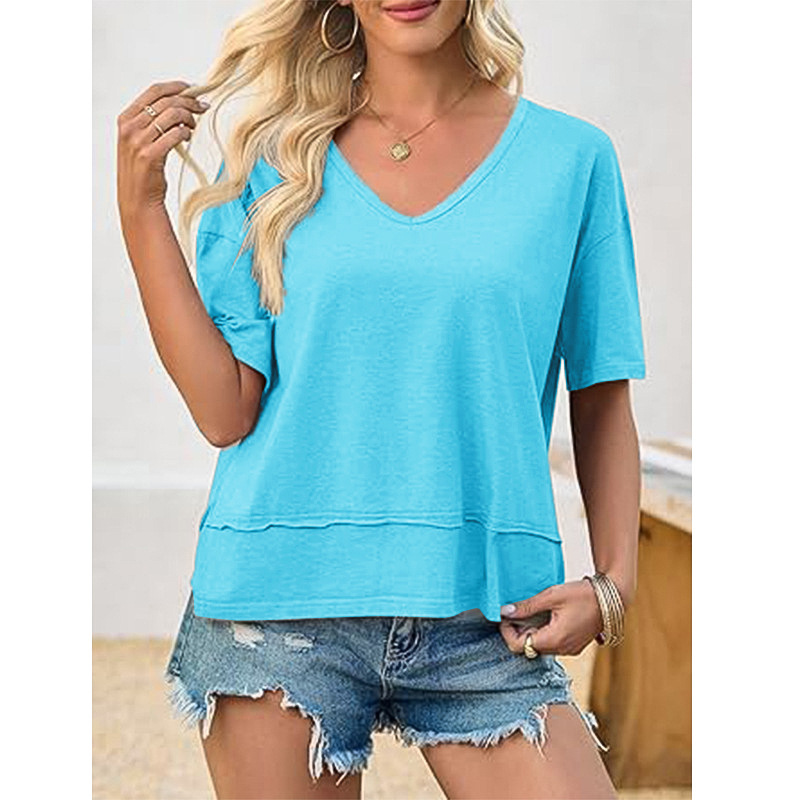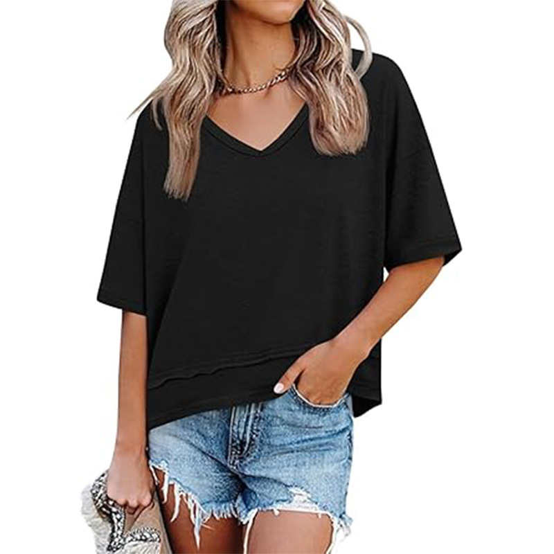 2025 여름 새로운 유럽과 미국의 아마존 크로스보더 패션 여성 솔리드 컬러 스플 라이스 5부 소매 v 넥 루즈 티셔츠스토어 가기