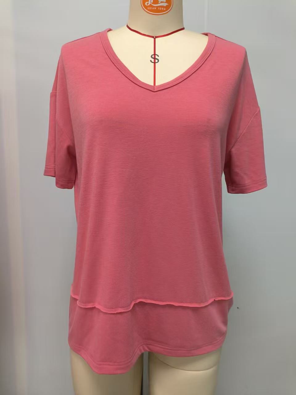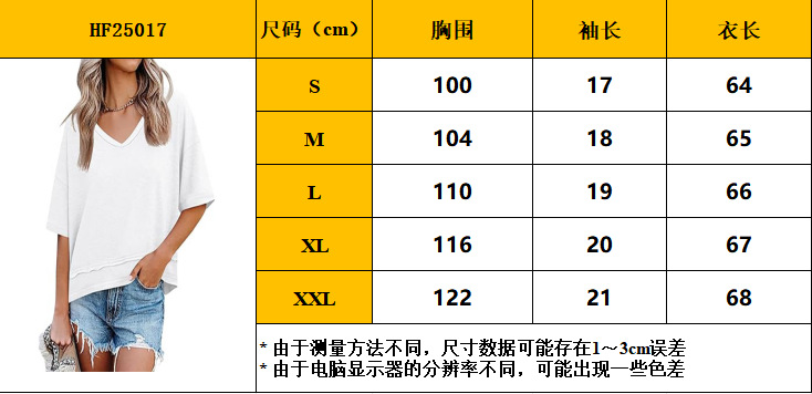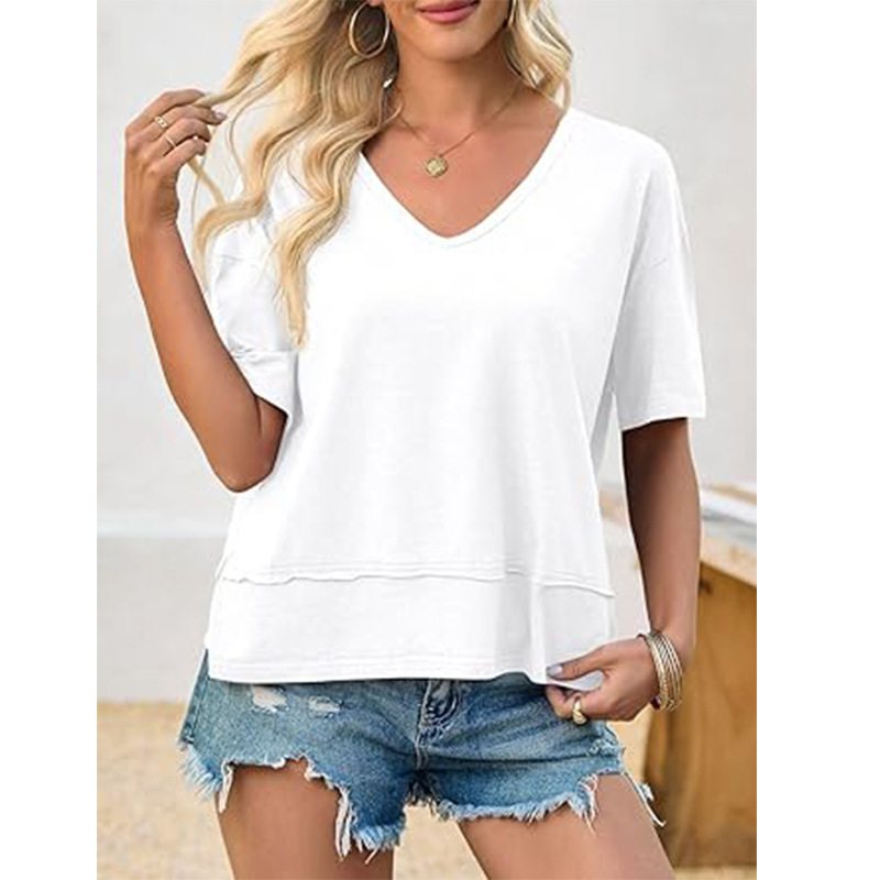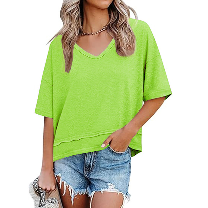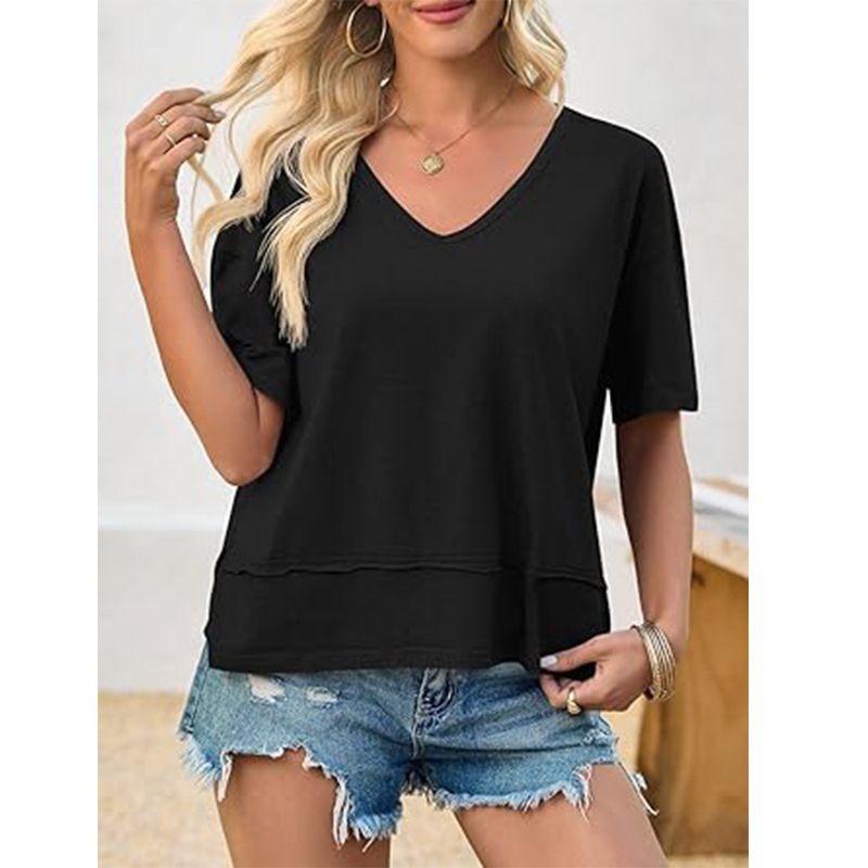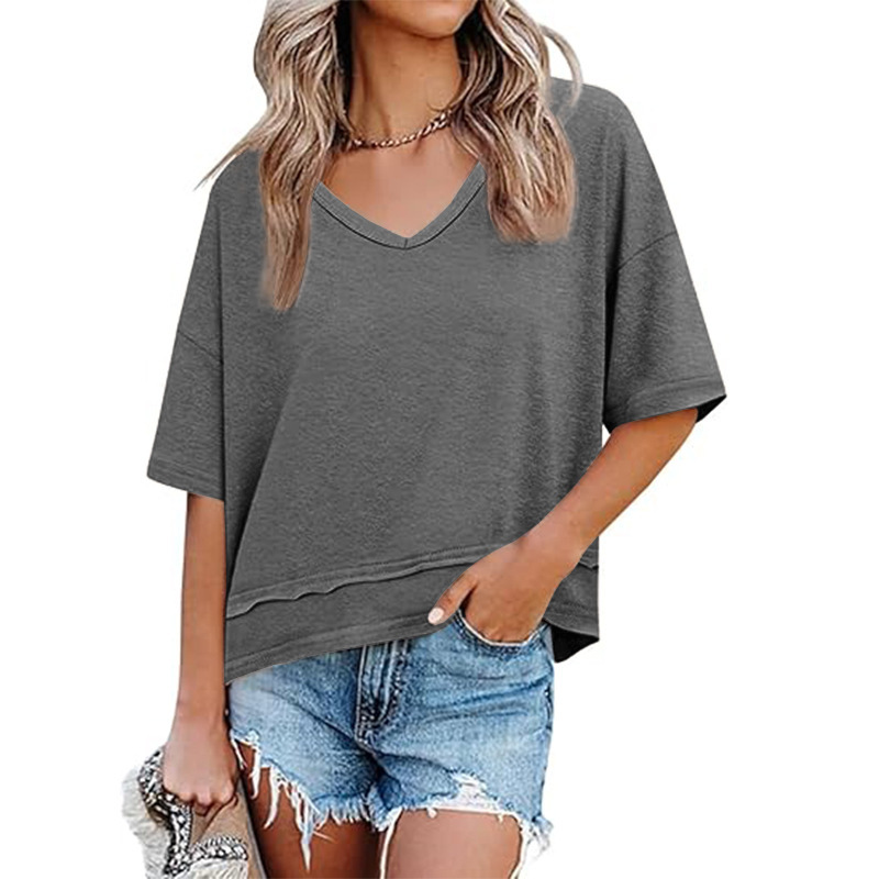 2025 여름 새로운 유럽과 미국의 아마존 크로스보더 패션 여성 솔리드 컬러 스플 라이스 5부 소매 v 넥 루즈 티셔츠스토어 가기
