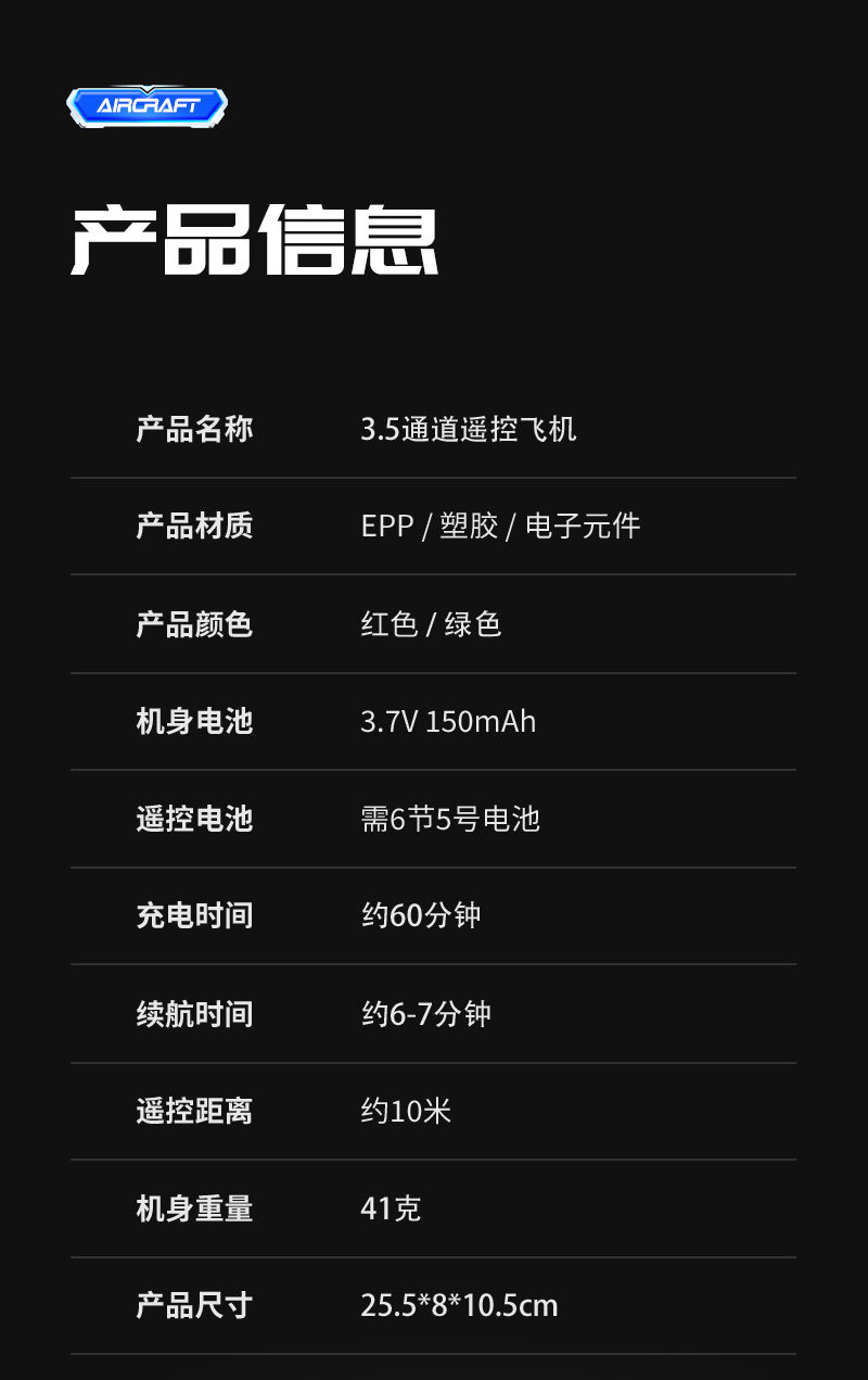 电池参数:机身:3.7V 150毫安 遥控器电池:6粒AAA电池(需自购)