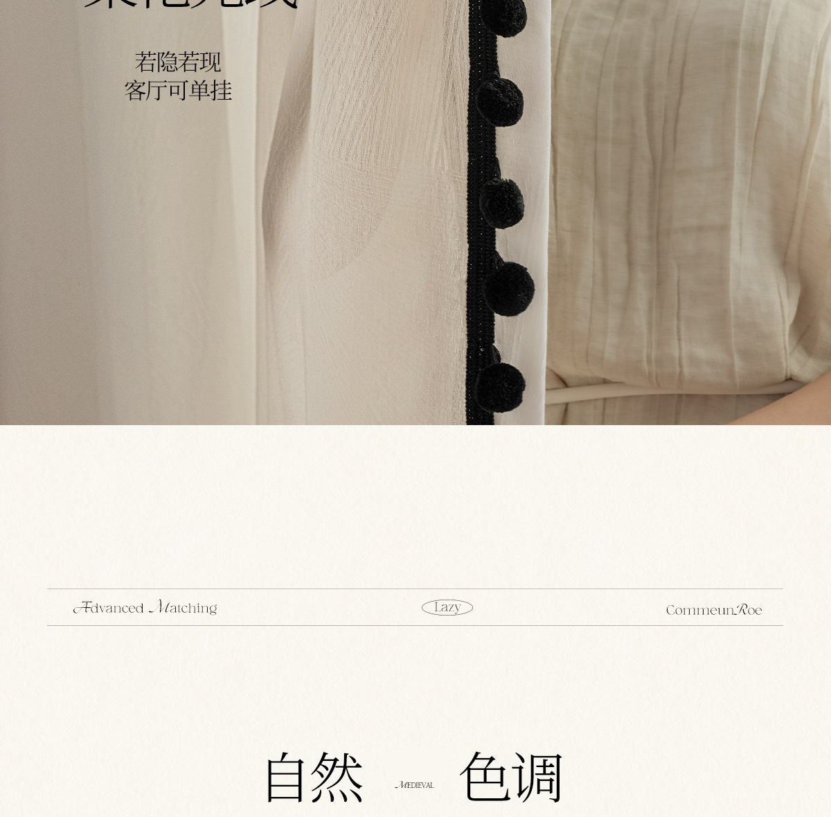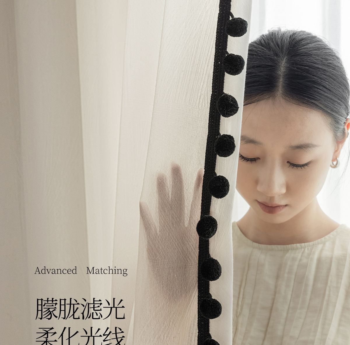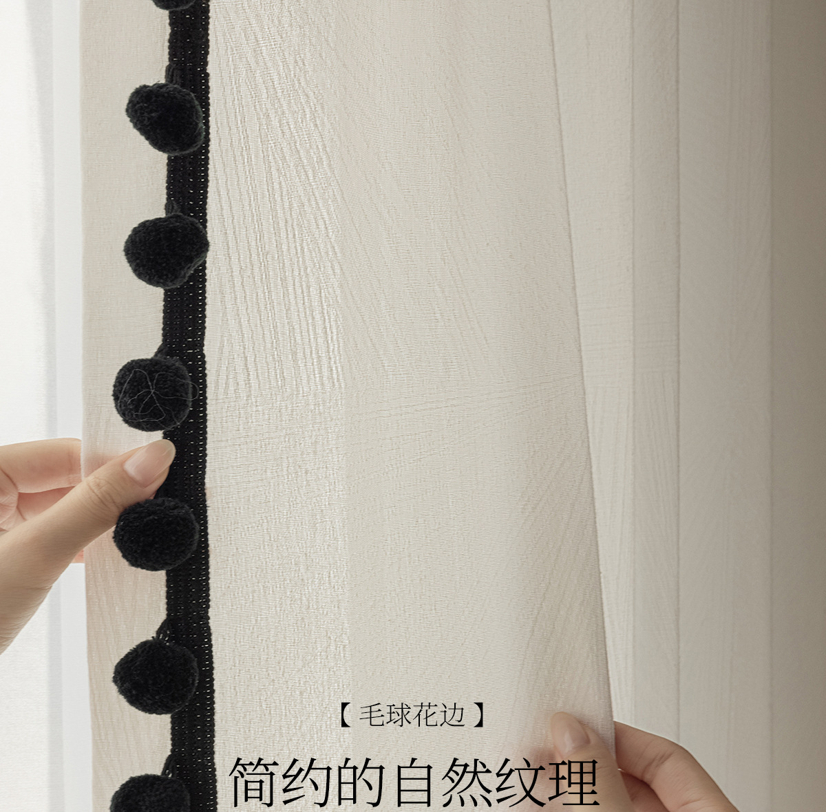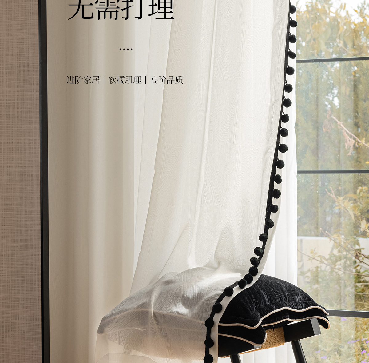검은색 모피 공이 있는 잎 자카드 원사, 바람이 많이 부는 흰색 원사 커튼, 거실 발코니, 침실 홈 장식, 미적 창문 스크린