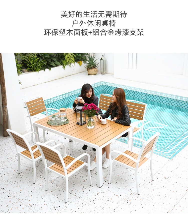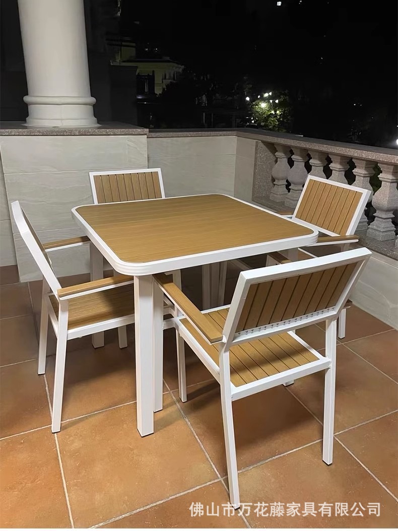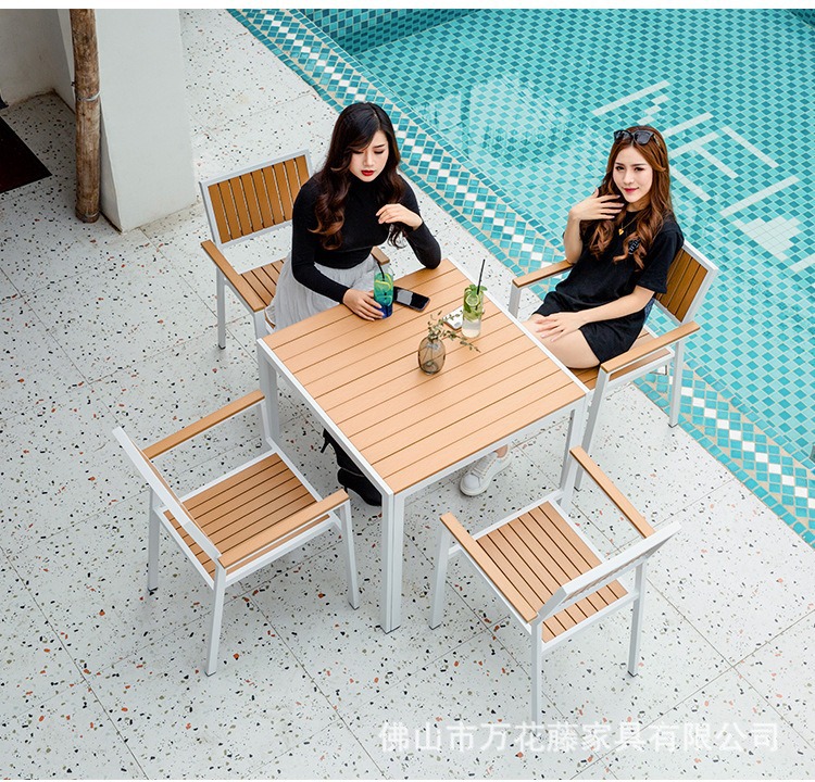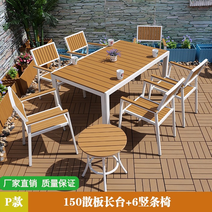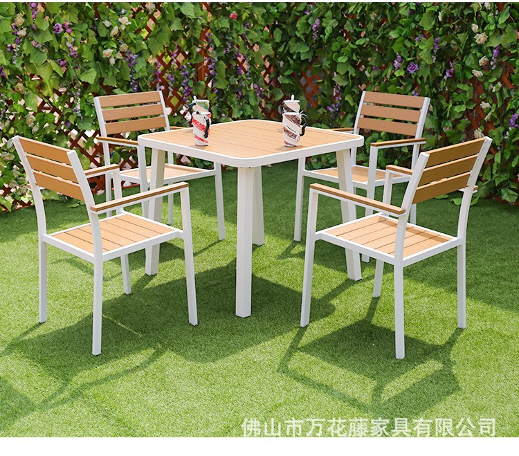 야외 플라스틱 목재 테이블과 의자 커피숍 야외 레저 식탁 안뜰 호텔 테라스 부식 방지 목재 발코니 테이블과 의자 조합스토어 가기