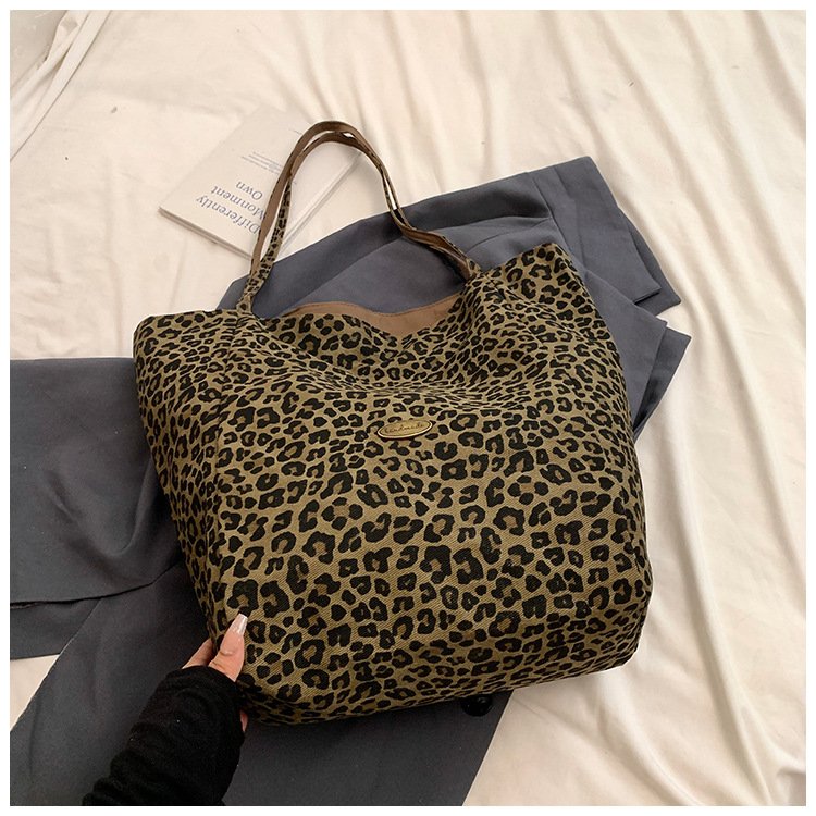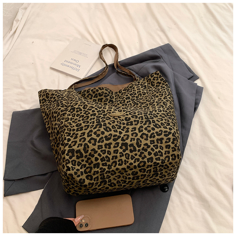 한국 레오파드 프린트 캔버스 가방 여성의 새로운 패션 대학 스타일 토트 백 캐주얼 대용량 겨드랑이 양면 숄더백