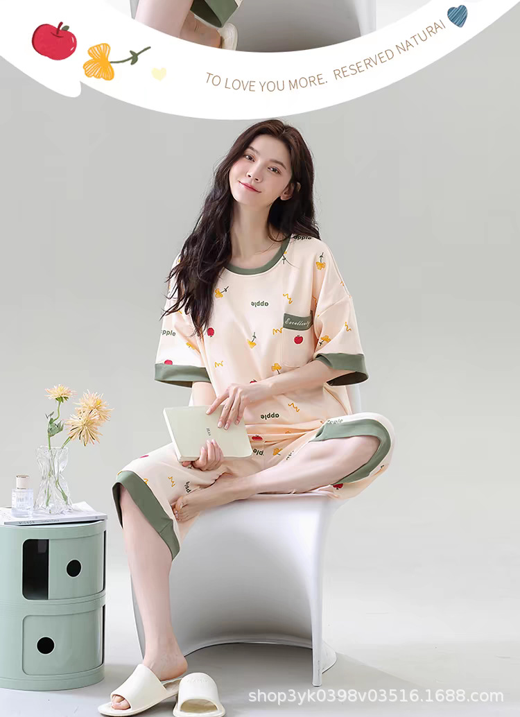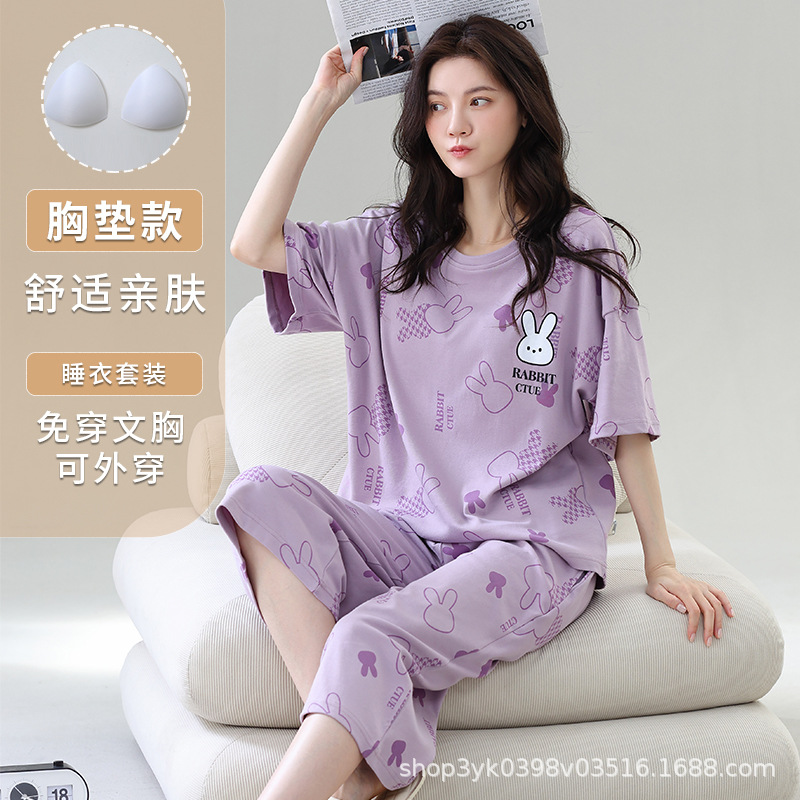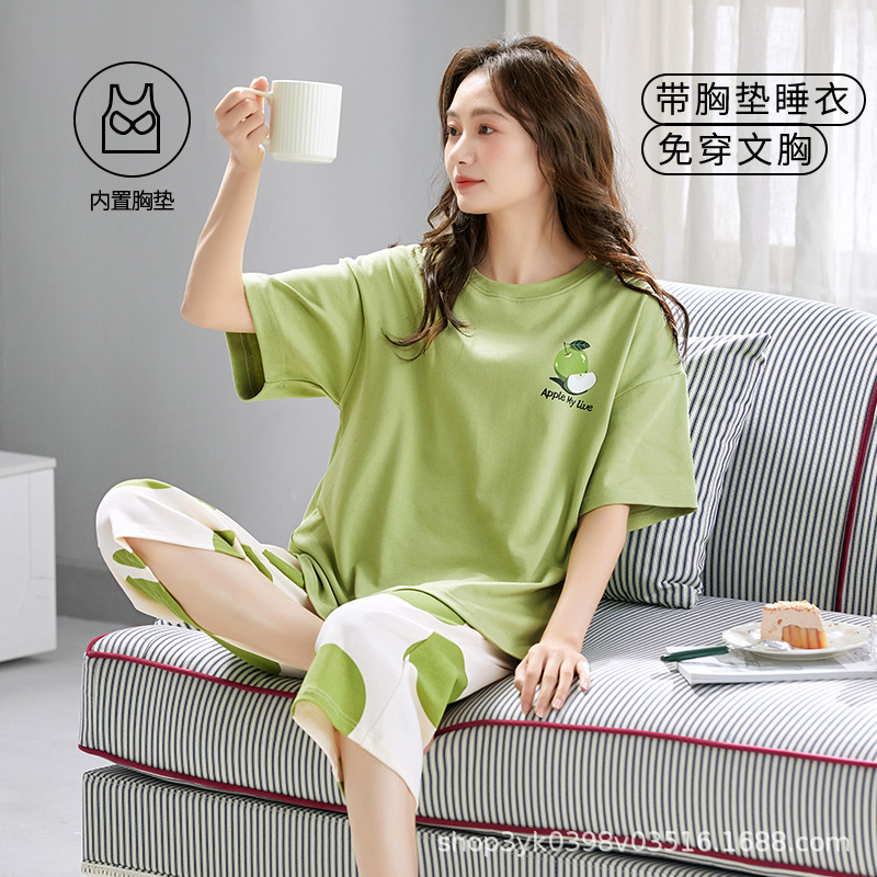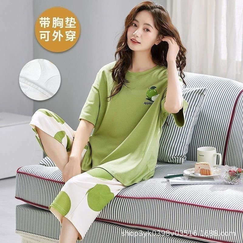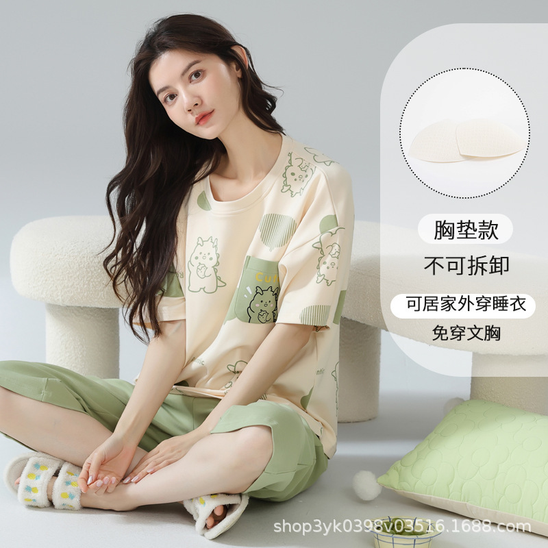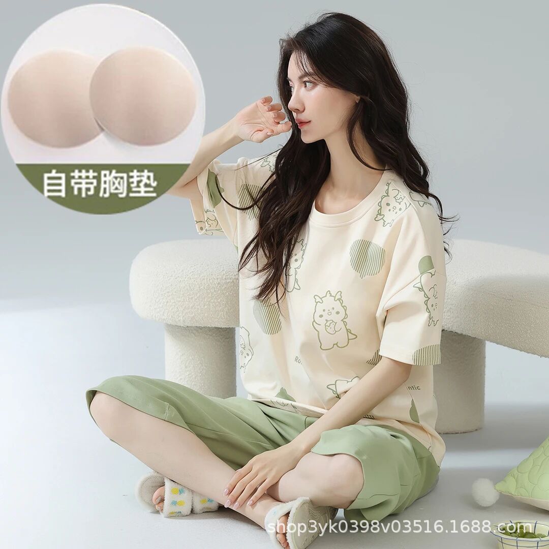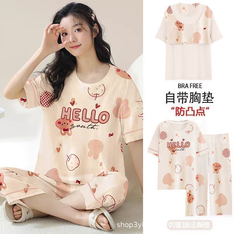 2025년 여름 신작 여성 잠옷, 라운드넥 크롭 팬츠, 가슴 패드, 외부에서 착용 가능한 달콤한 반팔 홈웨어스토어 가기