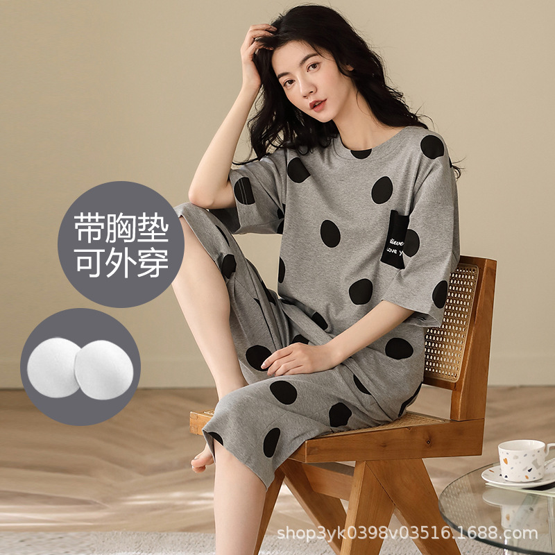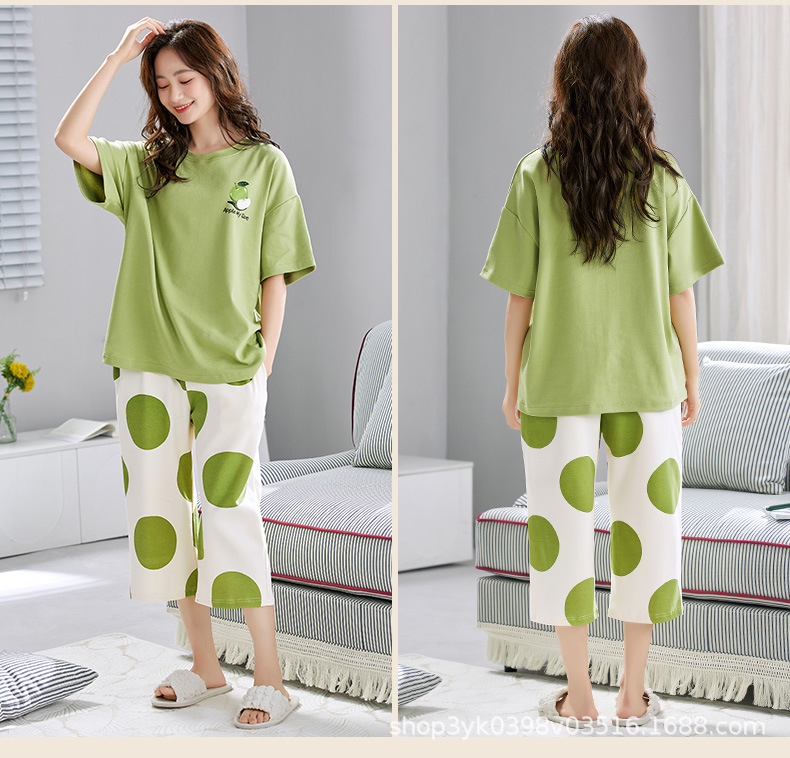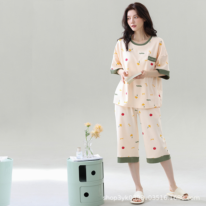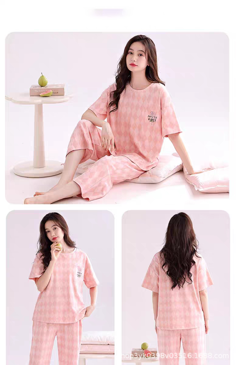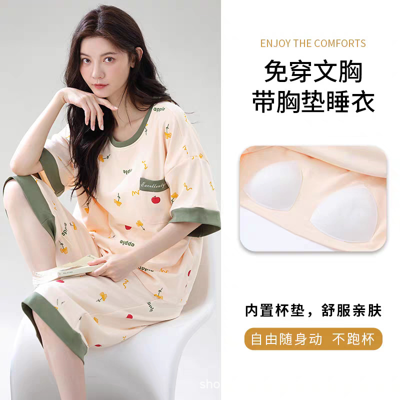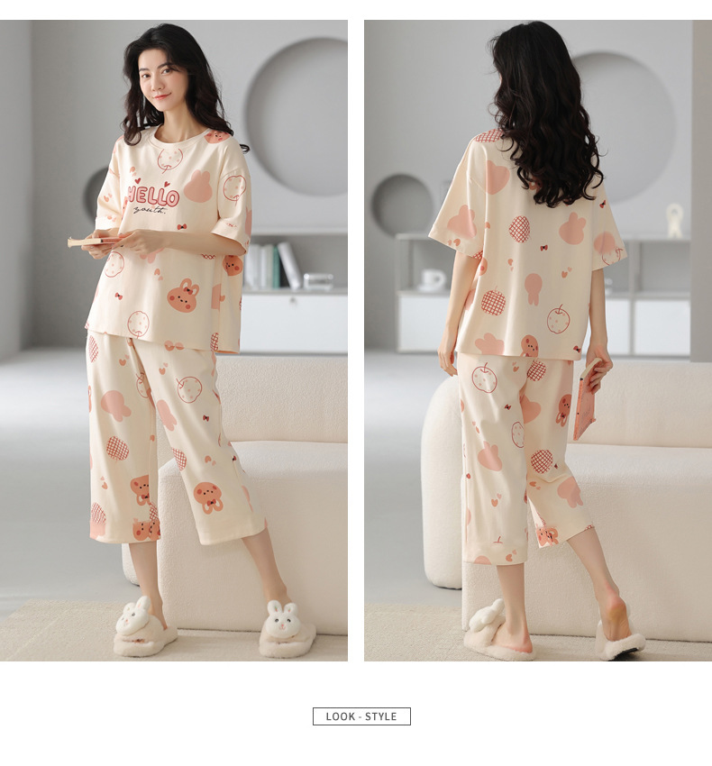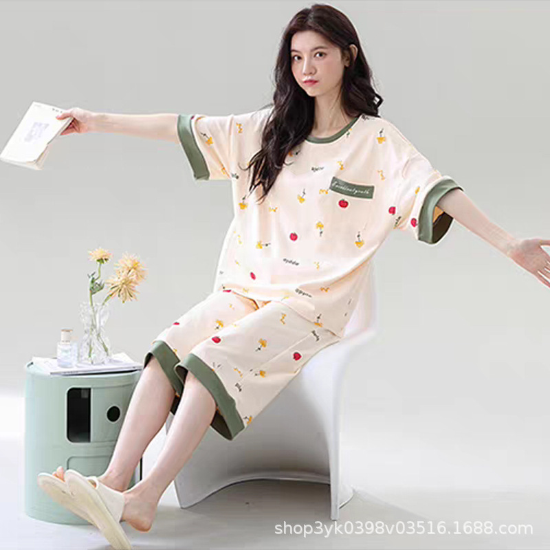 2025년 여름 신작 여성 잠옷, 라운드넥 크롭 팬츠, 가슴 패드, 외부에서 착용 가능한 달콤한 반팔 홈웨어스토어 가기