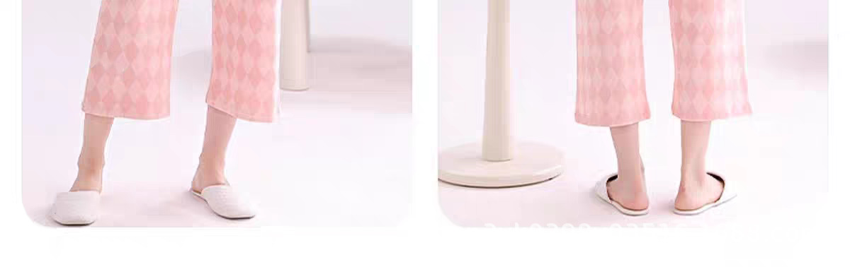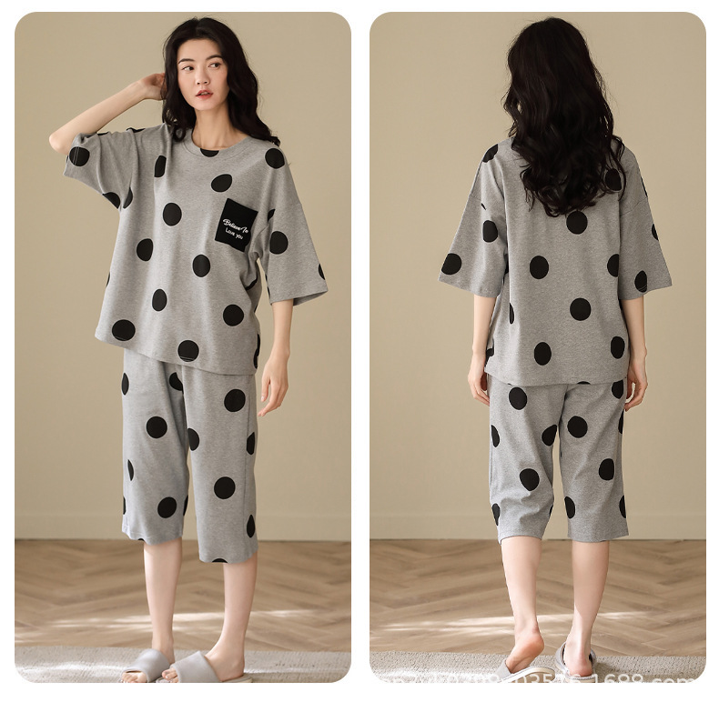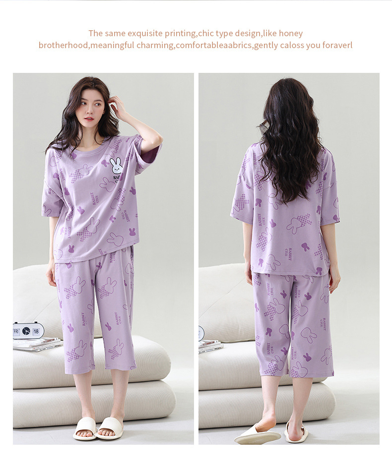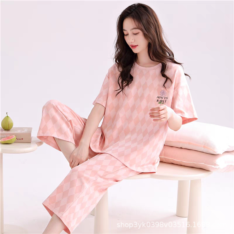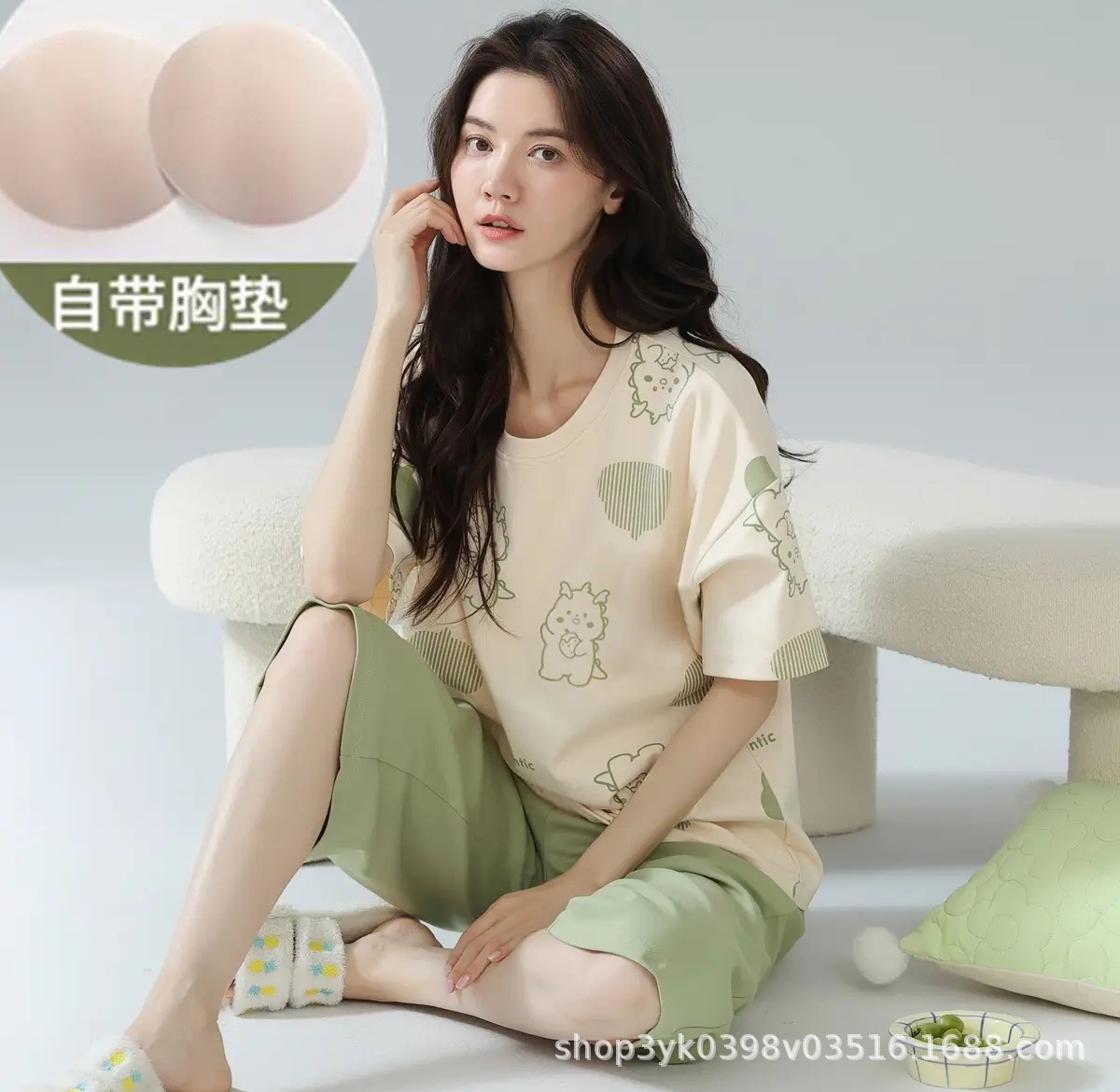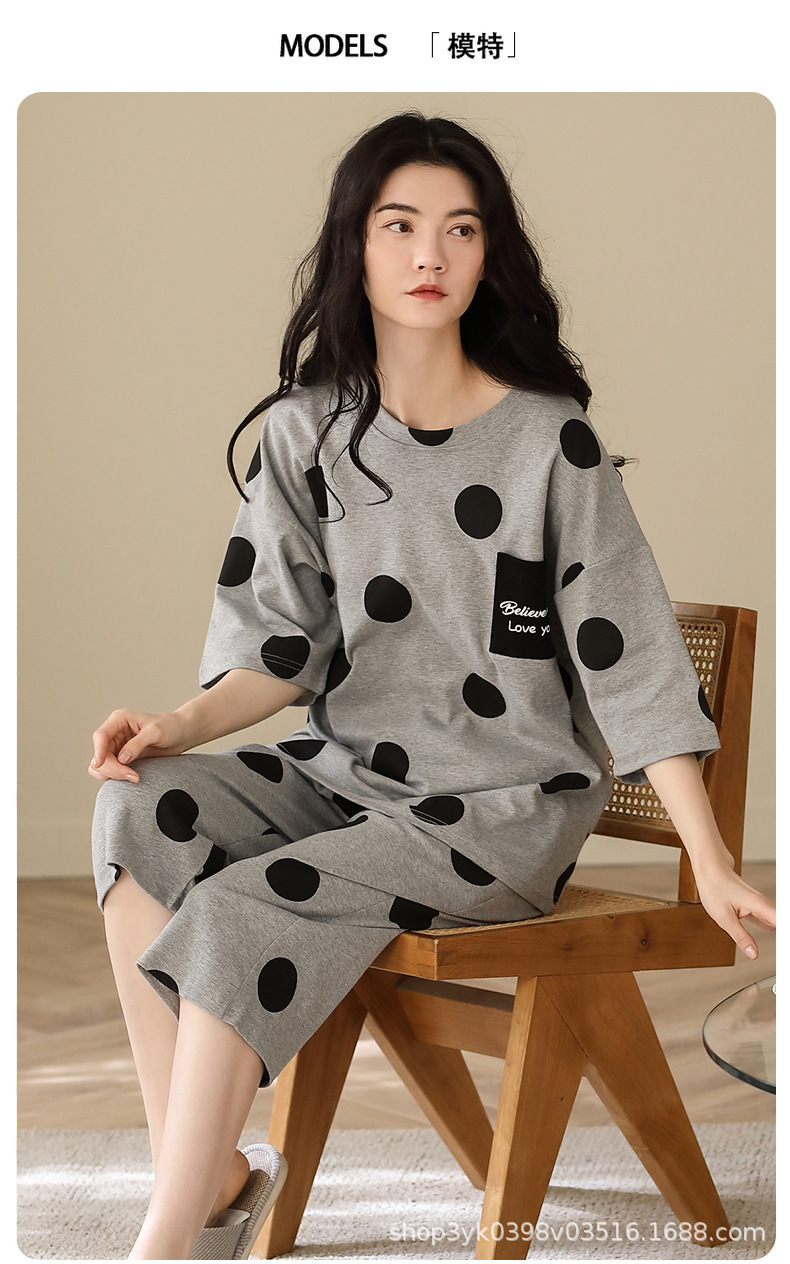 2025년 여름 신작 여성 잠옷, 라운드넥 크롭 팬츠, 가슴 패드, 외부에서 착용 가능한 달콤한 반팔 홈웨어스토어 가기