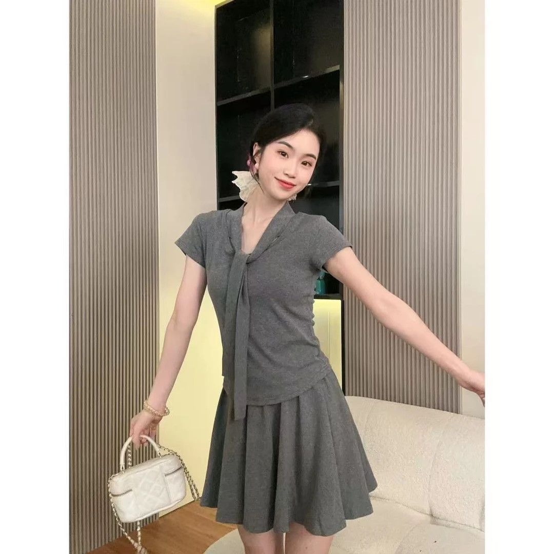여성을위한 대학 스타일 주름 짧은 치마 정장 여름 슬리밍 탑 반팔 연령 감소 패션 캐주얼 투피스 세트스토어 가기