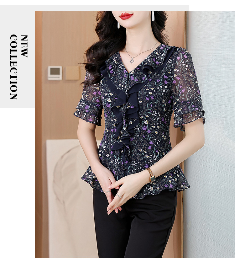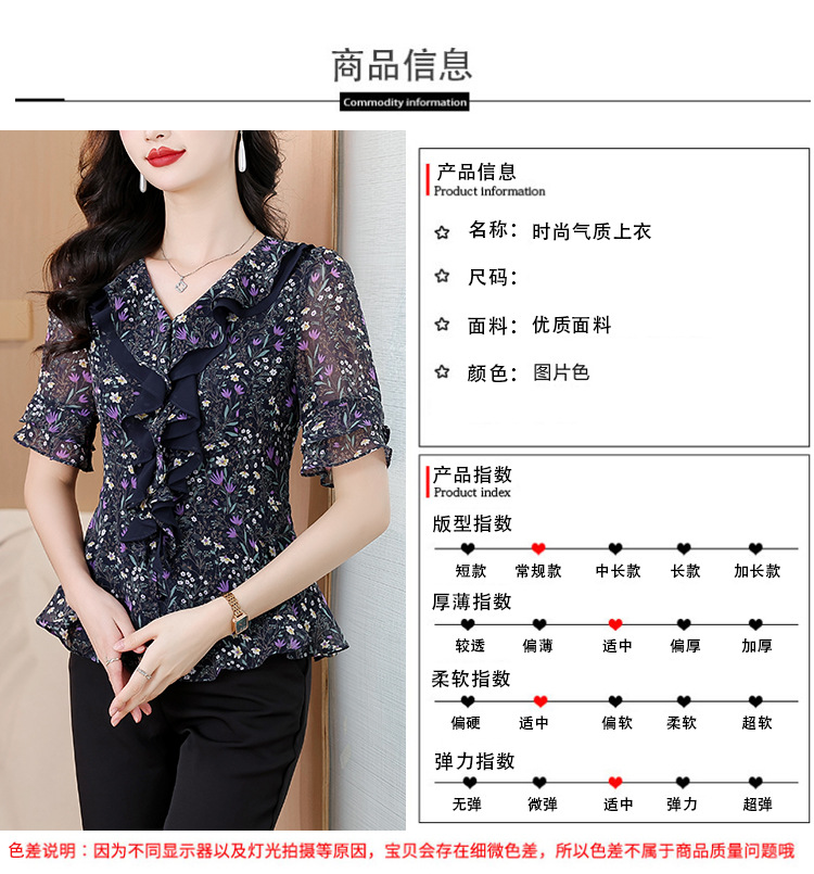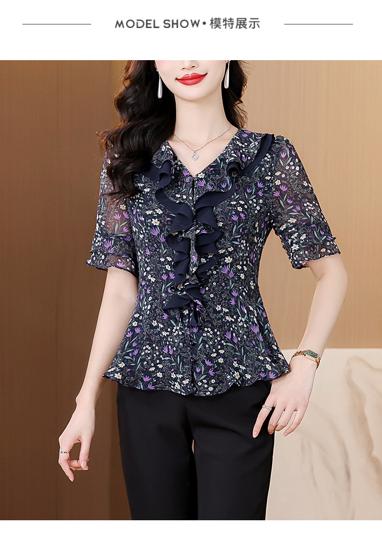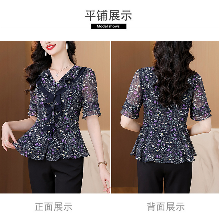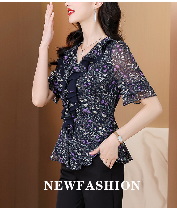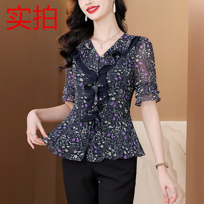 유럽 스테이션 2025 여름 프린트 쉬폰 셔츠 탑 여성용 러플 슬리밍 바디 커버 셔츠 시크 셔츠스토어 가기