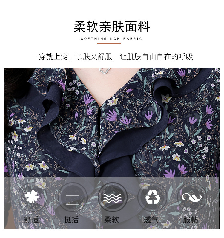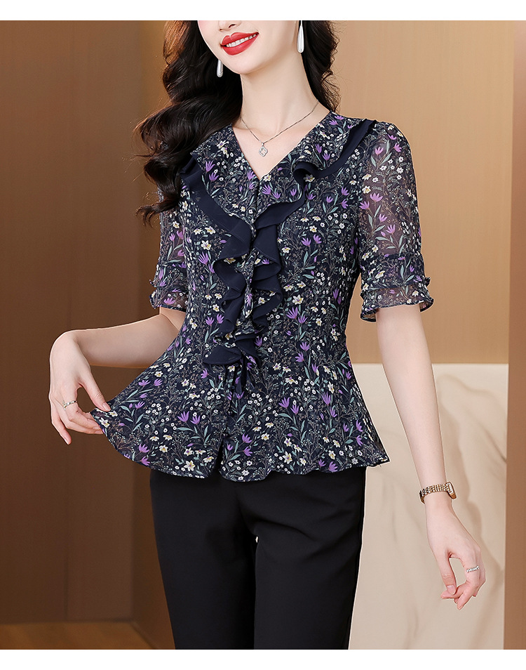 유럽 스테이션 2025 여름 프린트 쉬폰 셔츠 탑 여성용 러플 슬리밍 바디 커버 셔츠 시크 셔츠