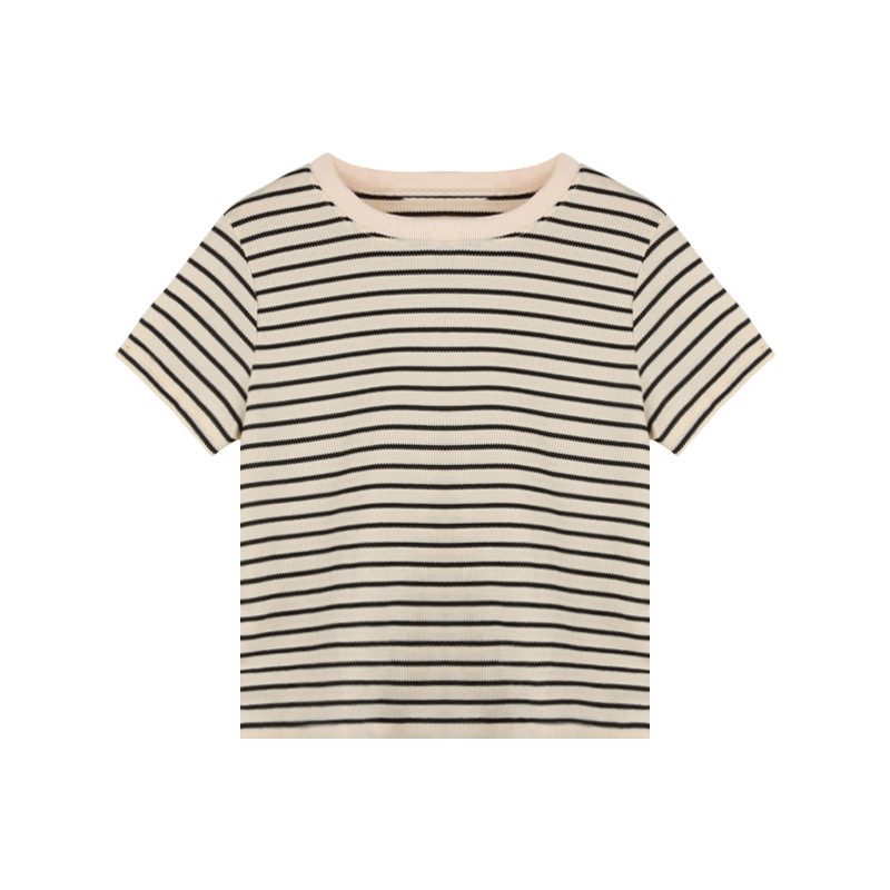 레트로 스트라이프 반팔 티셔츠 여성 디자인 라운드 넥 바닥 셔츠 2025 여름 루즈 캐주얼 학생 탑 트렌디스토어 가기