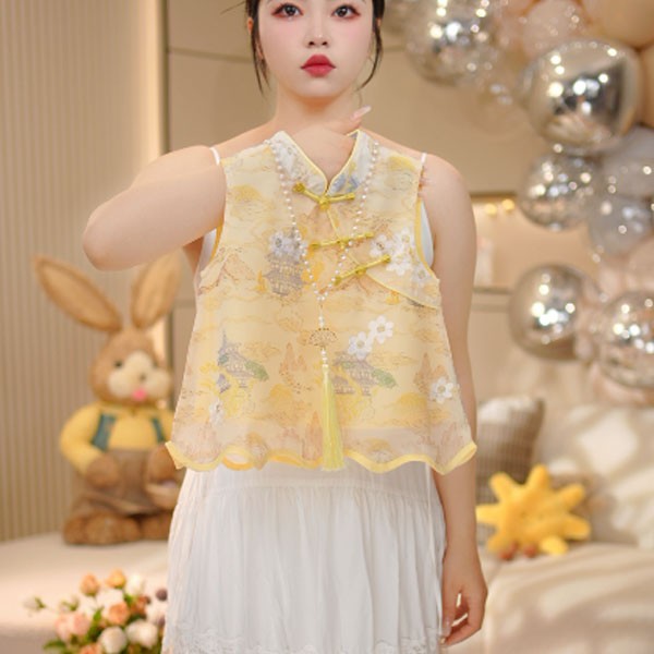 2025 새로운 여자 중국 스타일 얇은 양복 여름 새로운 중국 스타일 민소매 탑과 바지 유행 어린이 투피스 세트스토어 가기