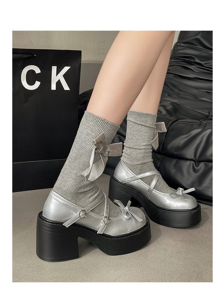 대외 무역 도매 2024 새로운 일본식 jk 프랑스 스타일 다목적 메리 제인 신발 여성용 나비 매듭 두꺼운 하이힐 작은 가죽 신발스토어 가기