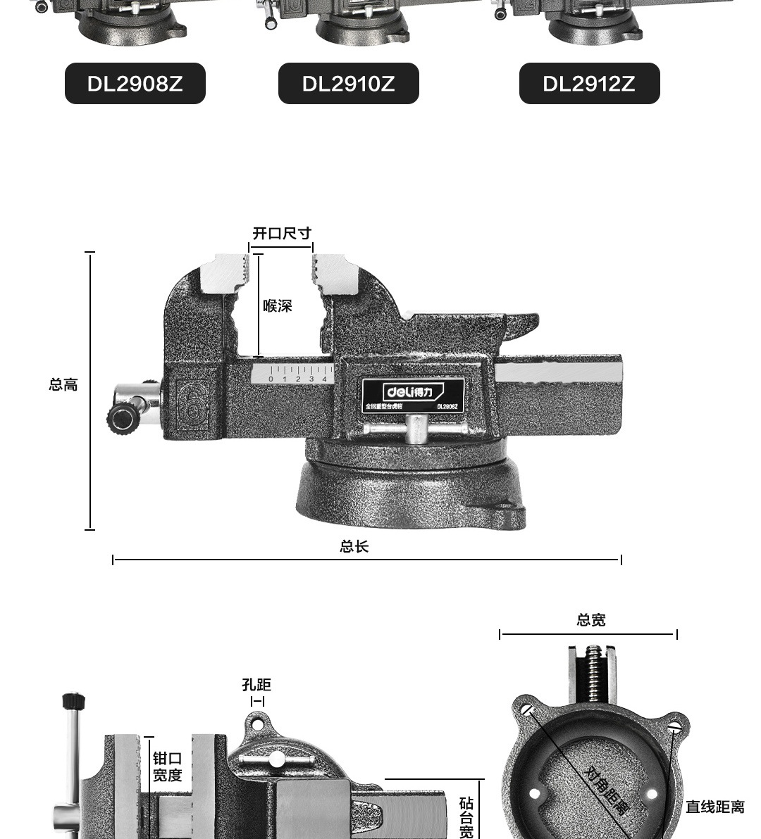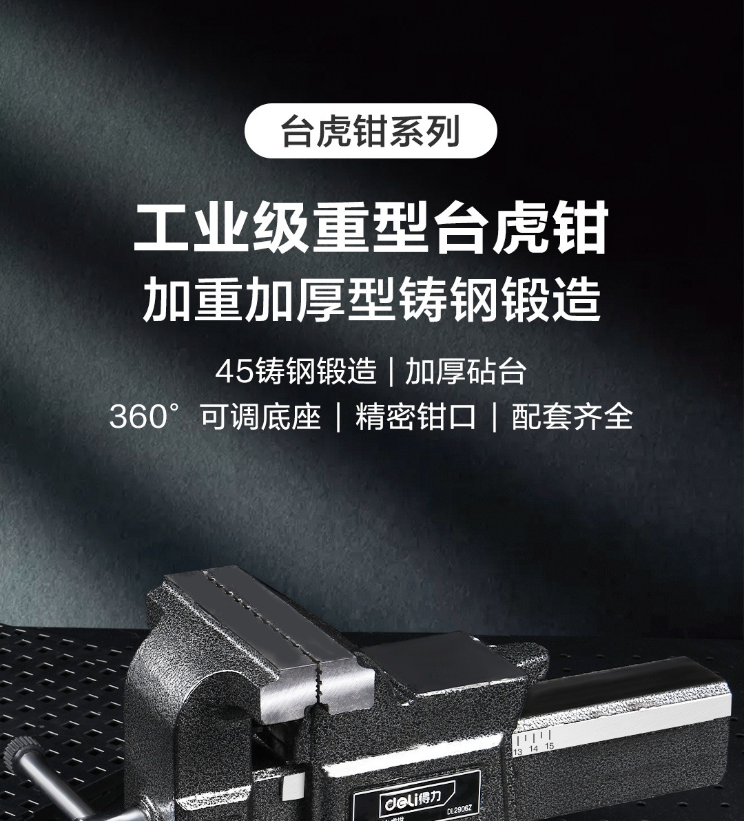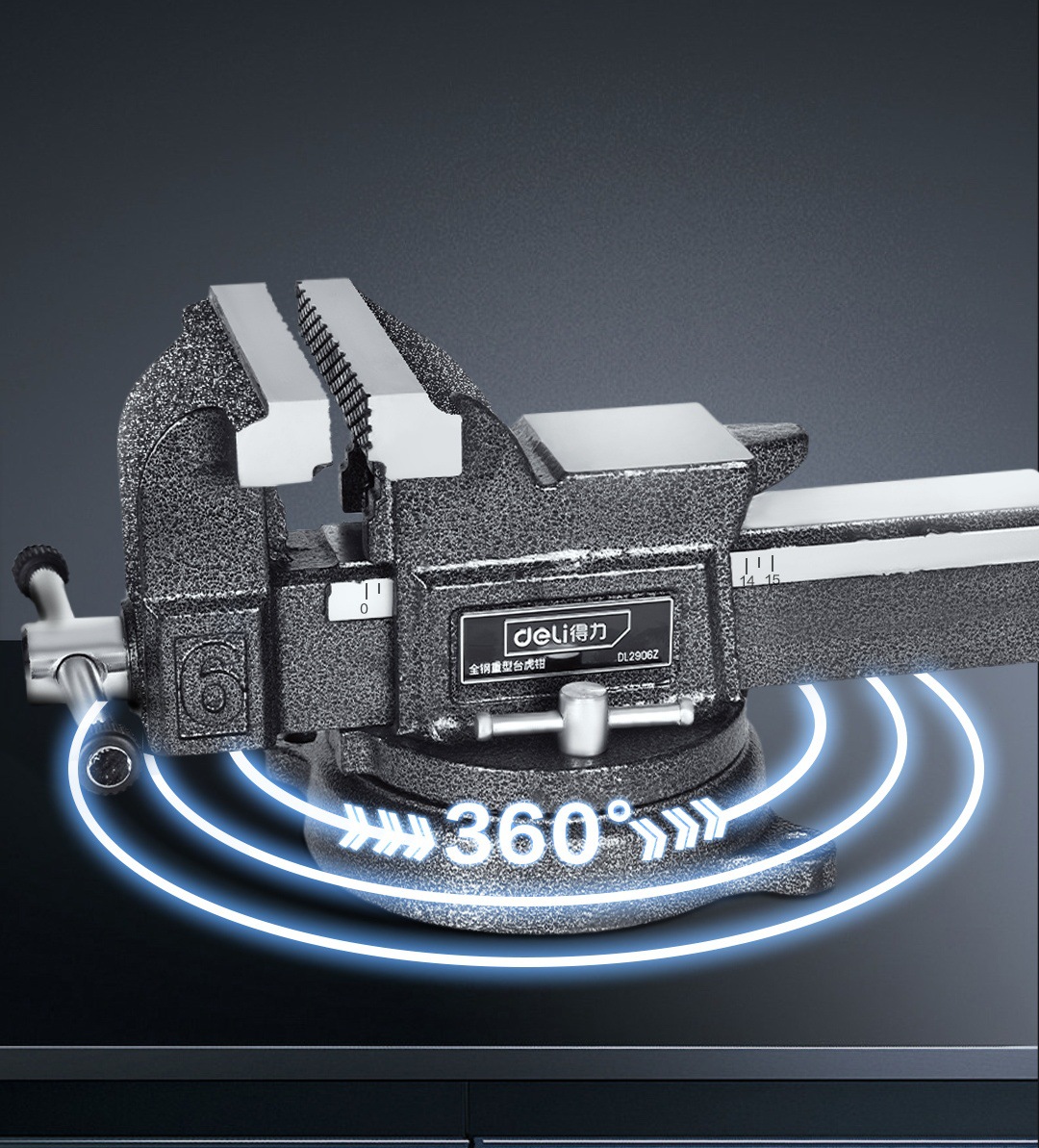 델리 산업용 등급 헤비듀티 테이블 바이스 45 주조 강철 단조 고경도 충격 저항 360 ° 회전식 DL2908Z