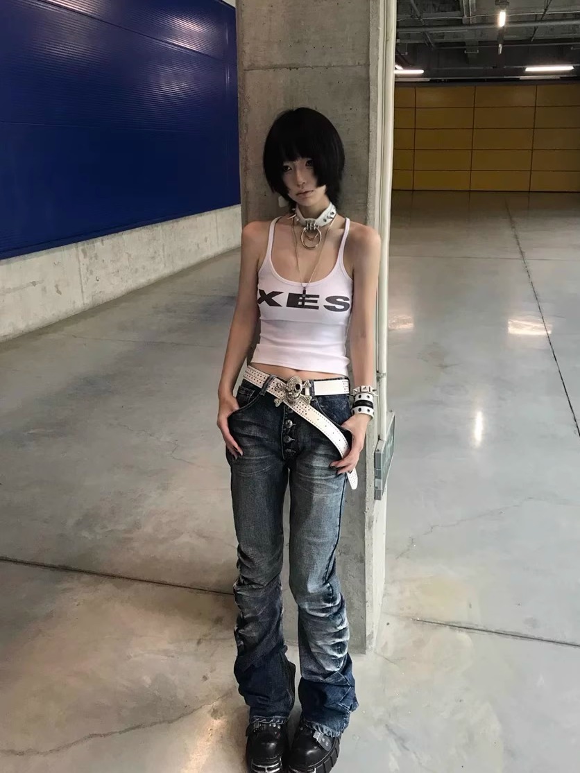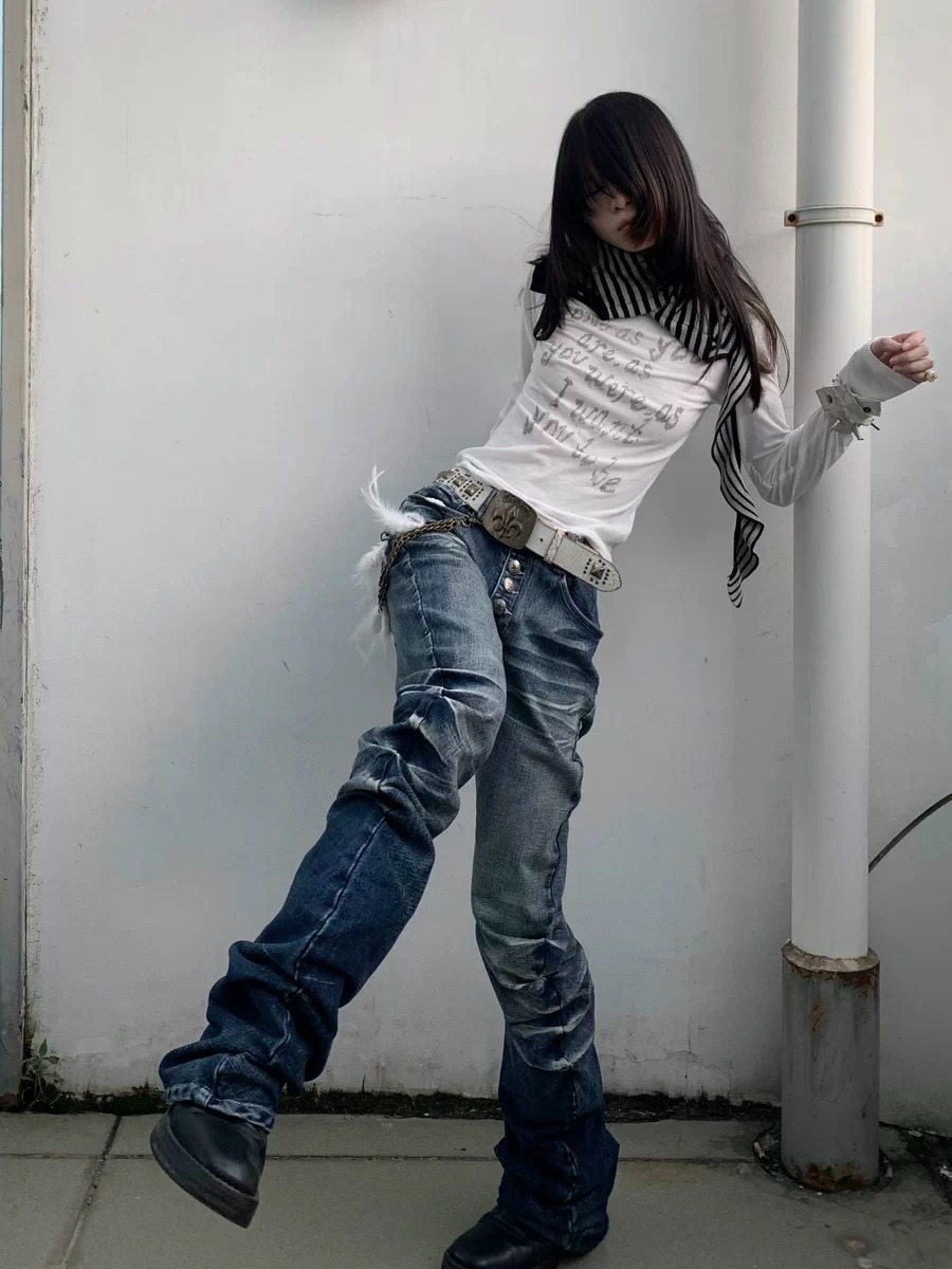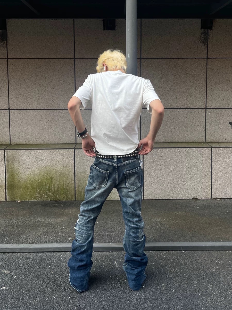 아이스 블루 크랙 워싱 입체 팬츠, 칼날 버전, 고탄성 미스트 블루 아메리칸 청바지, 남녀공용, 하이 스트리트, 다용도, 트렌디스토어 가기