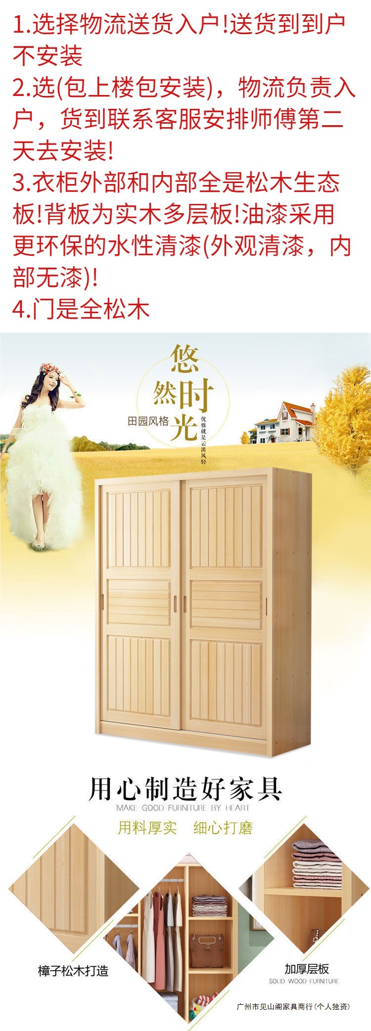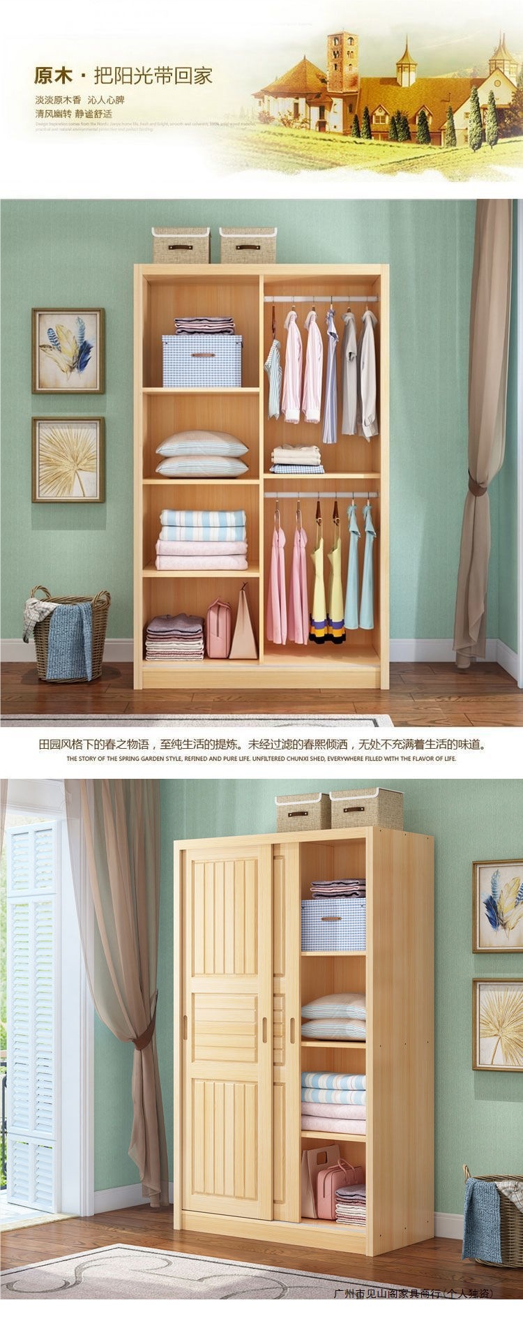 슬라이딩 도어 옷장 소나무 경제적 인 전체 단단한 나무 옷장 현대 간단한 임대 주택 슬라이딩 어린이 옷장스토어 가기