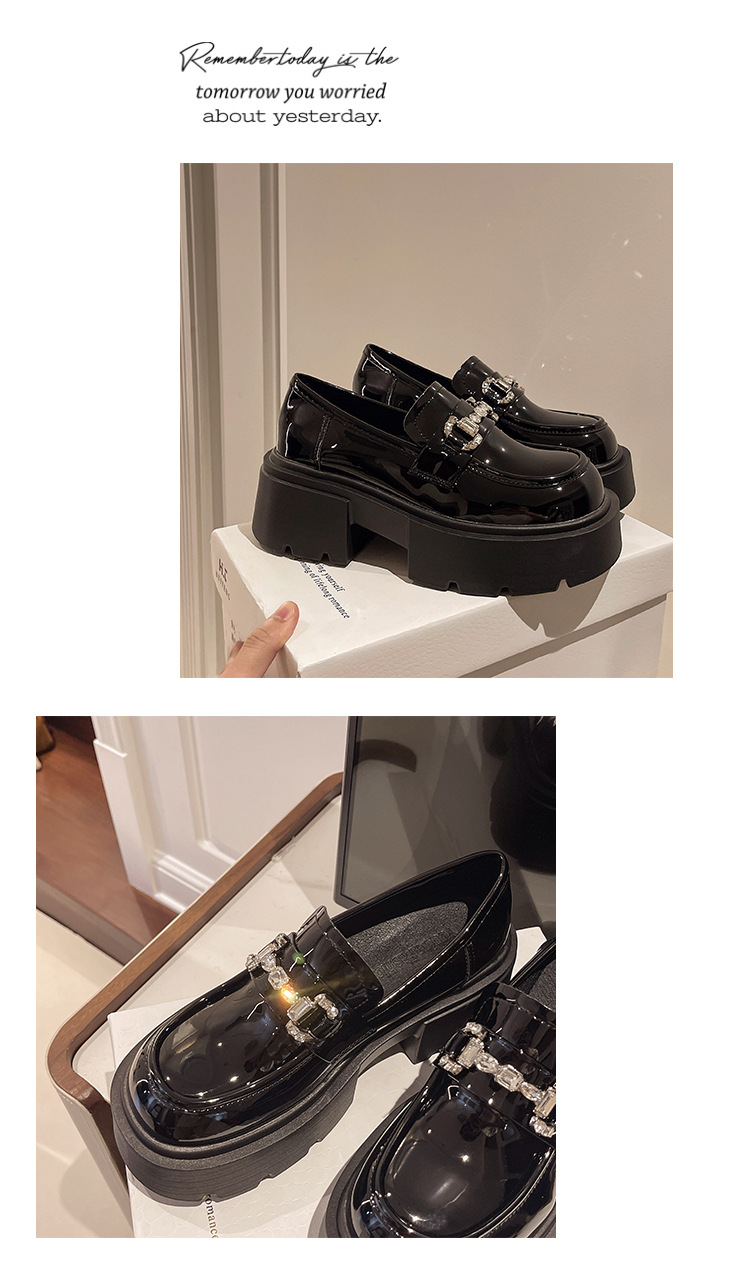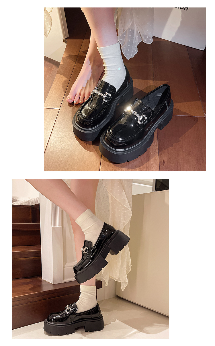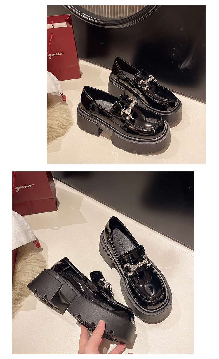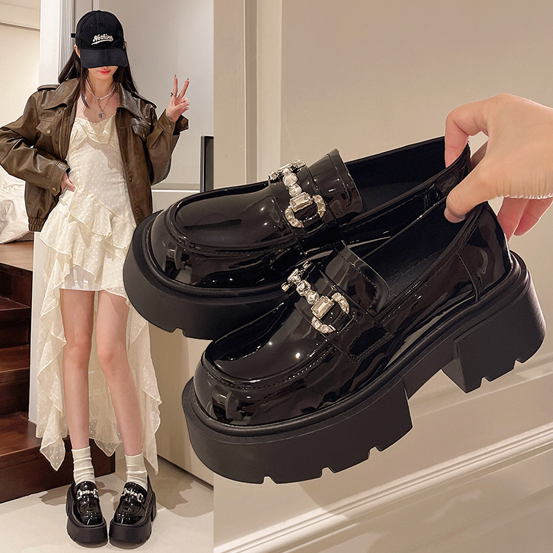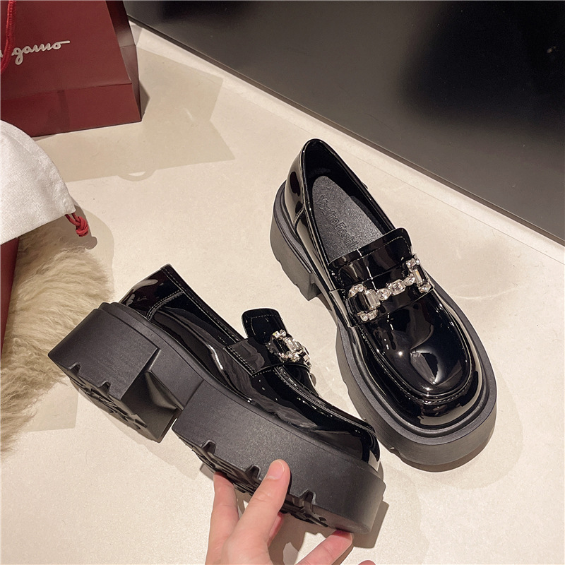 여성을위한 두꺼운 밑창 로퍼 2024 가을 새로운 다목적 프랑스 복고풍 하이힐 라인 석 블랙 영국 스타일 작은 가죽 신발스토어 가기