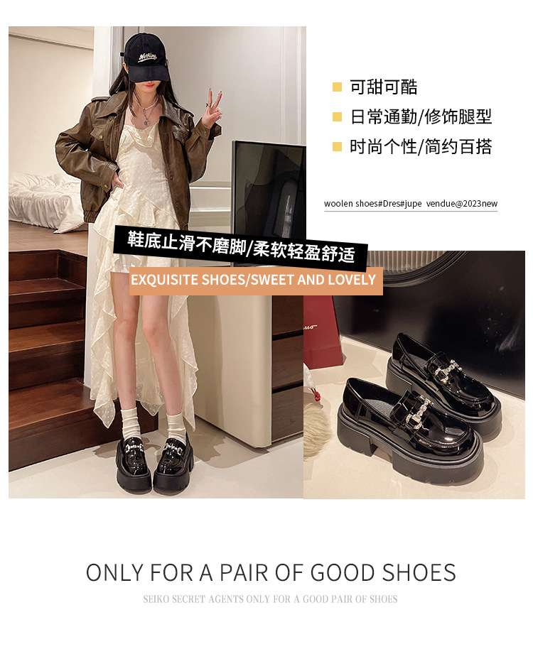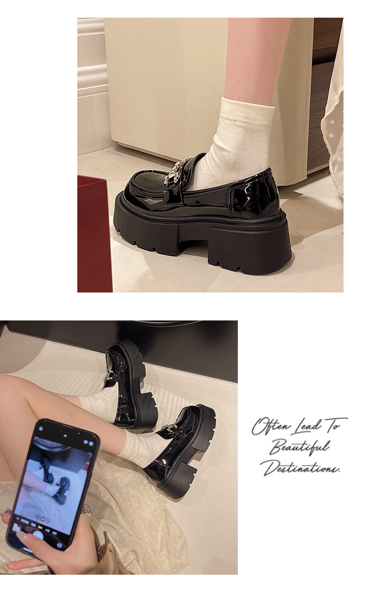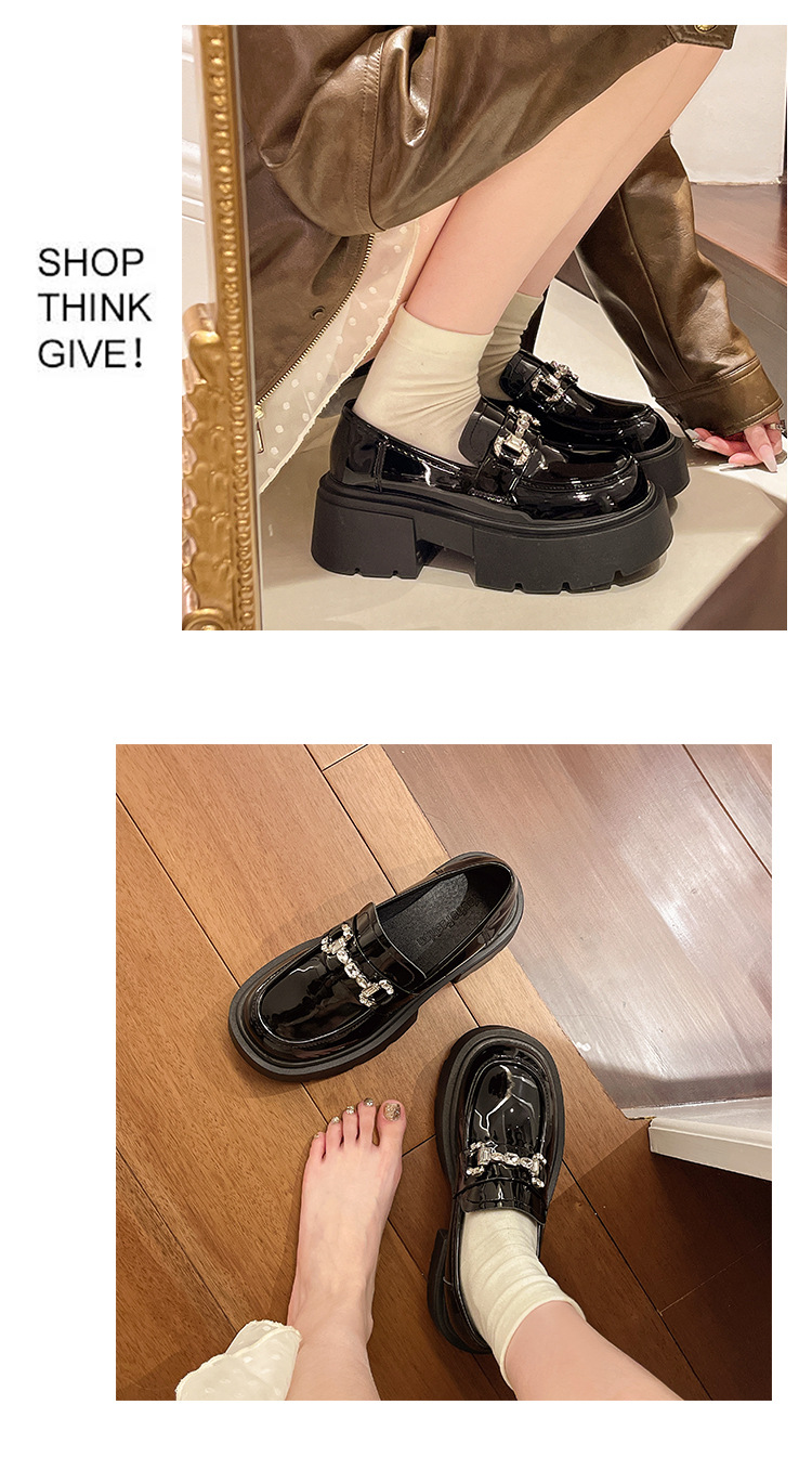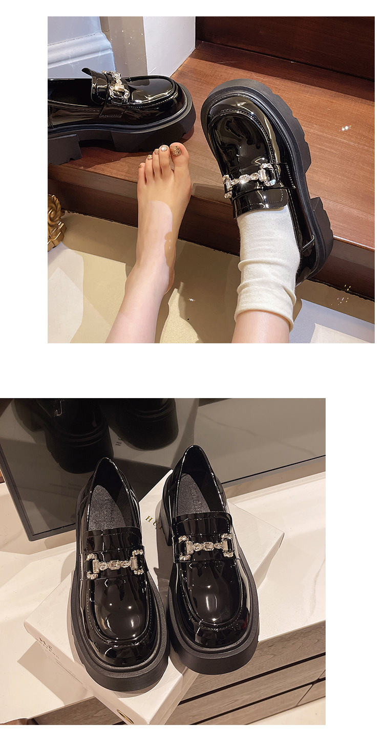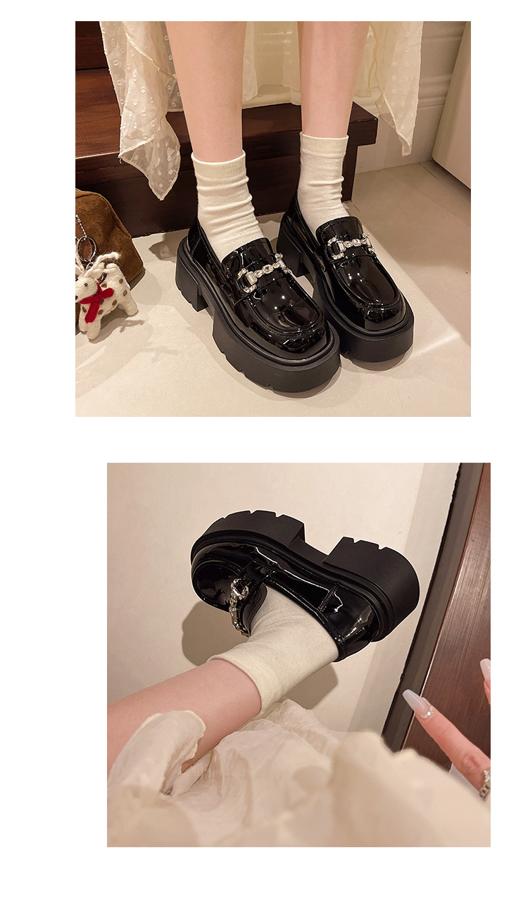 여성을위한 두꺼운 밑창 로퍼 2024 가을 새로운 다목적 프랑스 복고풍 하이힐 라인 석 블랙 영국 스타일 작은 가죽 신발스토어 가기